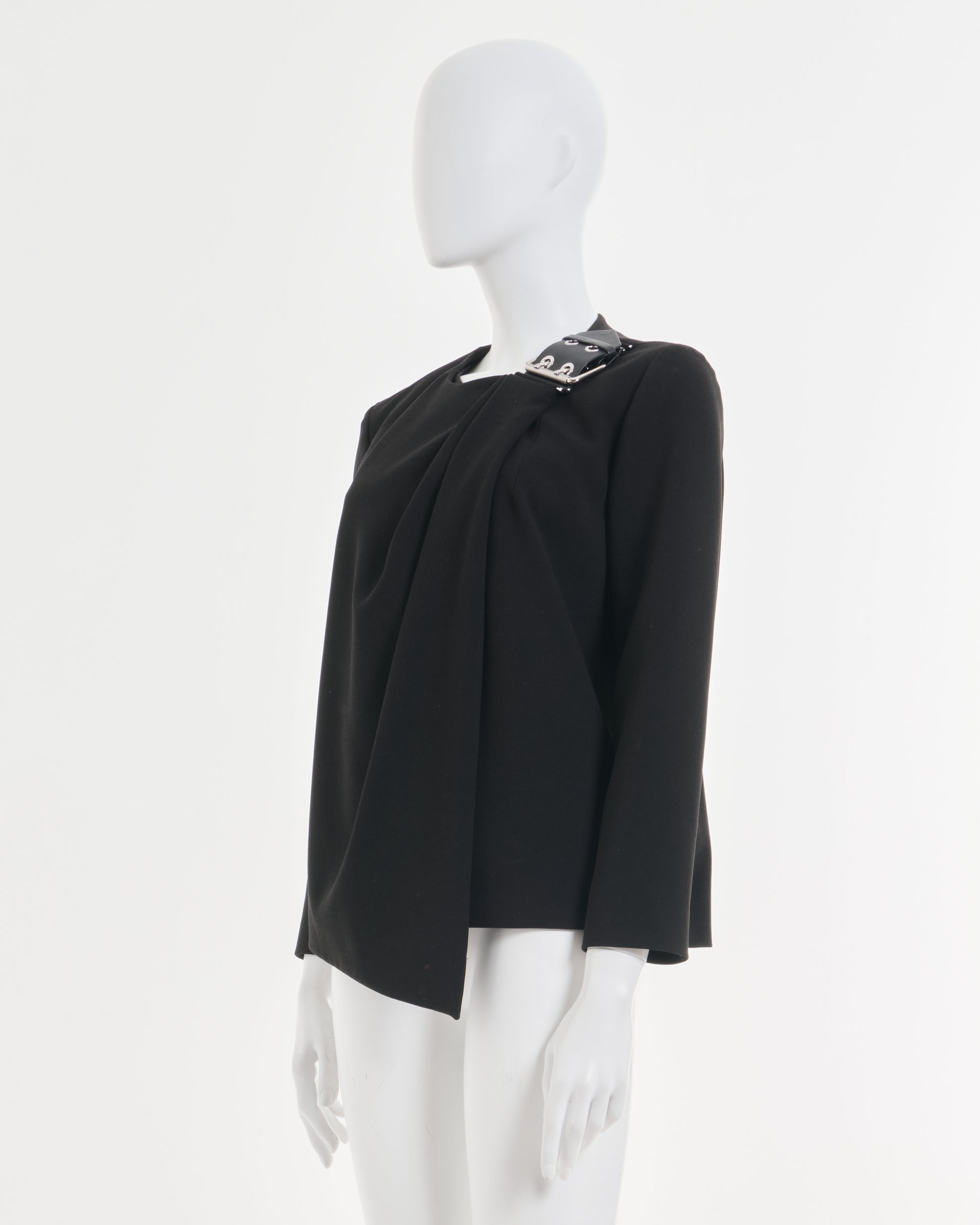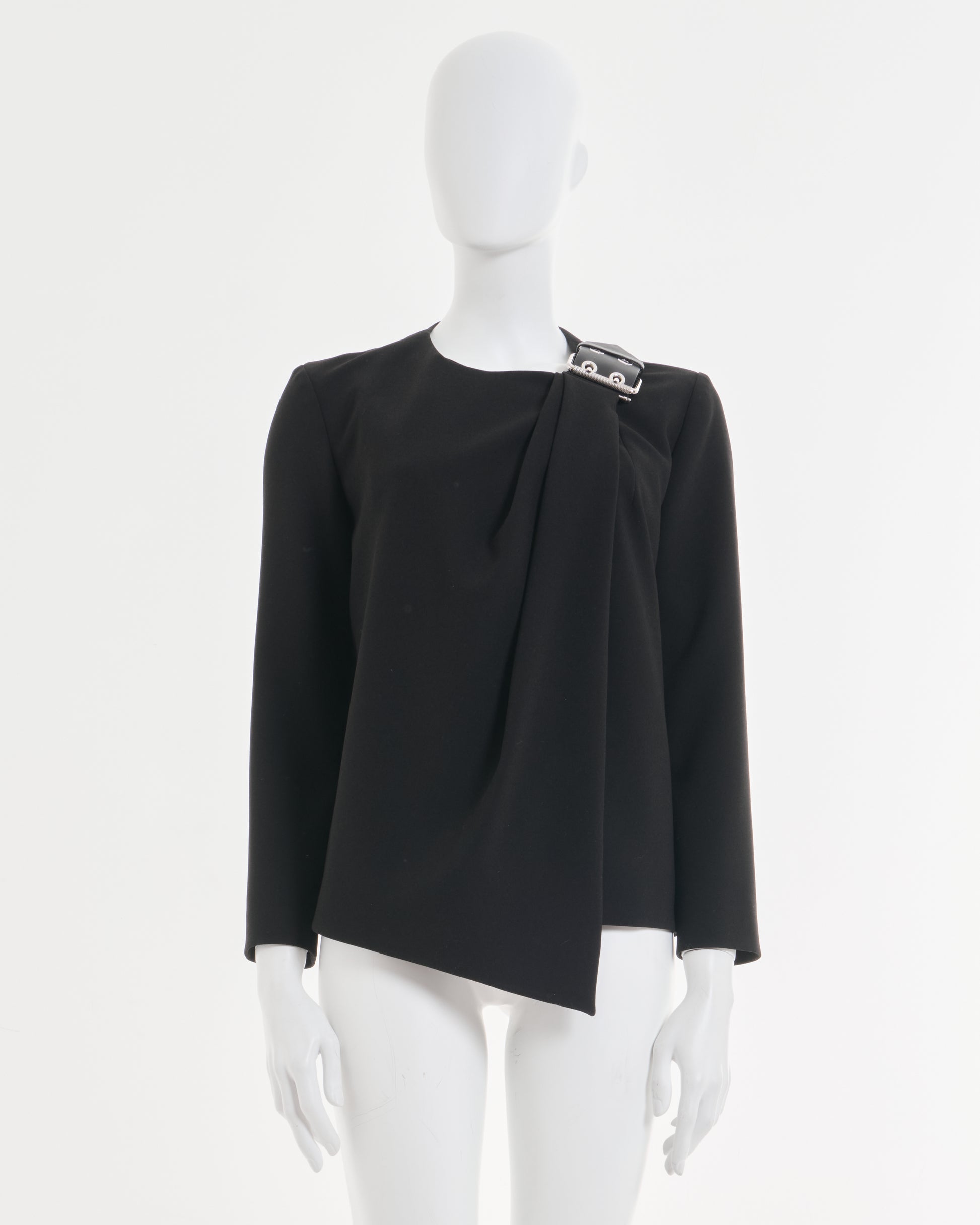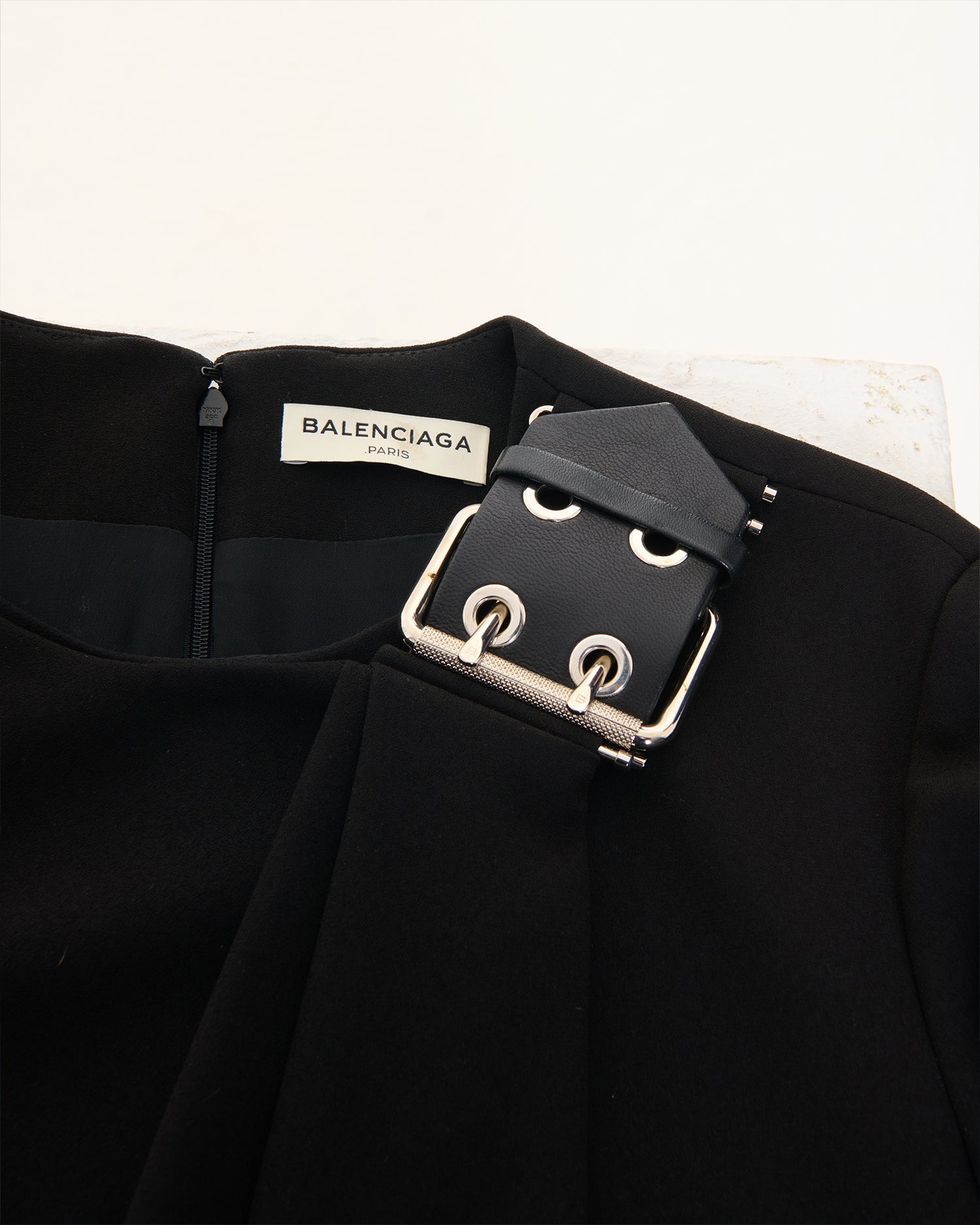 - Leather Buckle on Left Shoulder as a Fake Closure