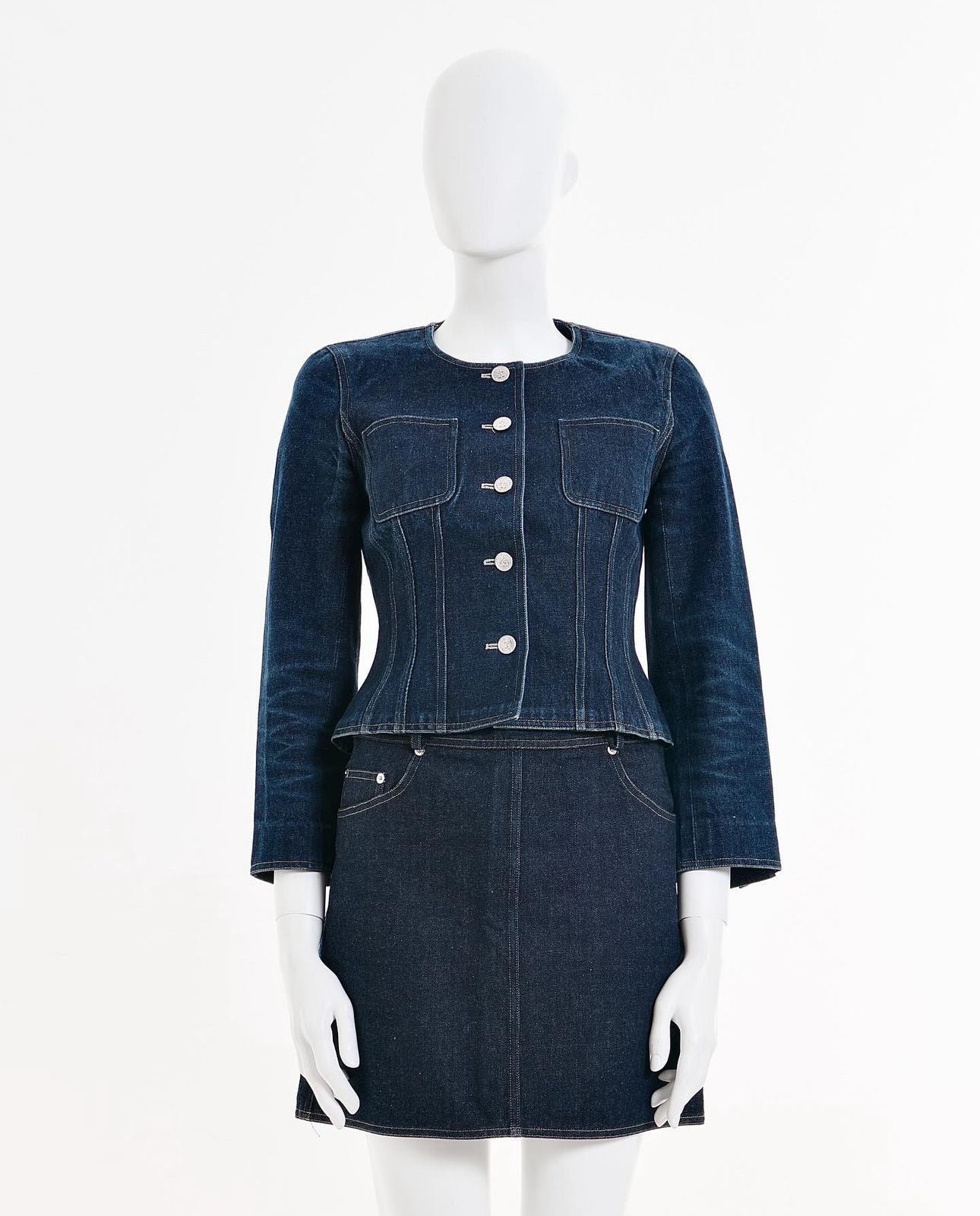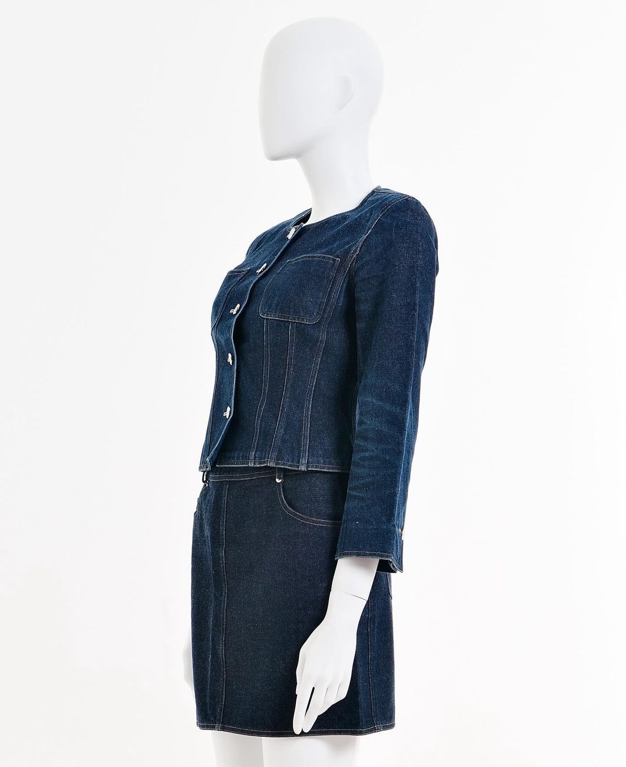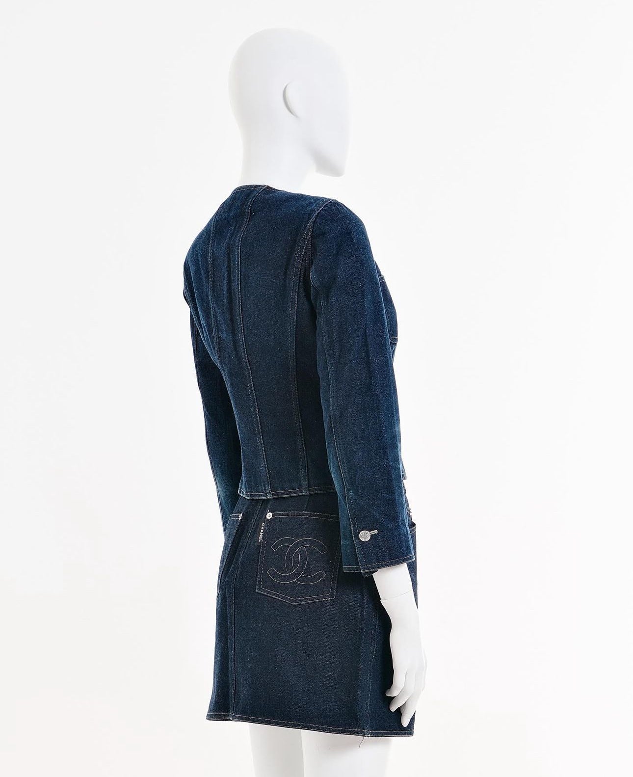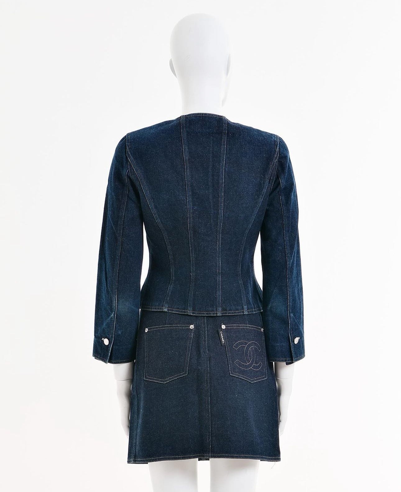 - Chanel setup suit collarless jacket and skirt denim indigo