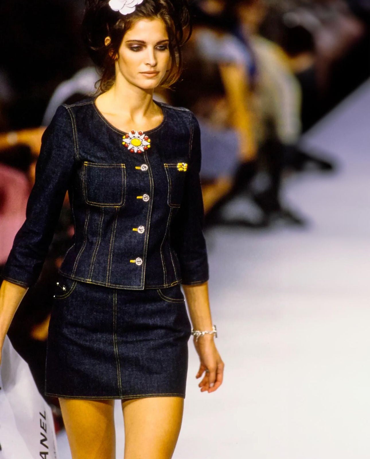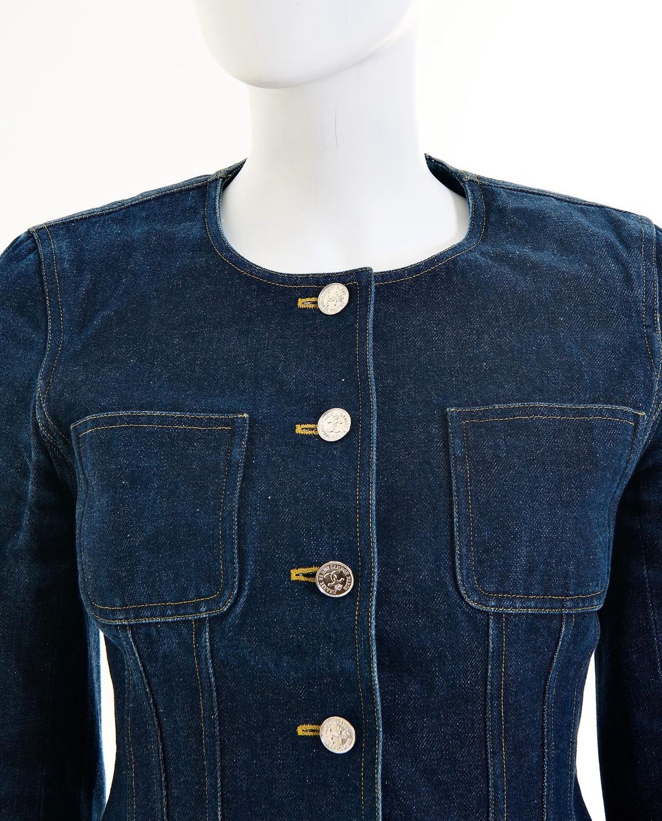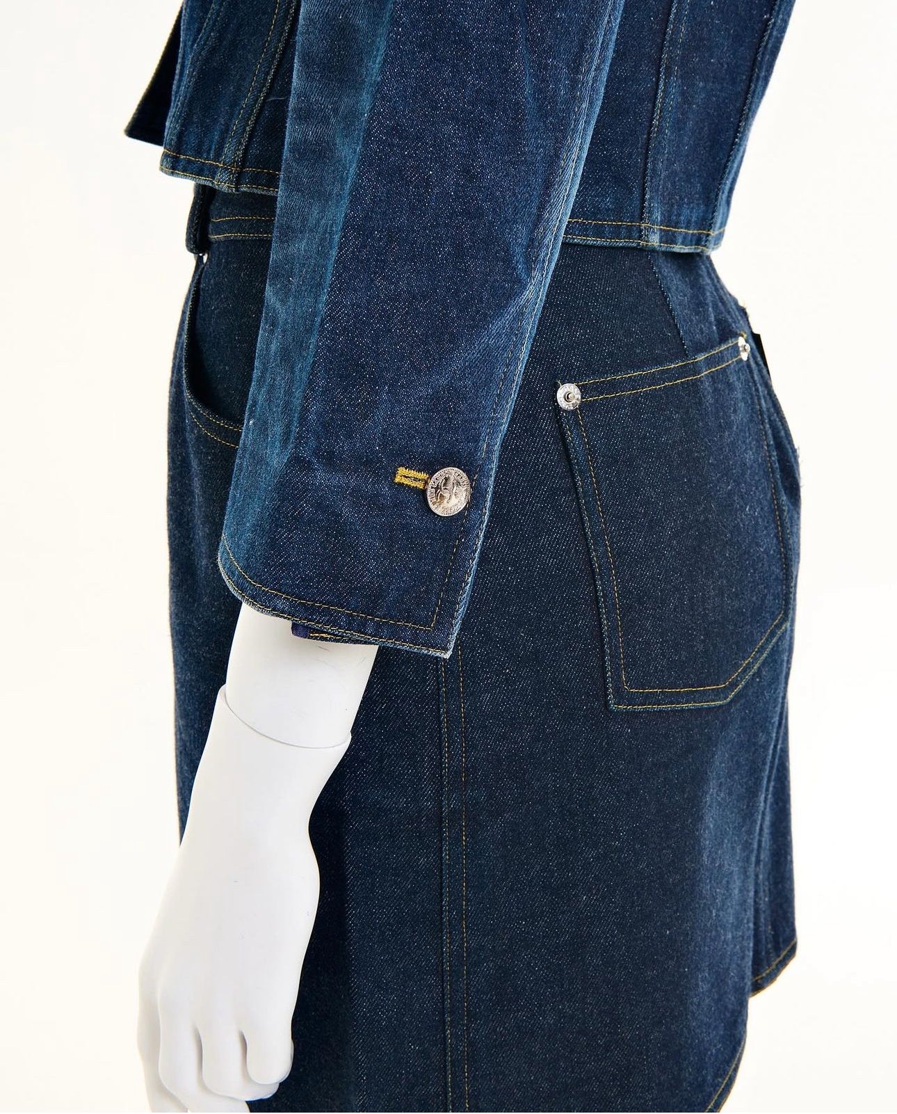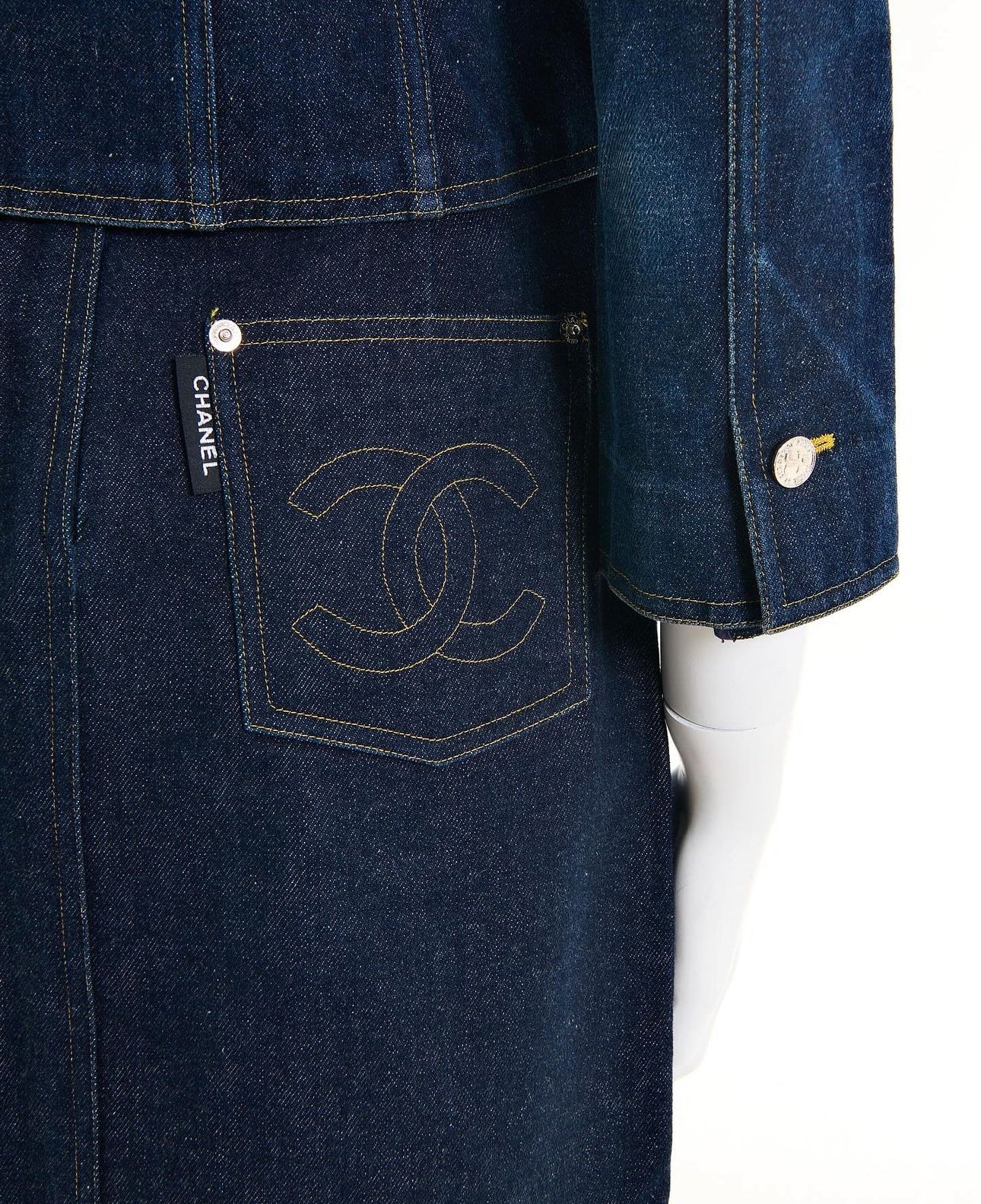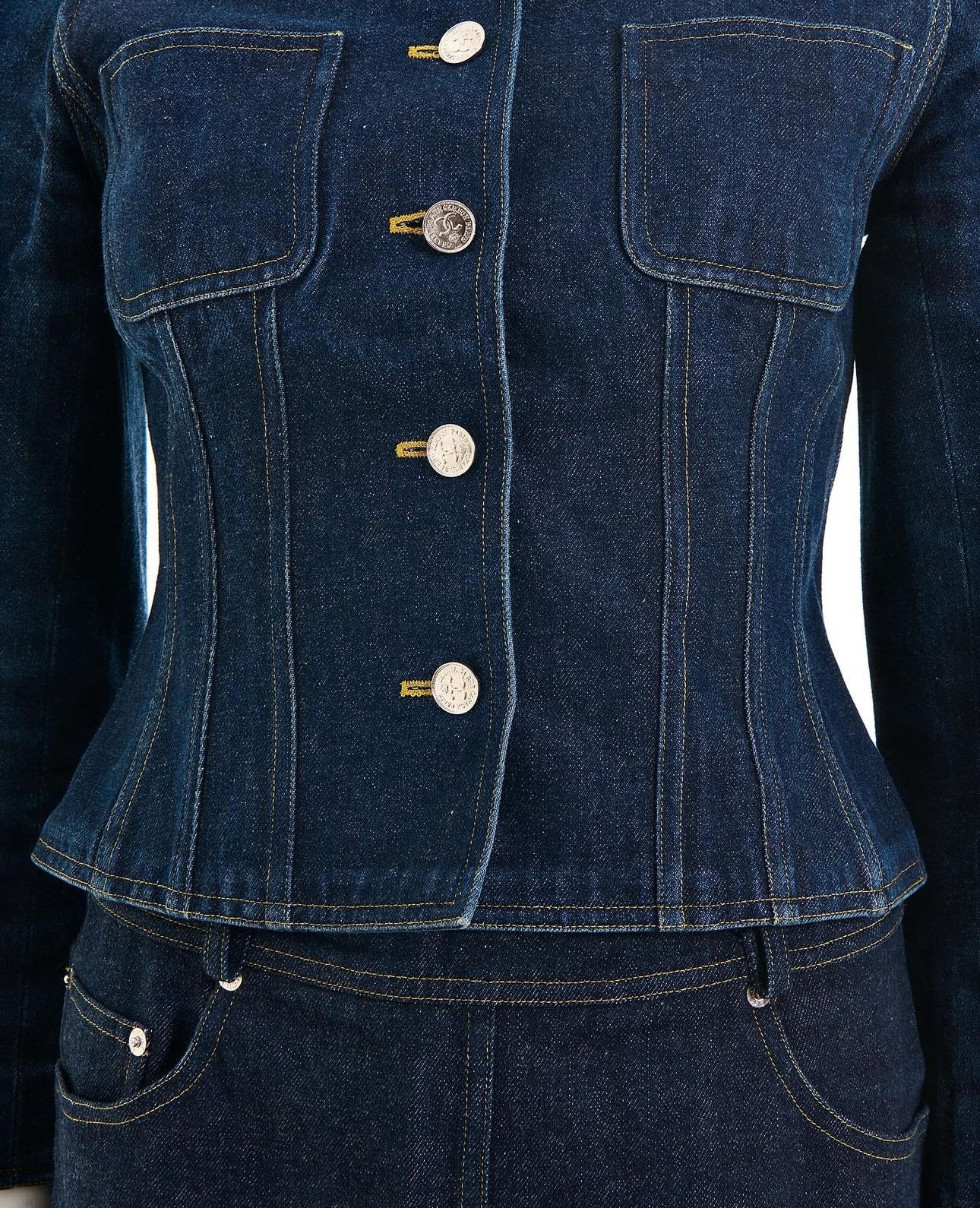 - Chanel setup suit collarless jacket and skirt denim indigo