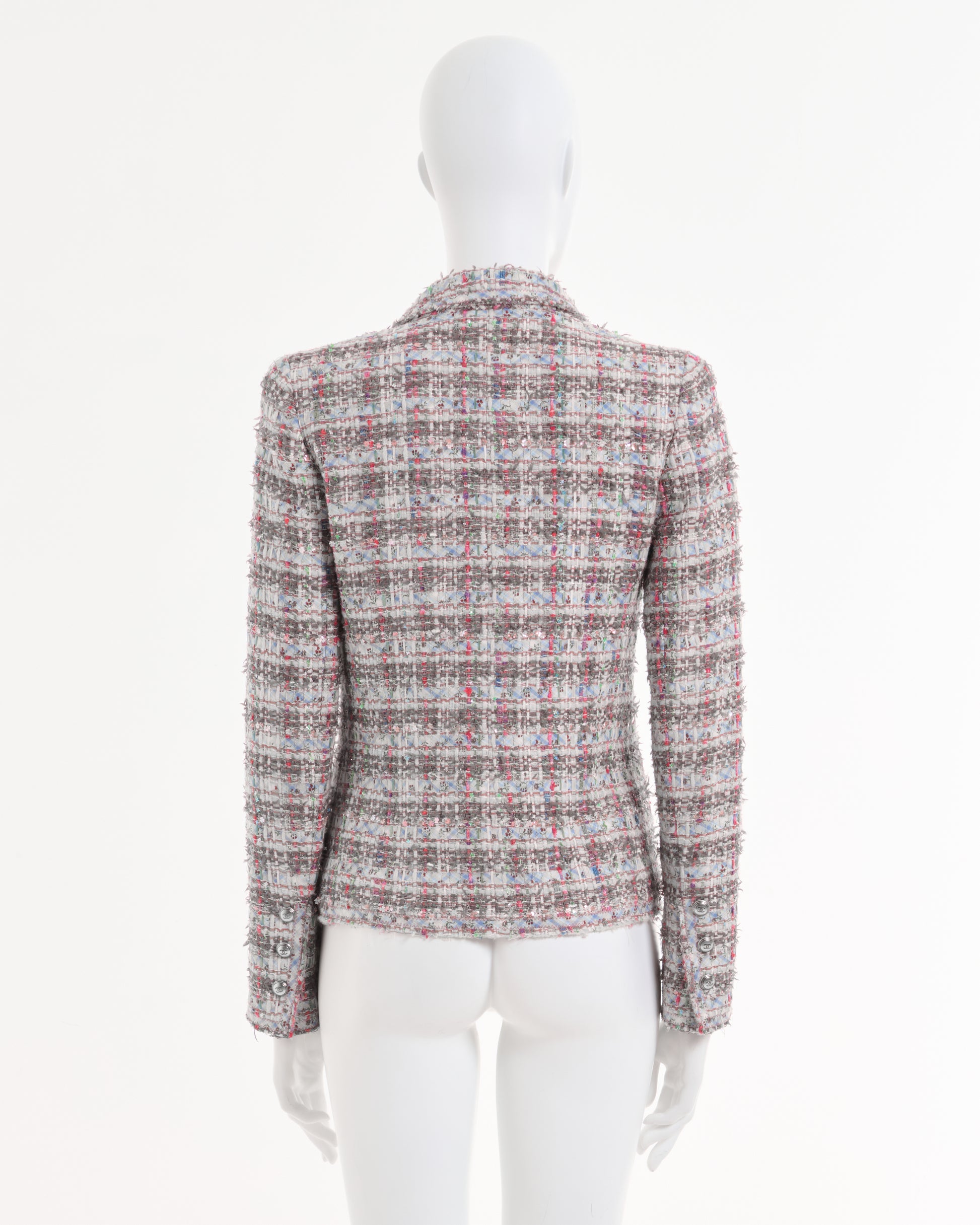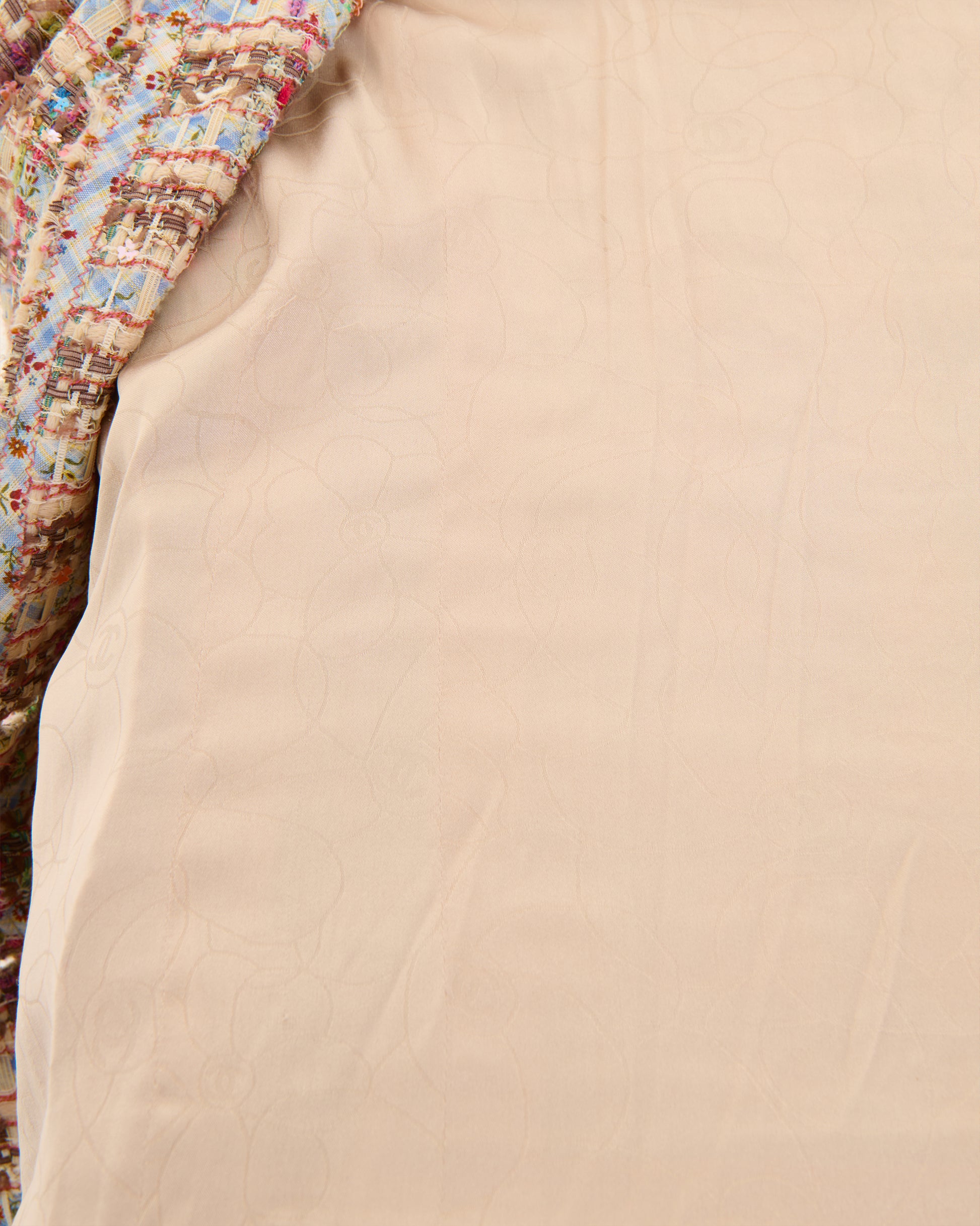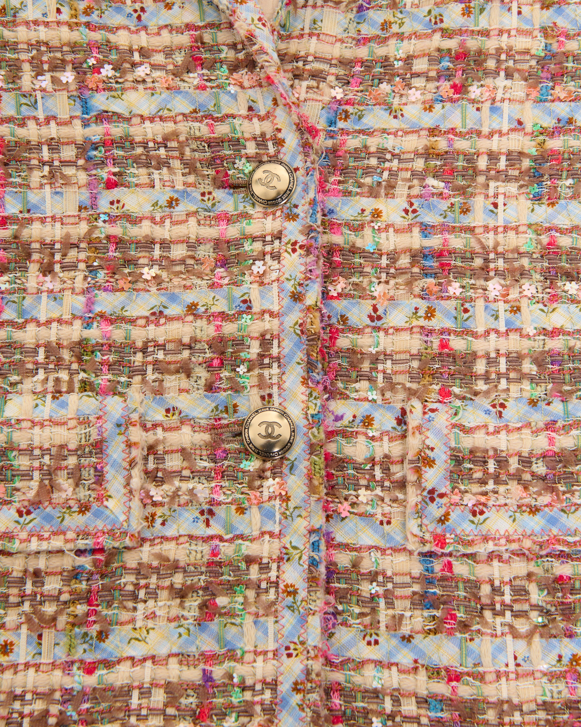 - The fabric of this jacket is a boucle made up of multi color and size ribbons woven throughout with tiny multi color flower shaped sequins to give it that final touch