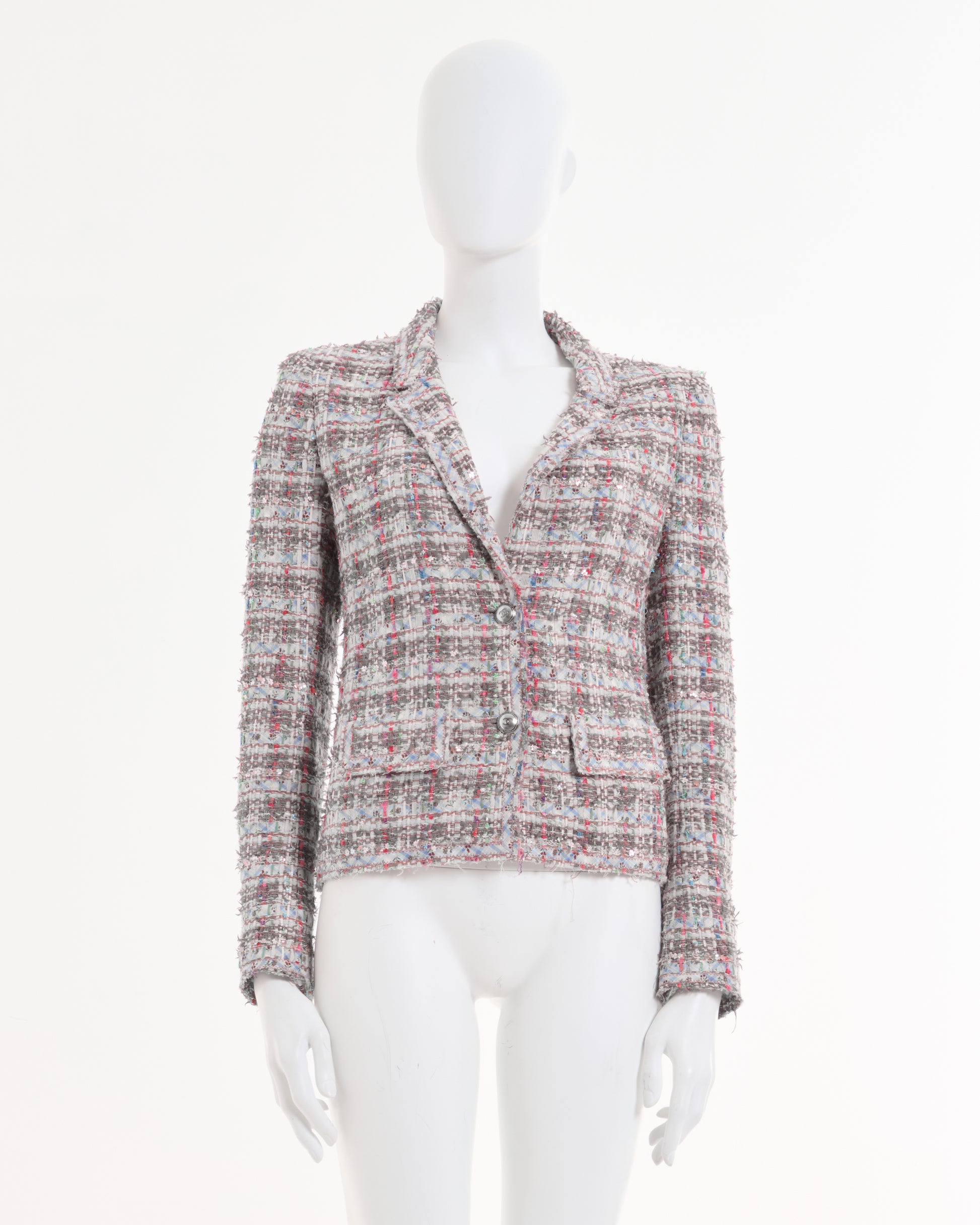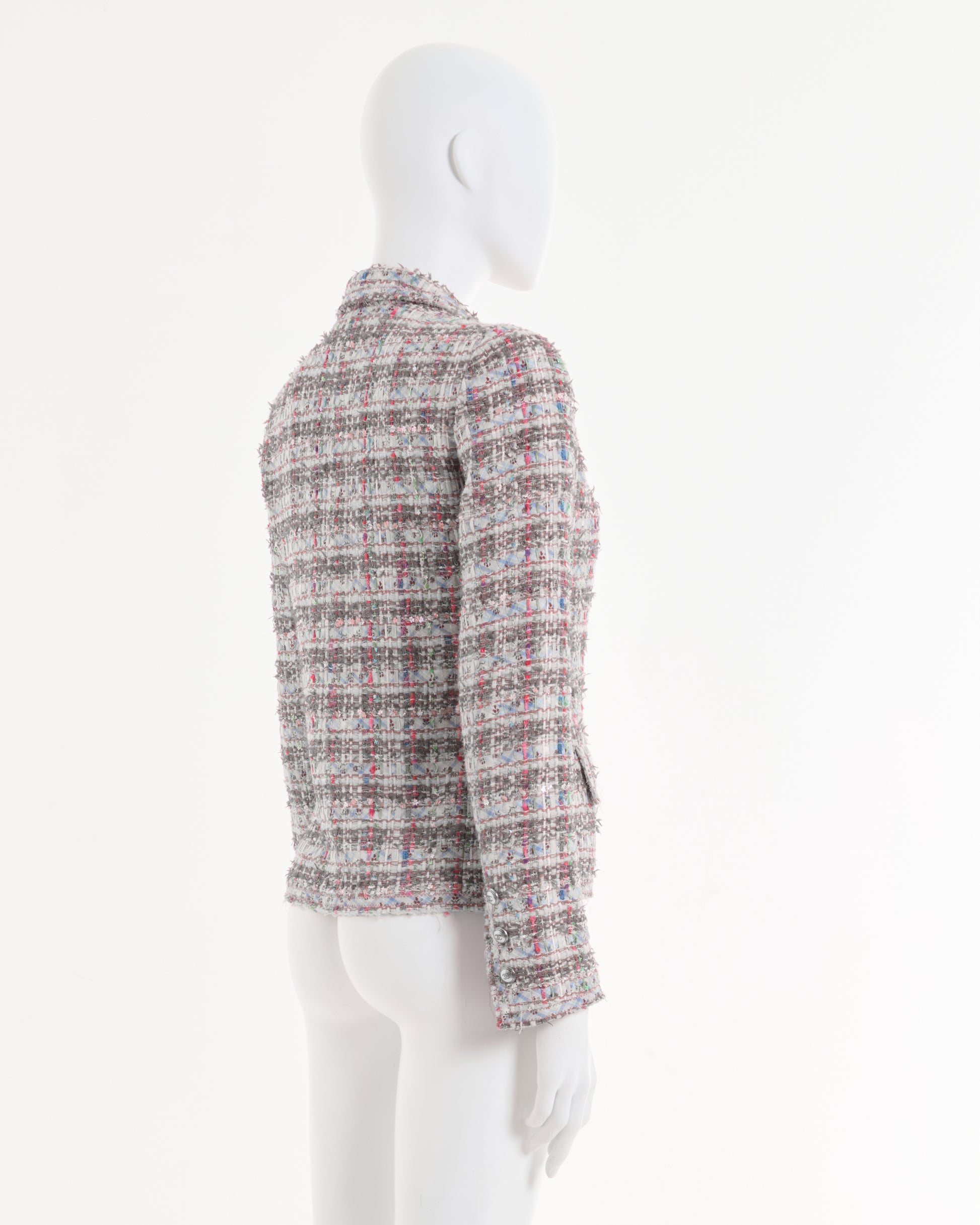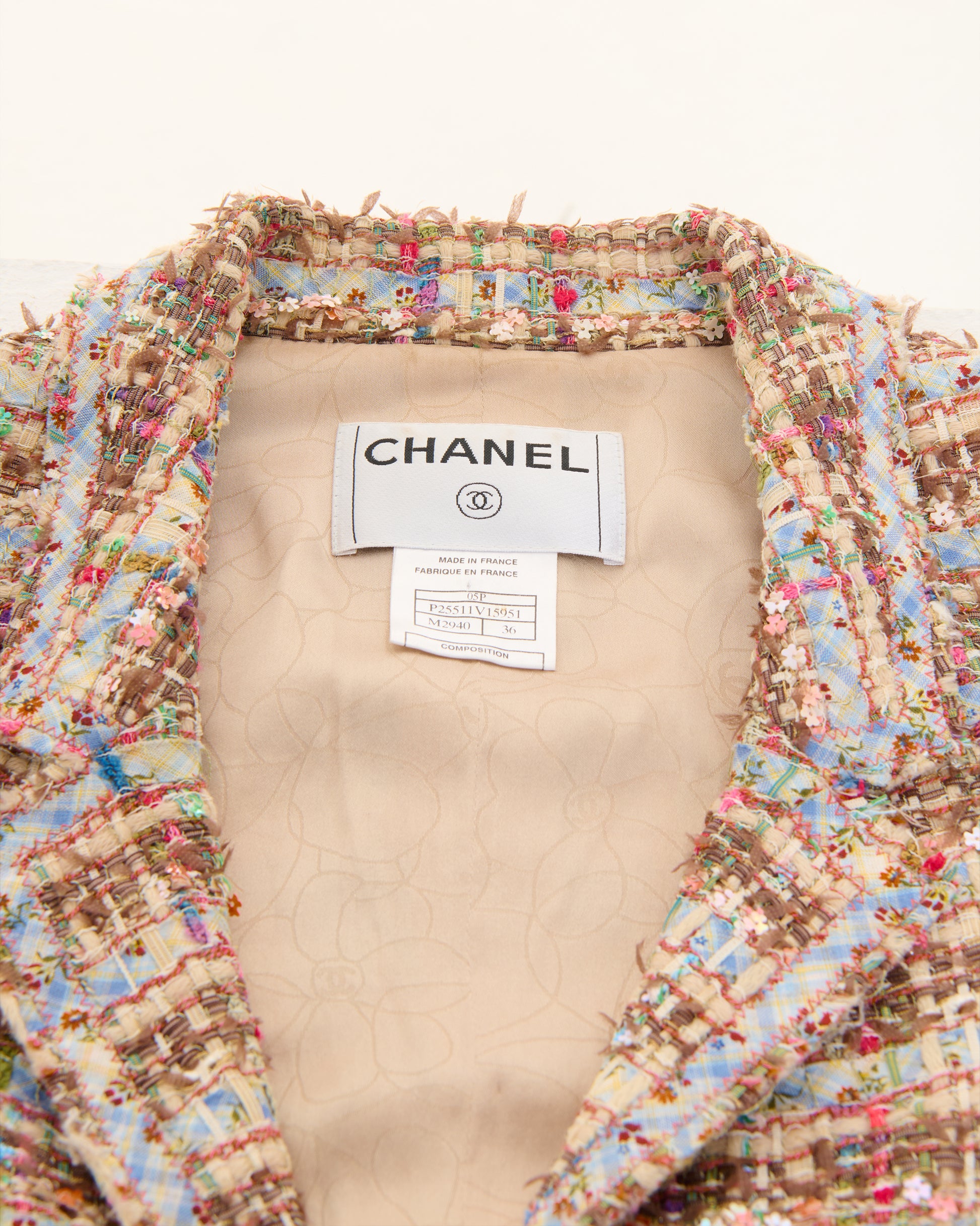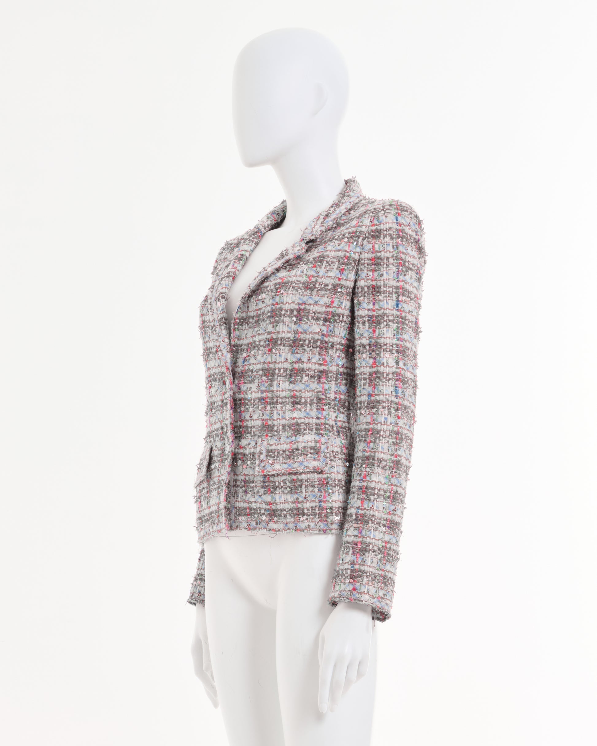 - The fabric of this jacket is a boucle made up of multi color and size ribbons woven throughout with tiny multi color flower shaped sequins to give it that final touch