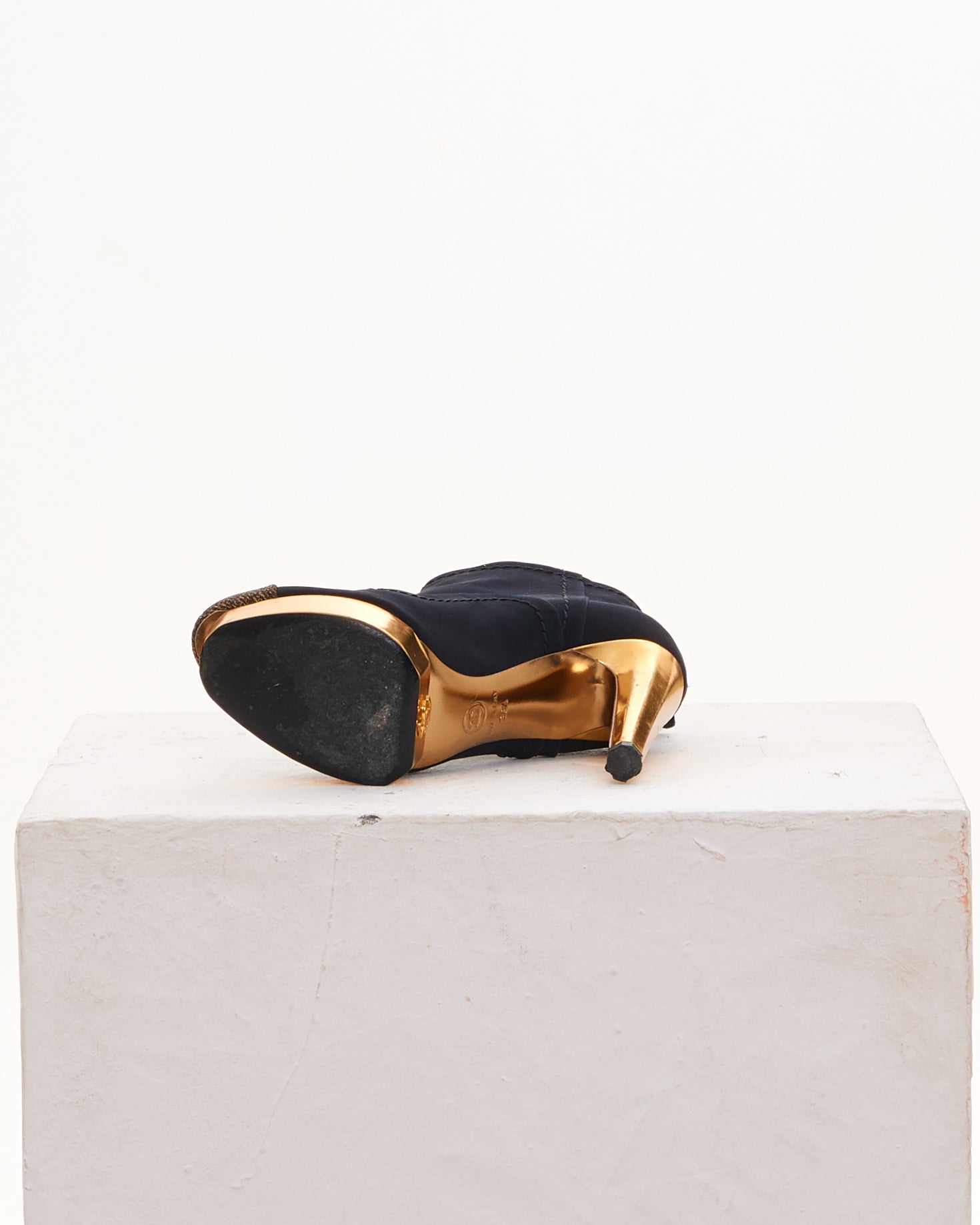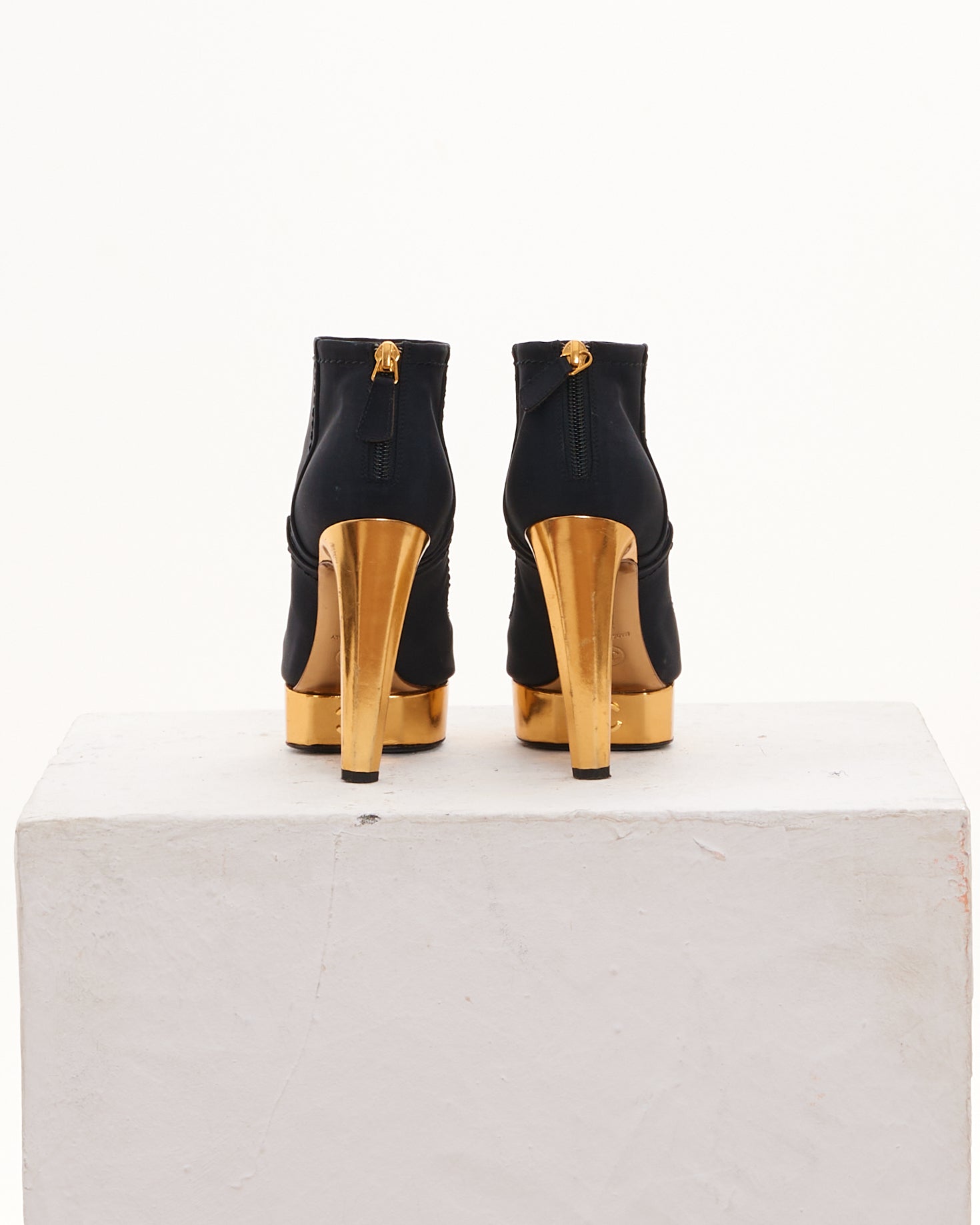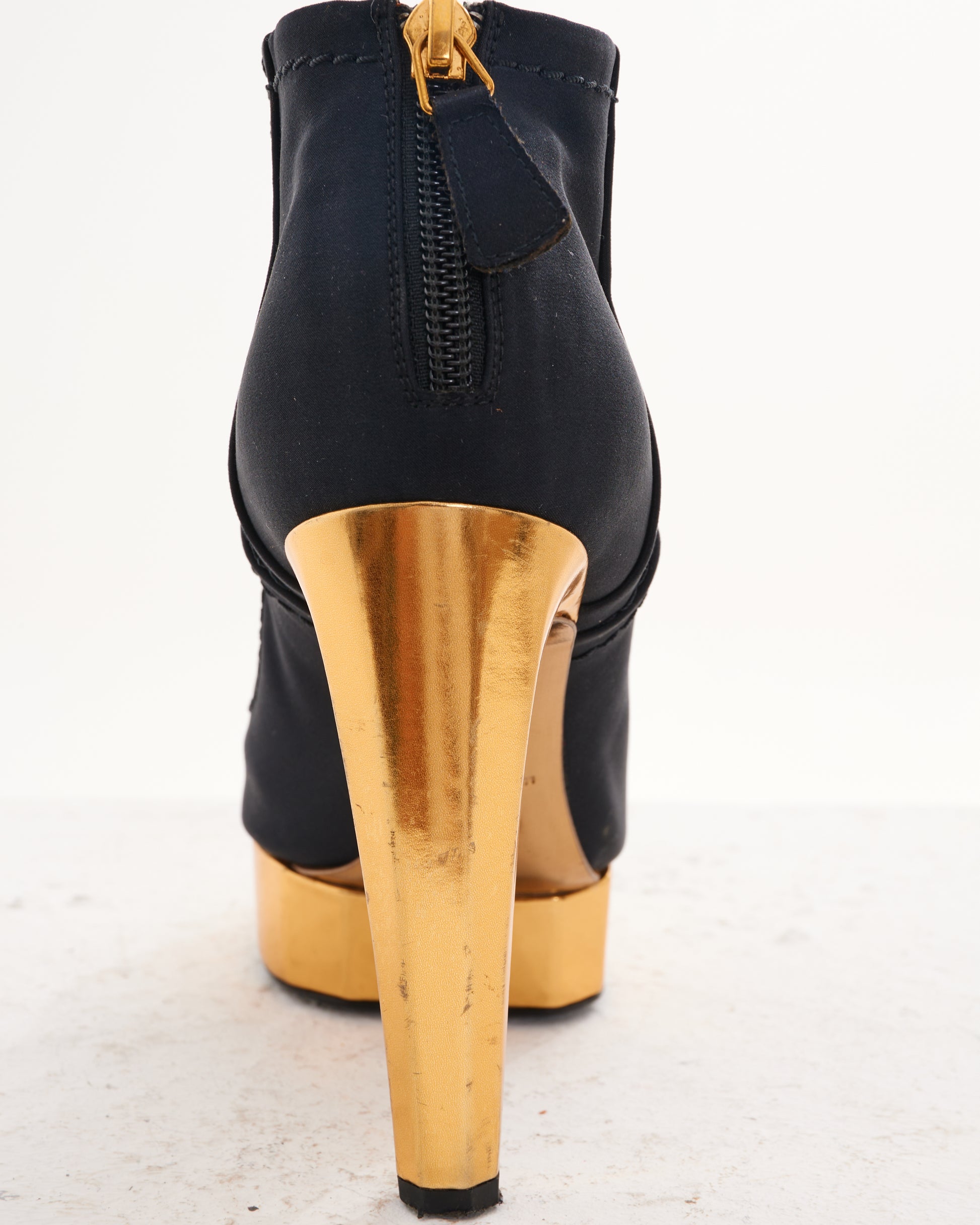 - Black and gold ankle platform heeled boots