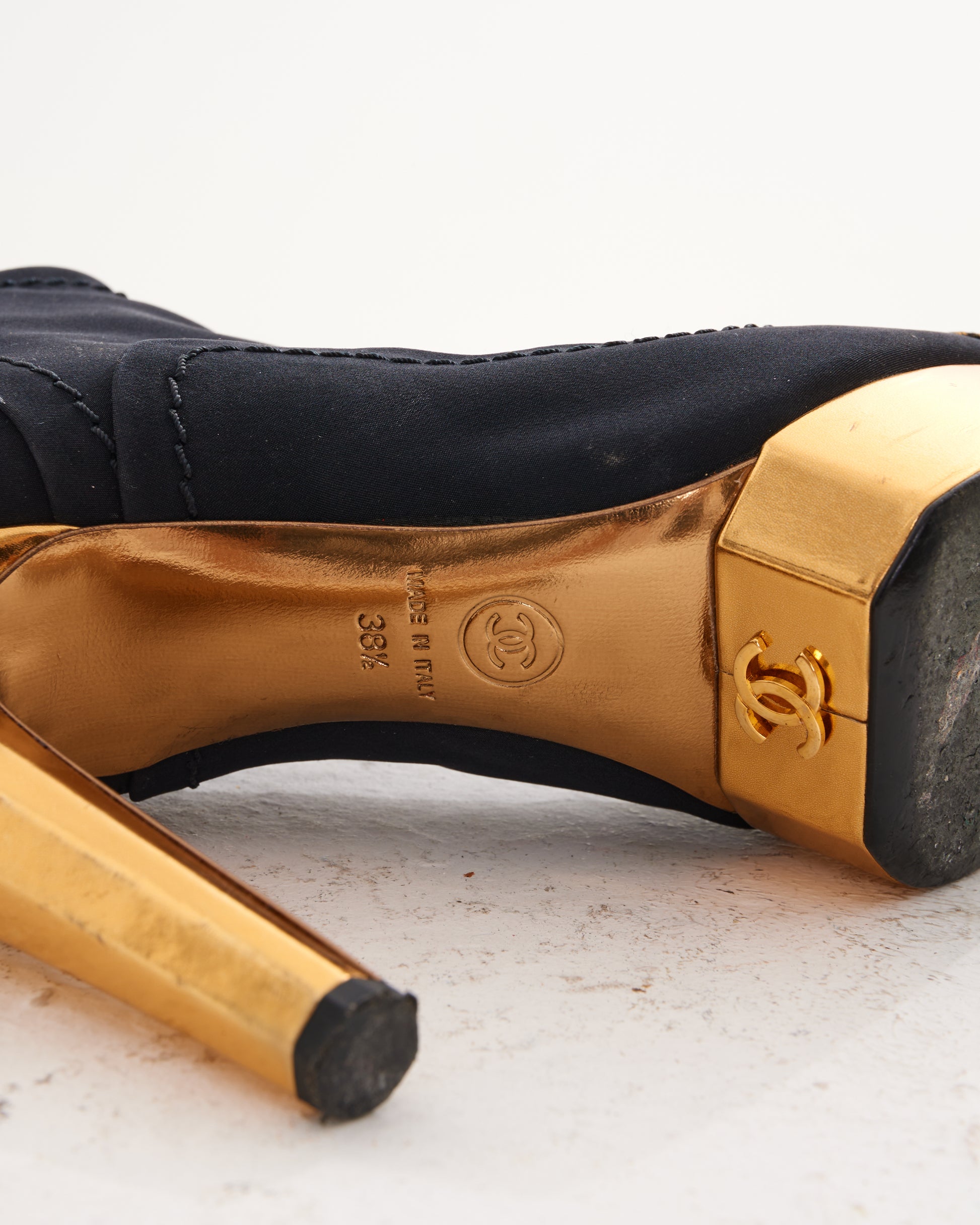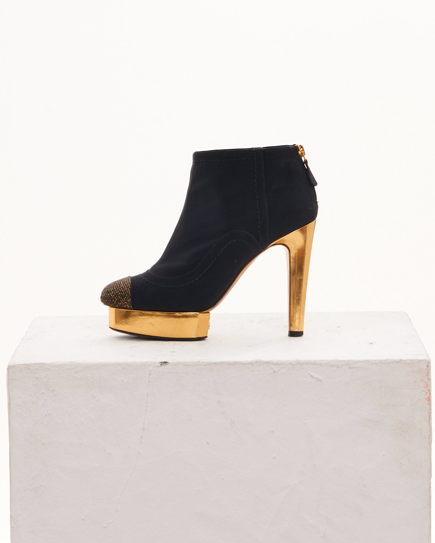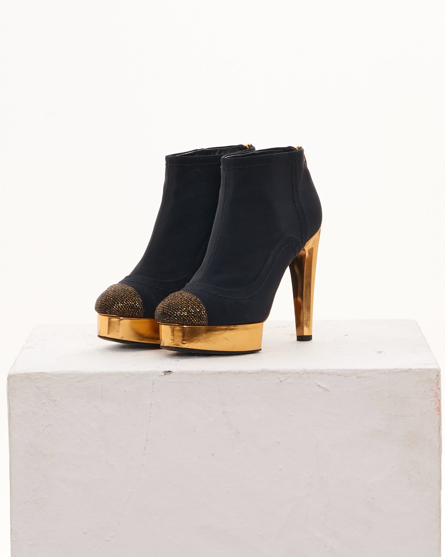 - Black and gold ankle platform heeled boots