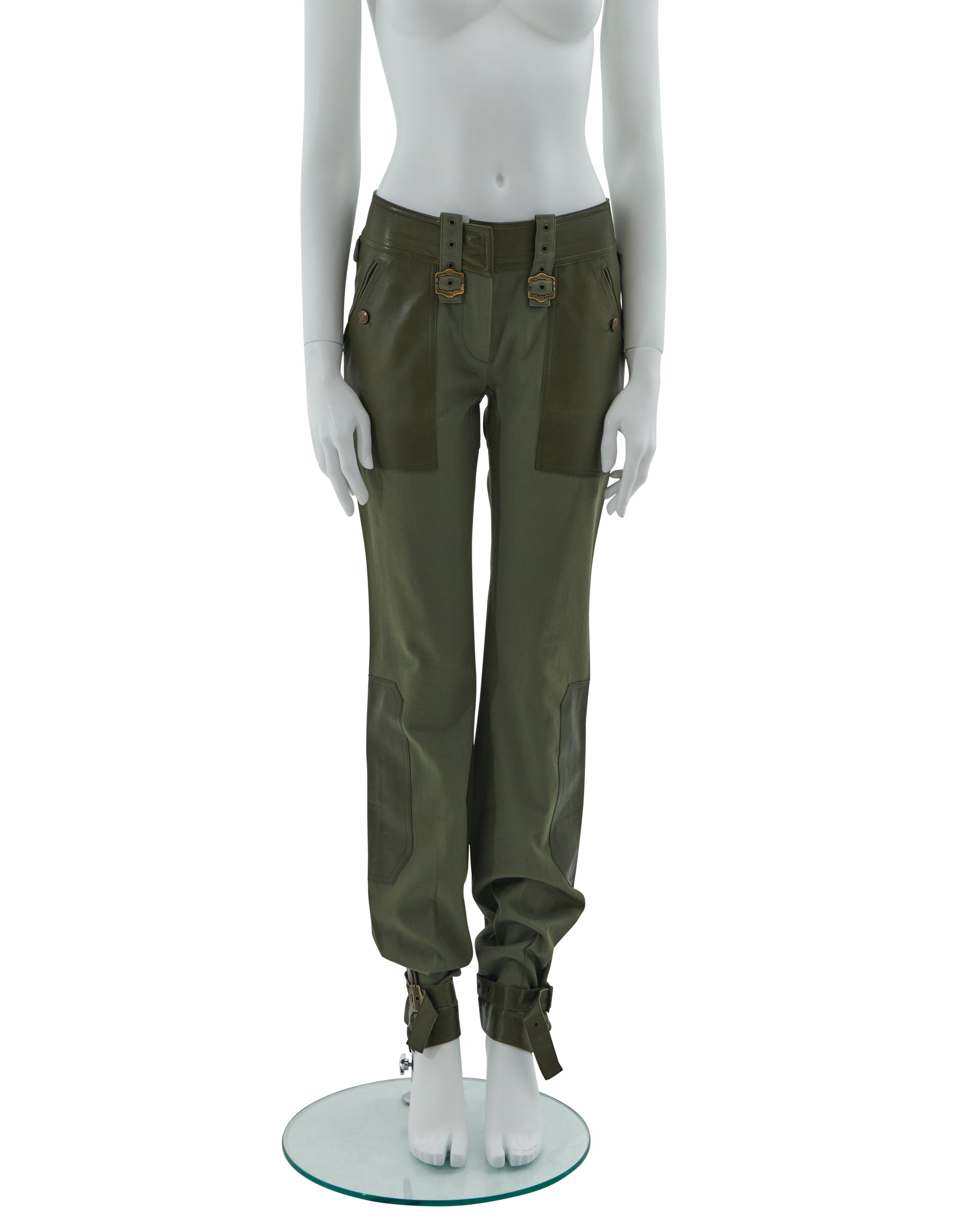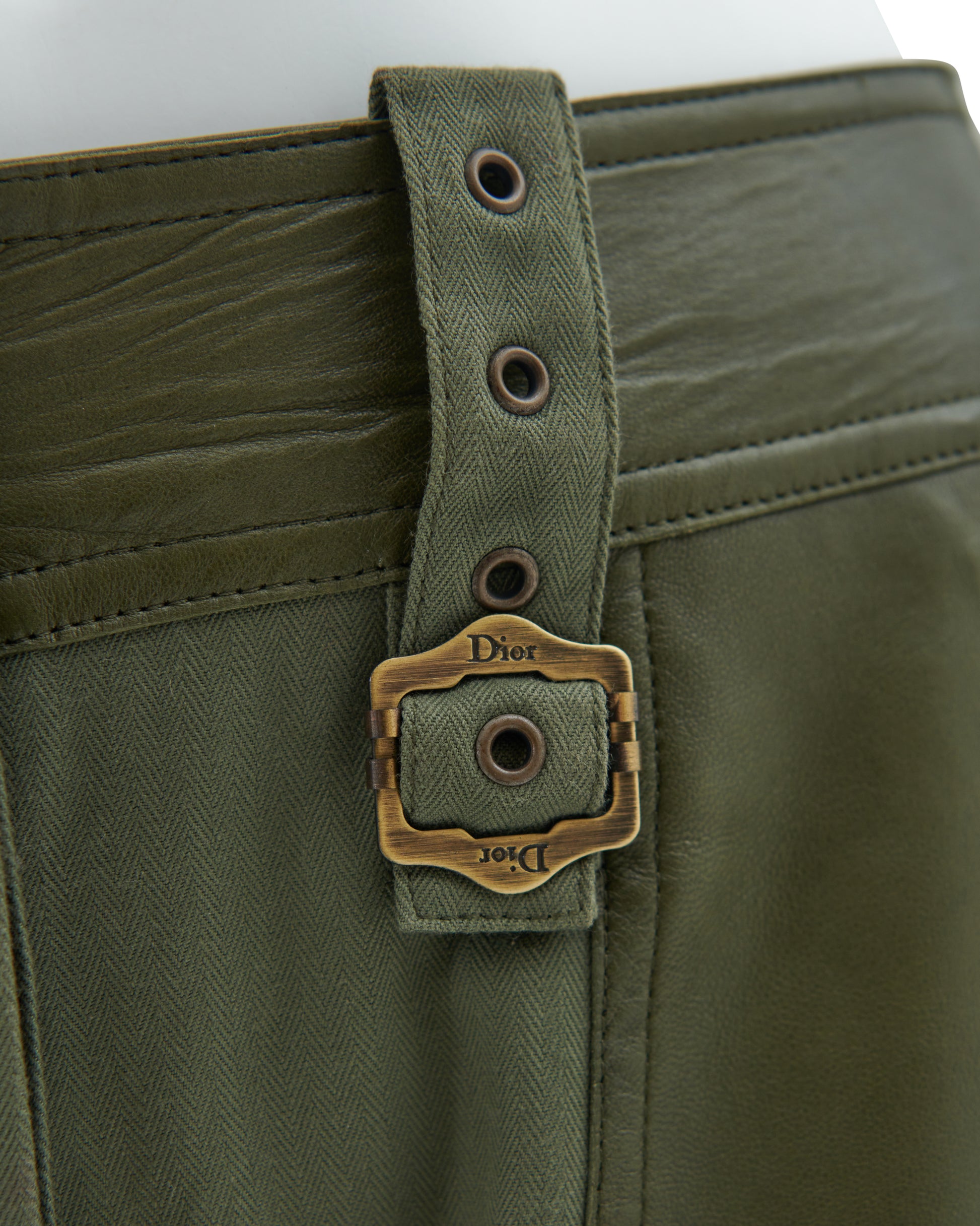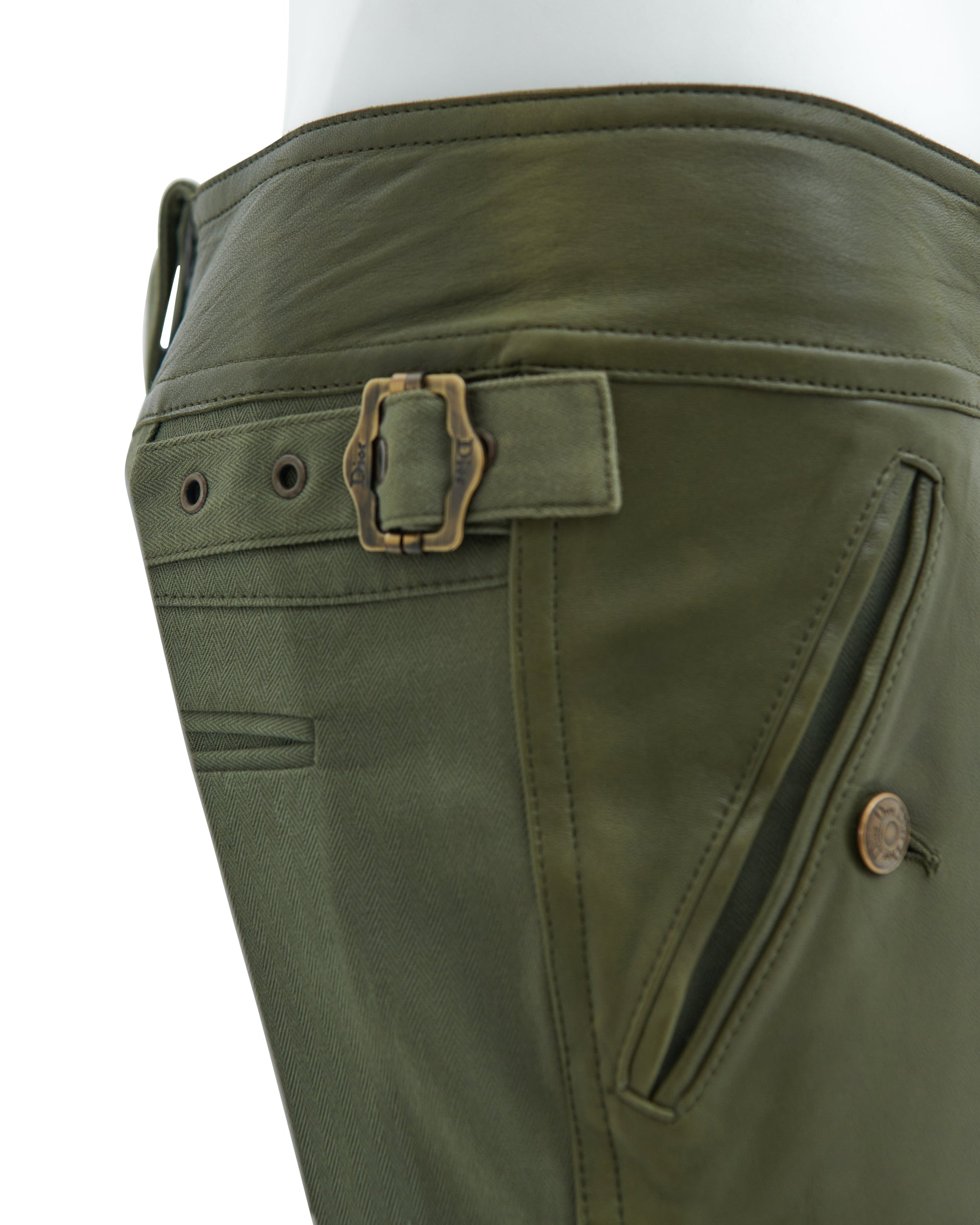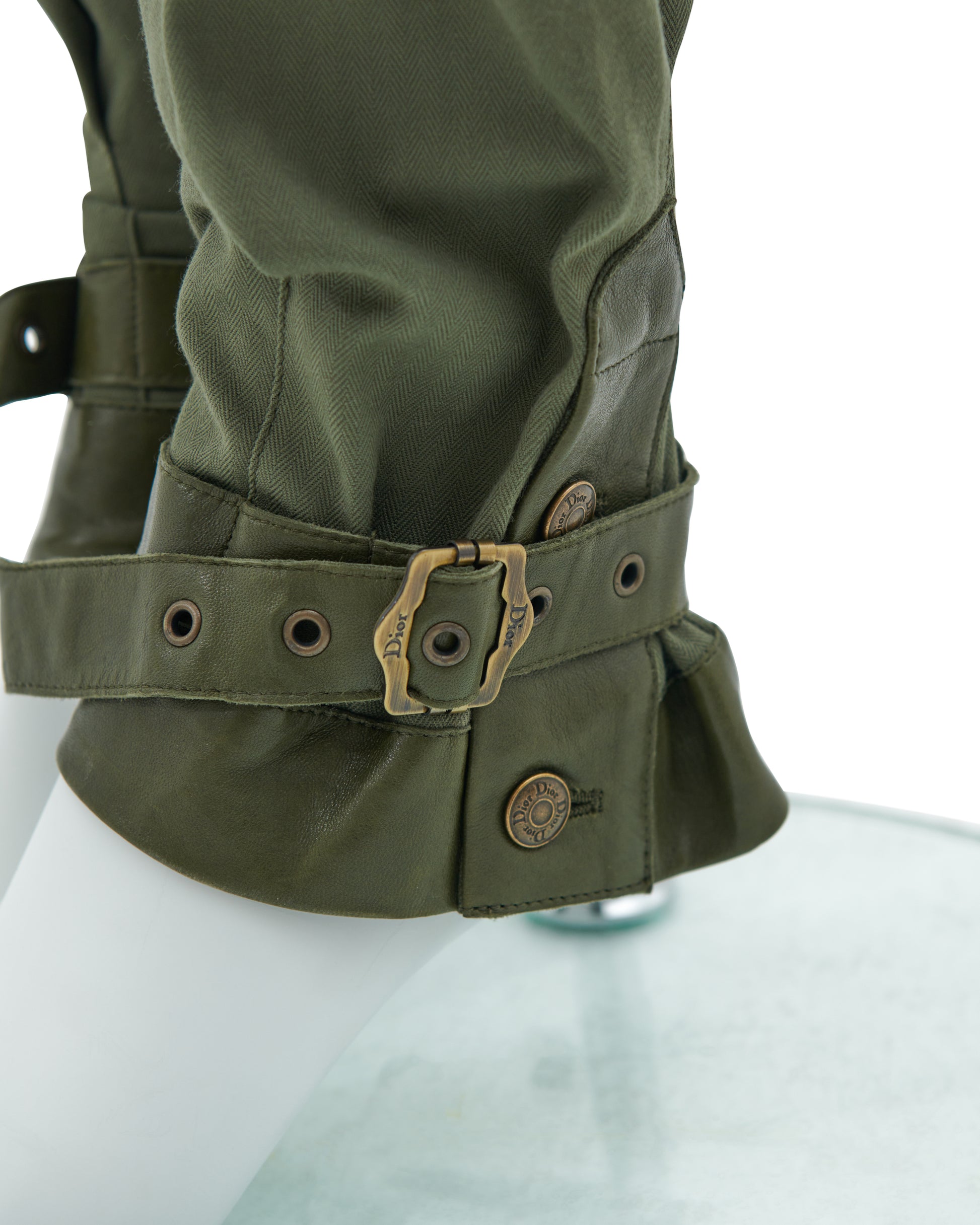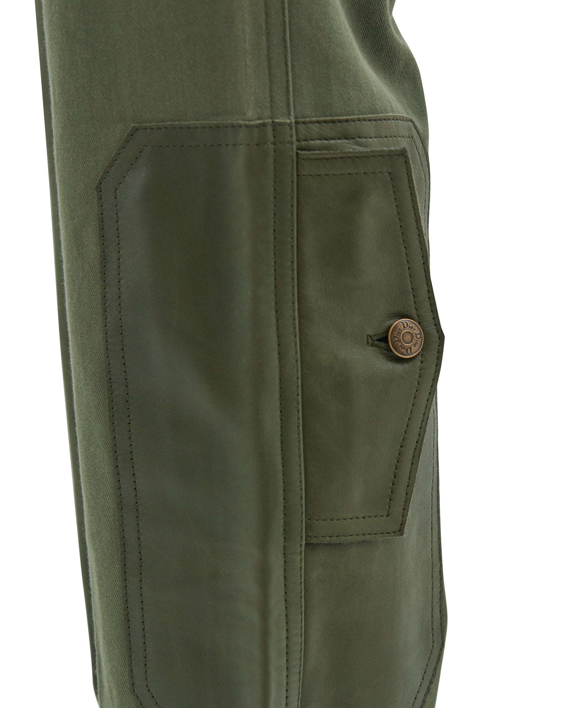 - Khaki olive green cotton canvas and leather cargo pants