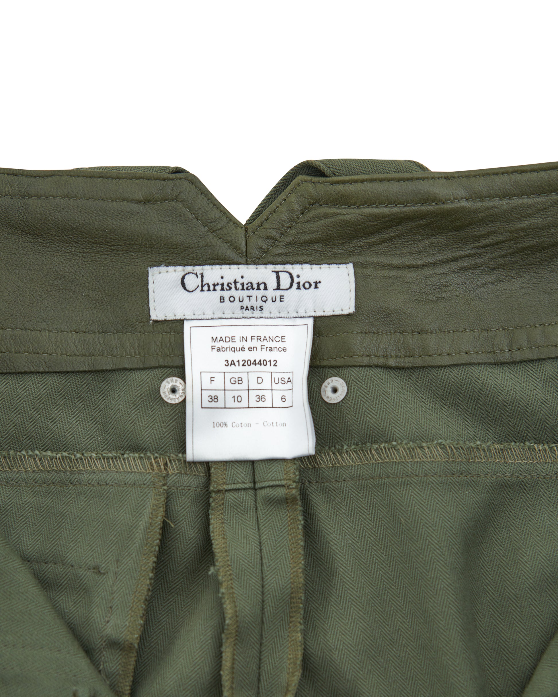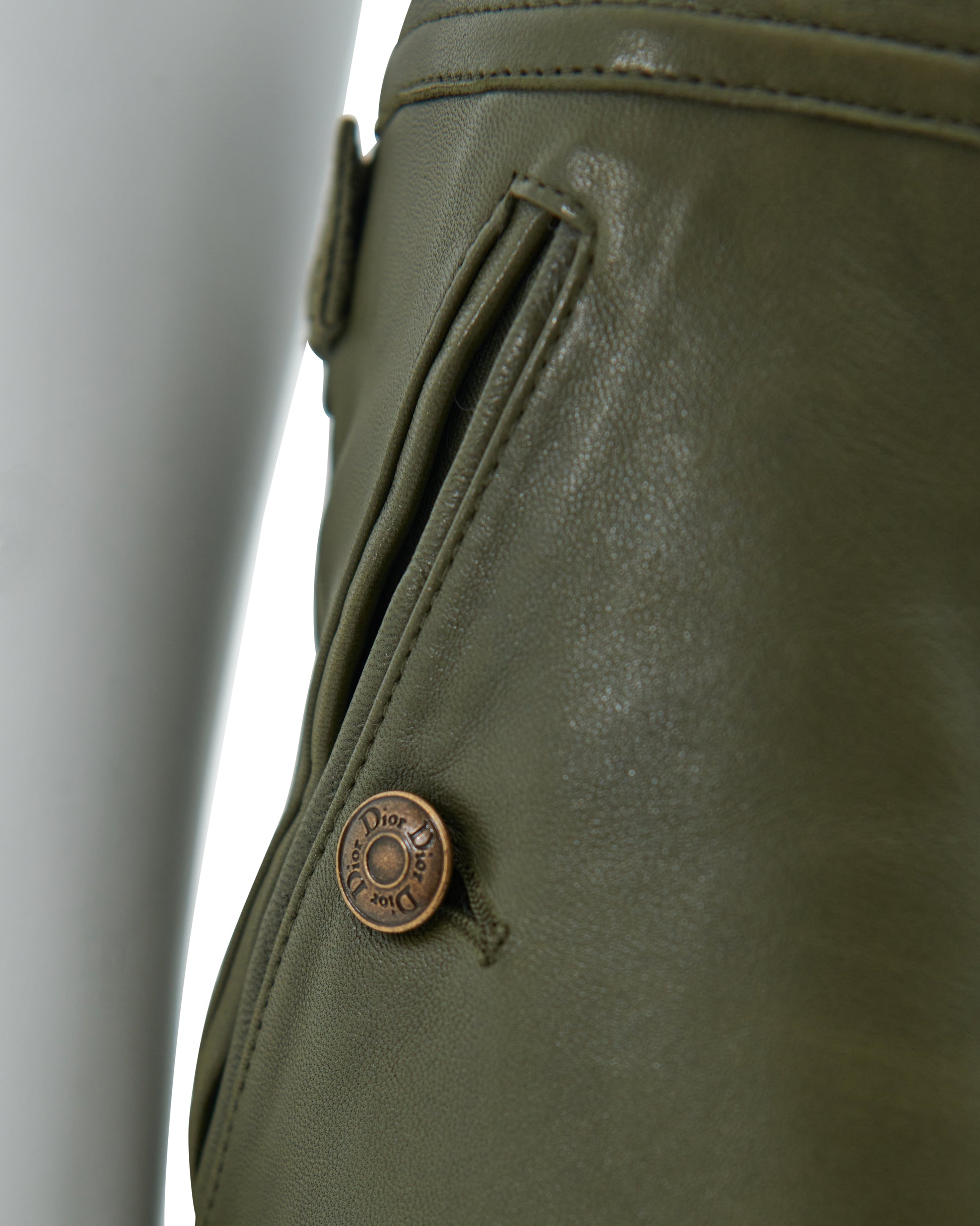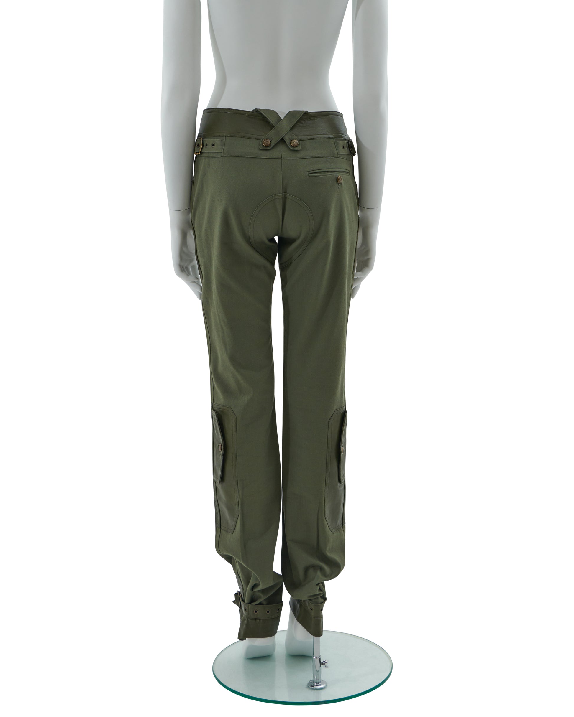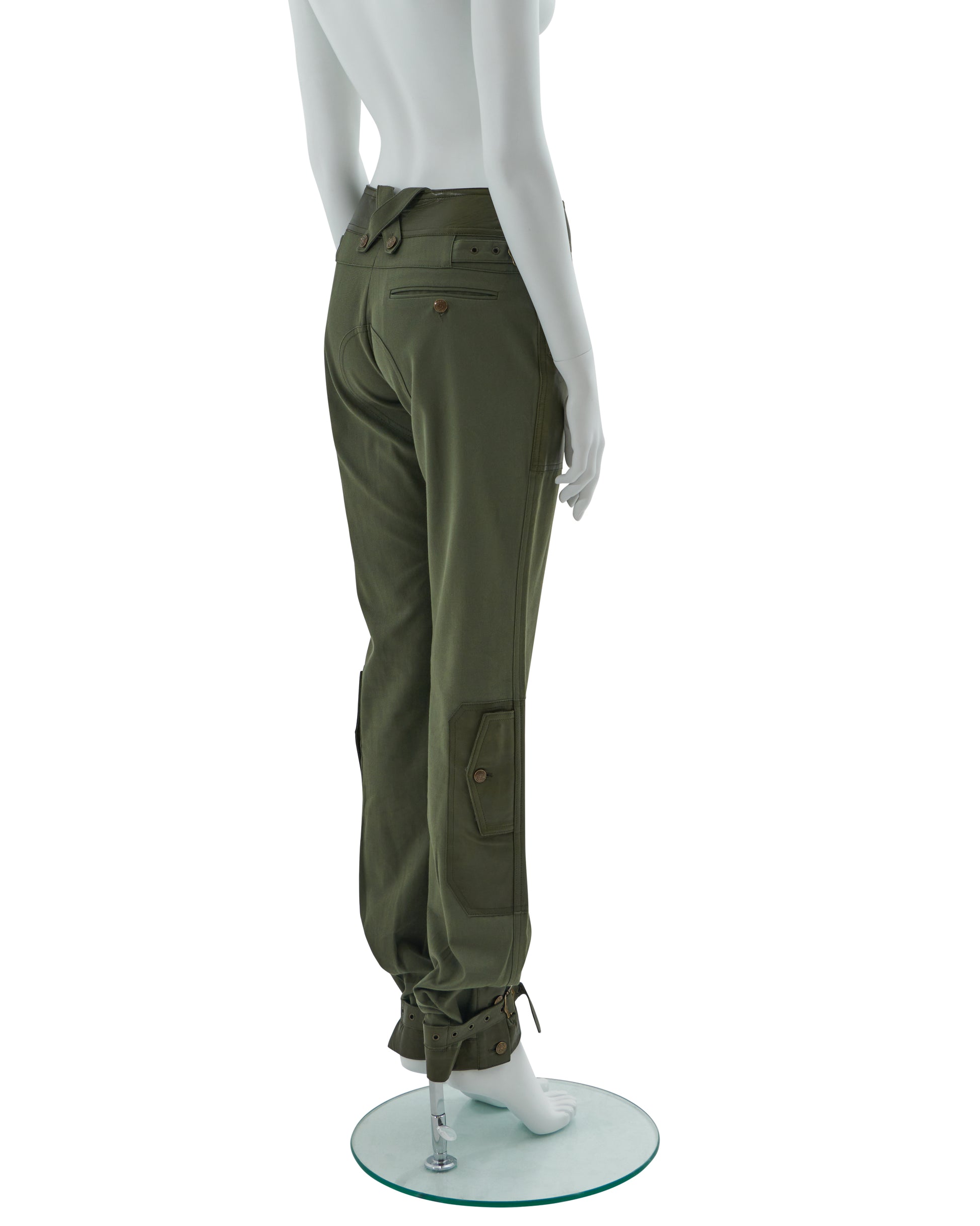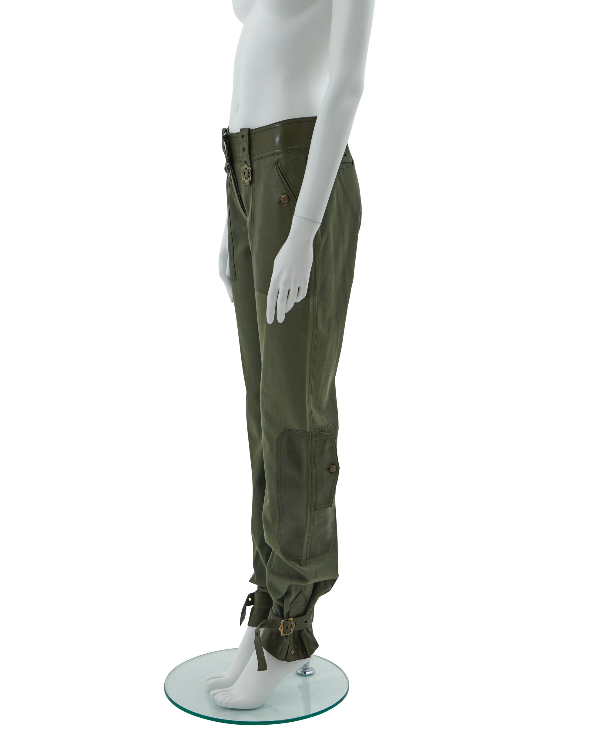 - Khaki olive green cotton canvas and leather cargo pants
