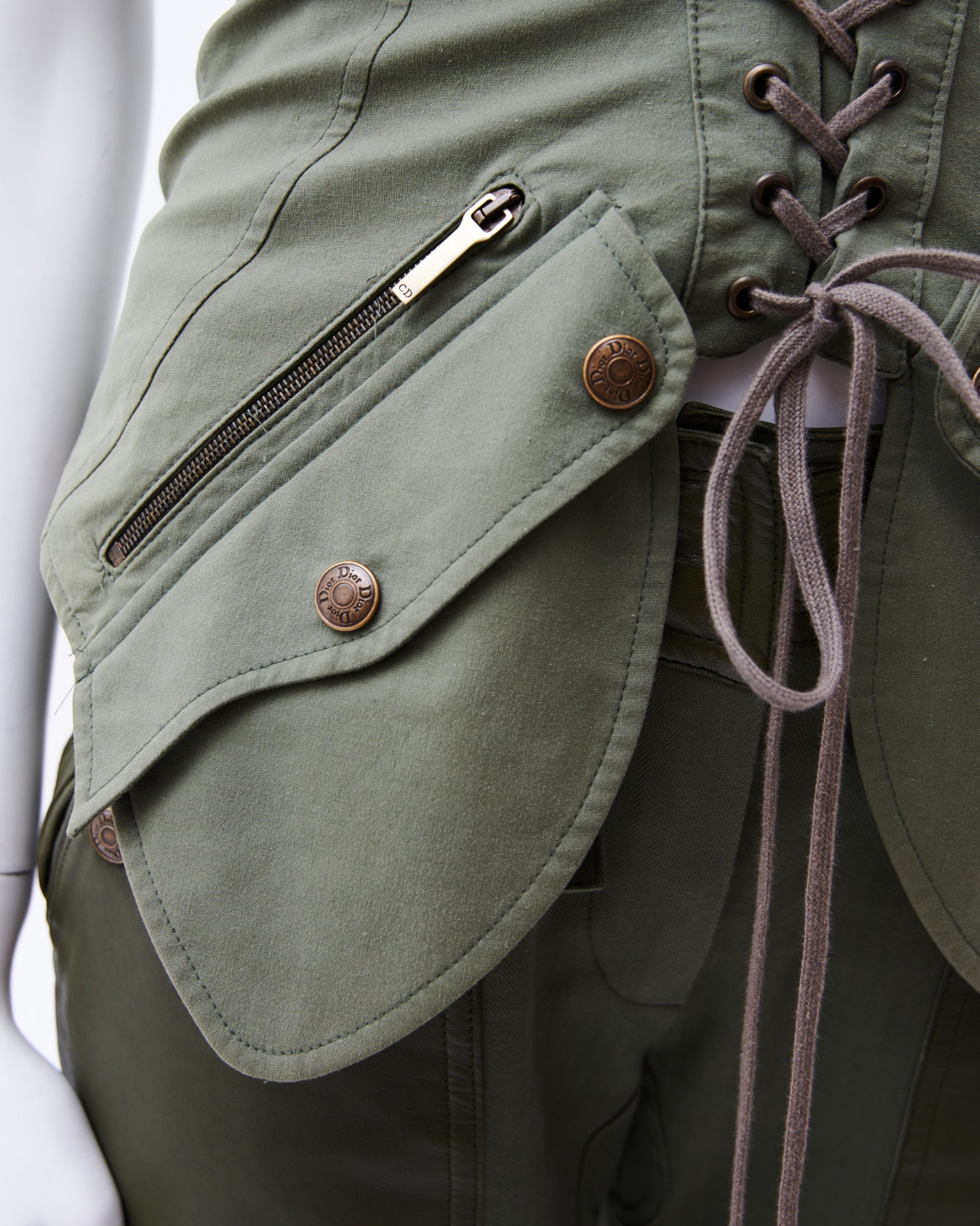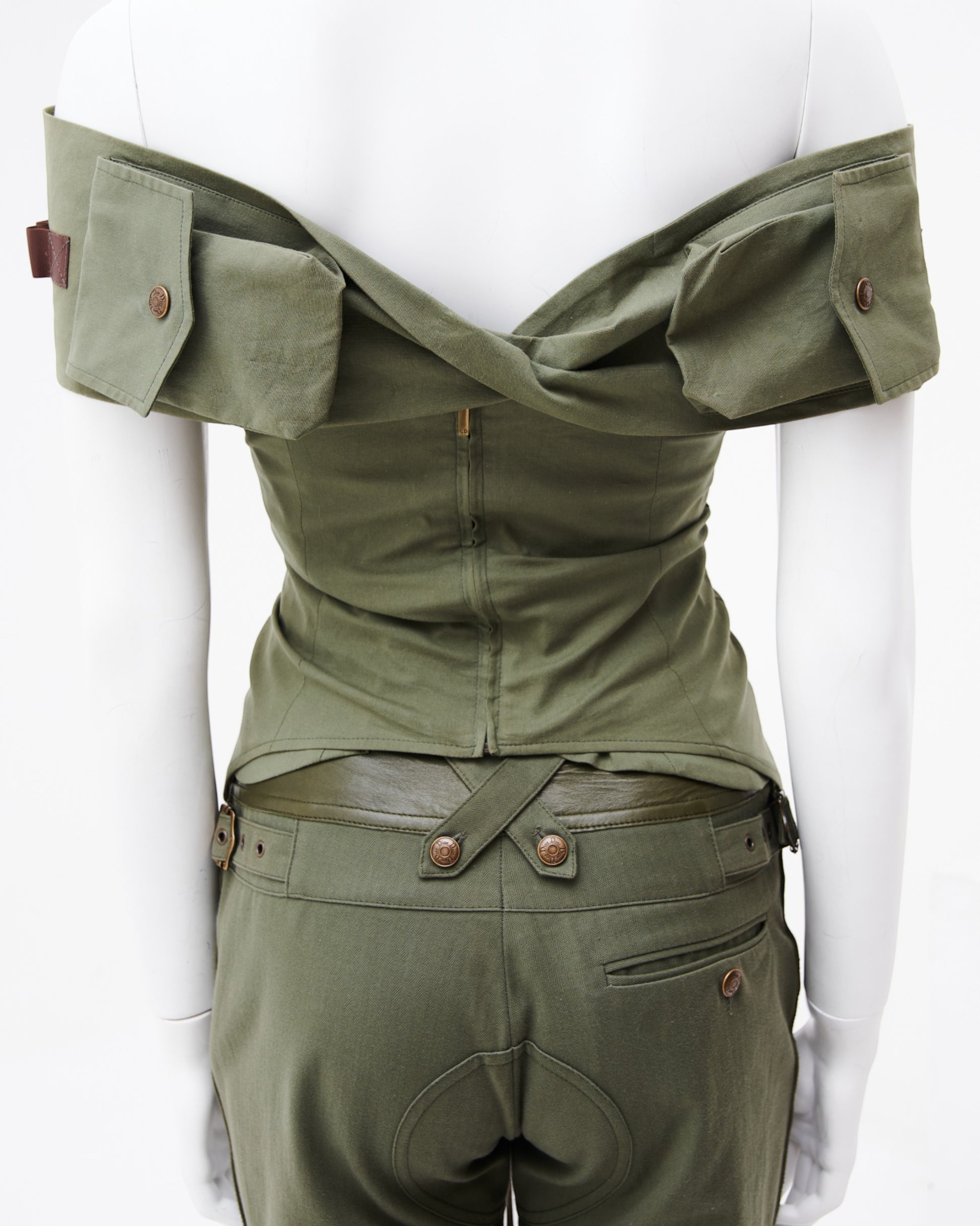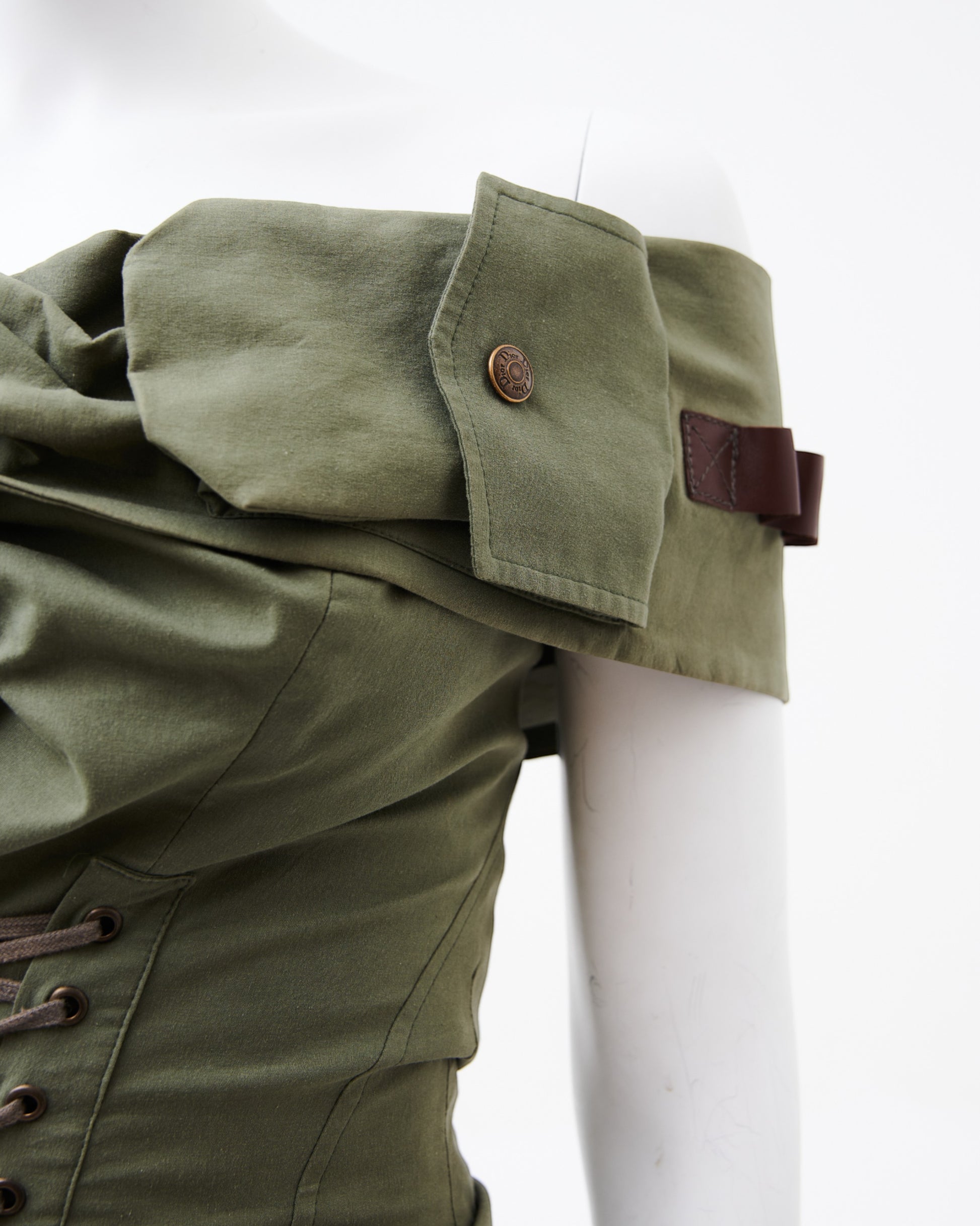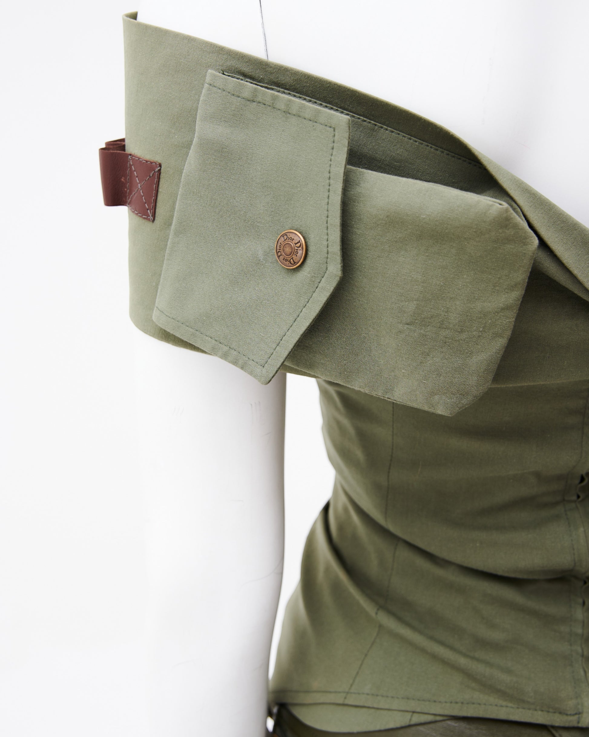 - Off-shoulder corseted top with functional cargo pockets on the shoulders and front panels