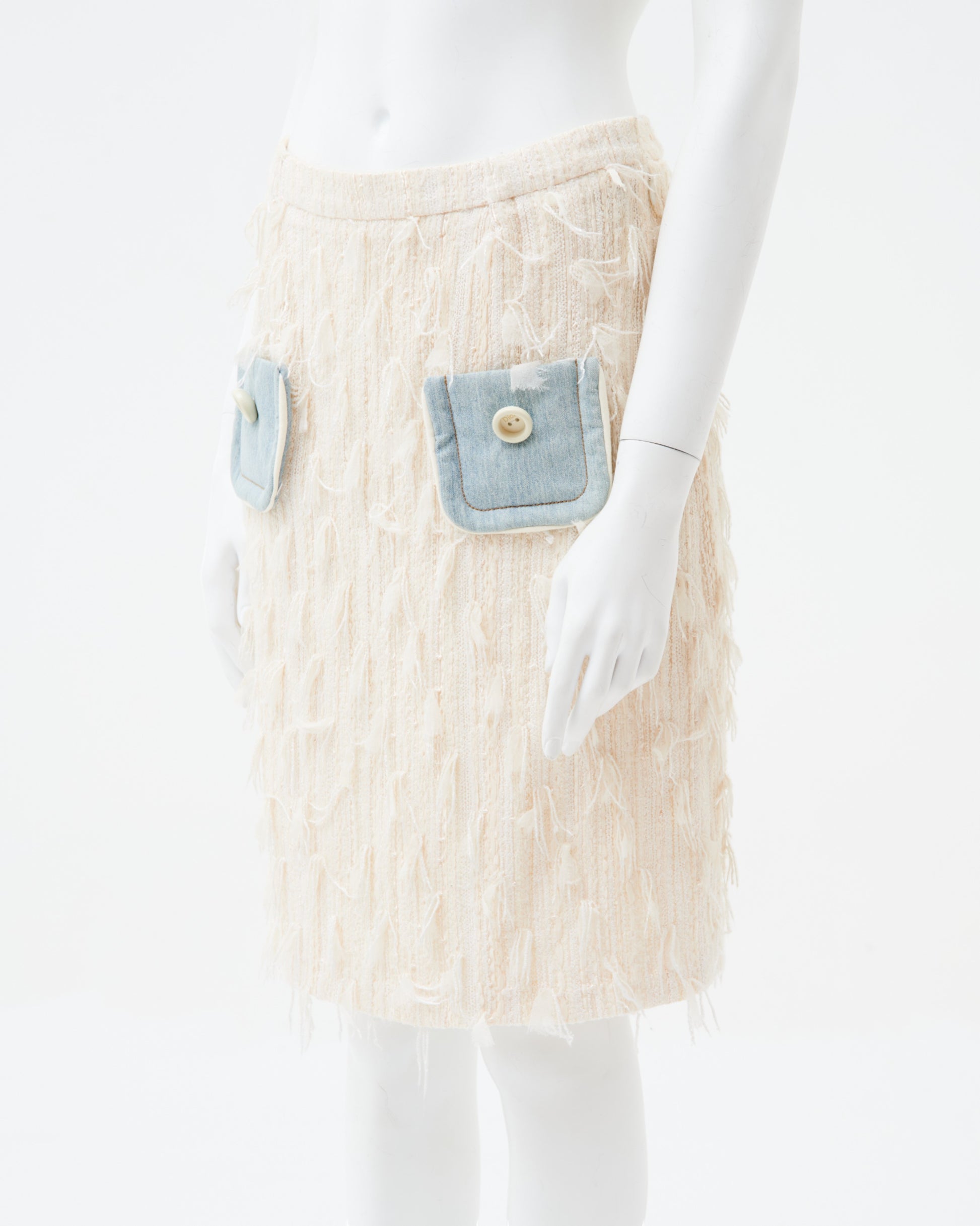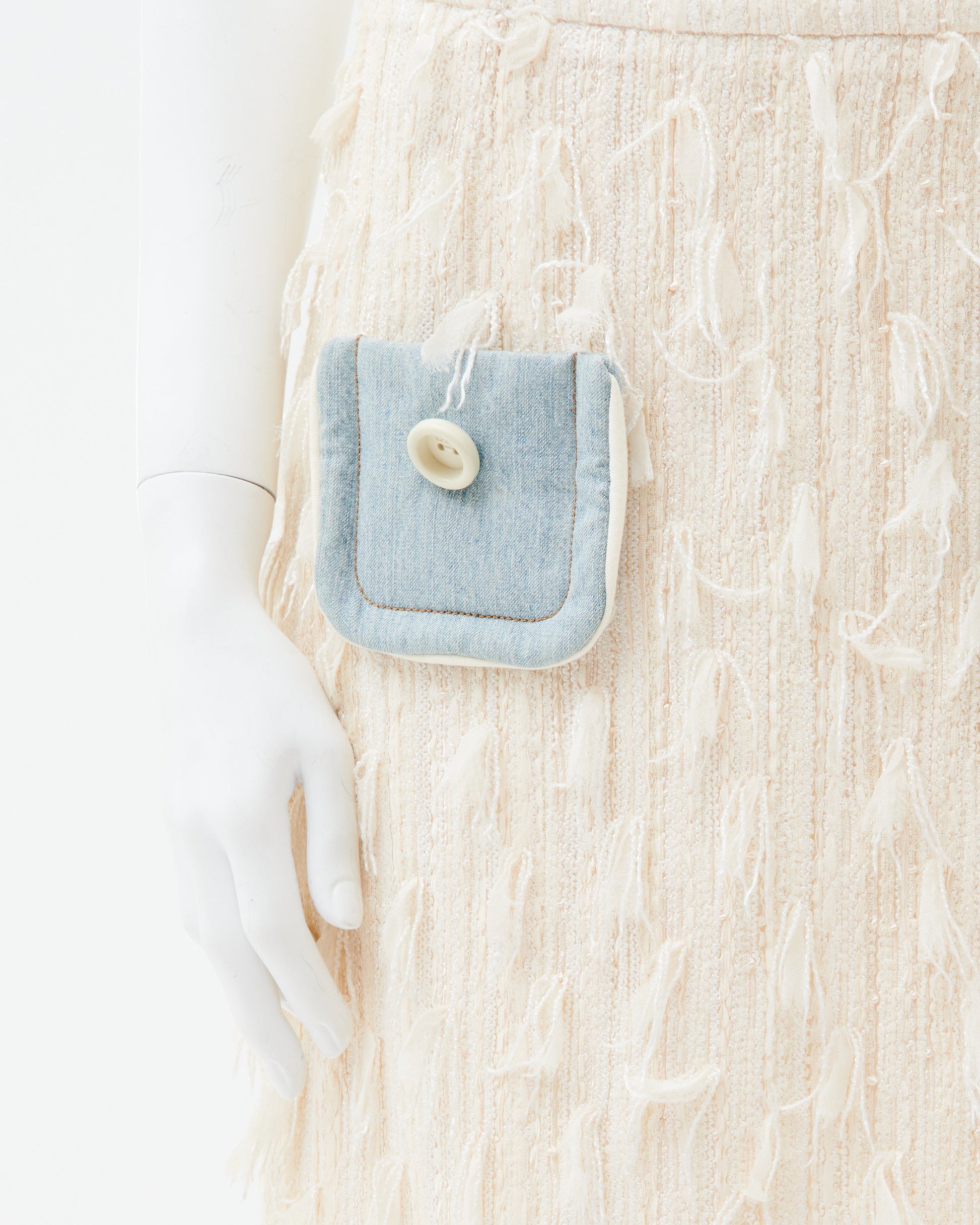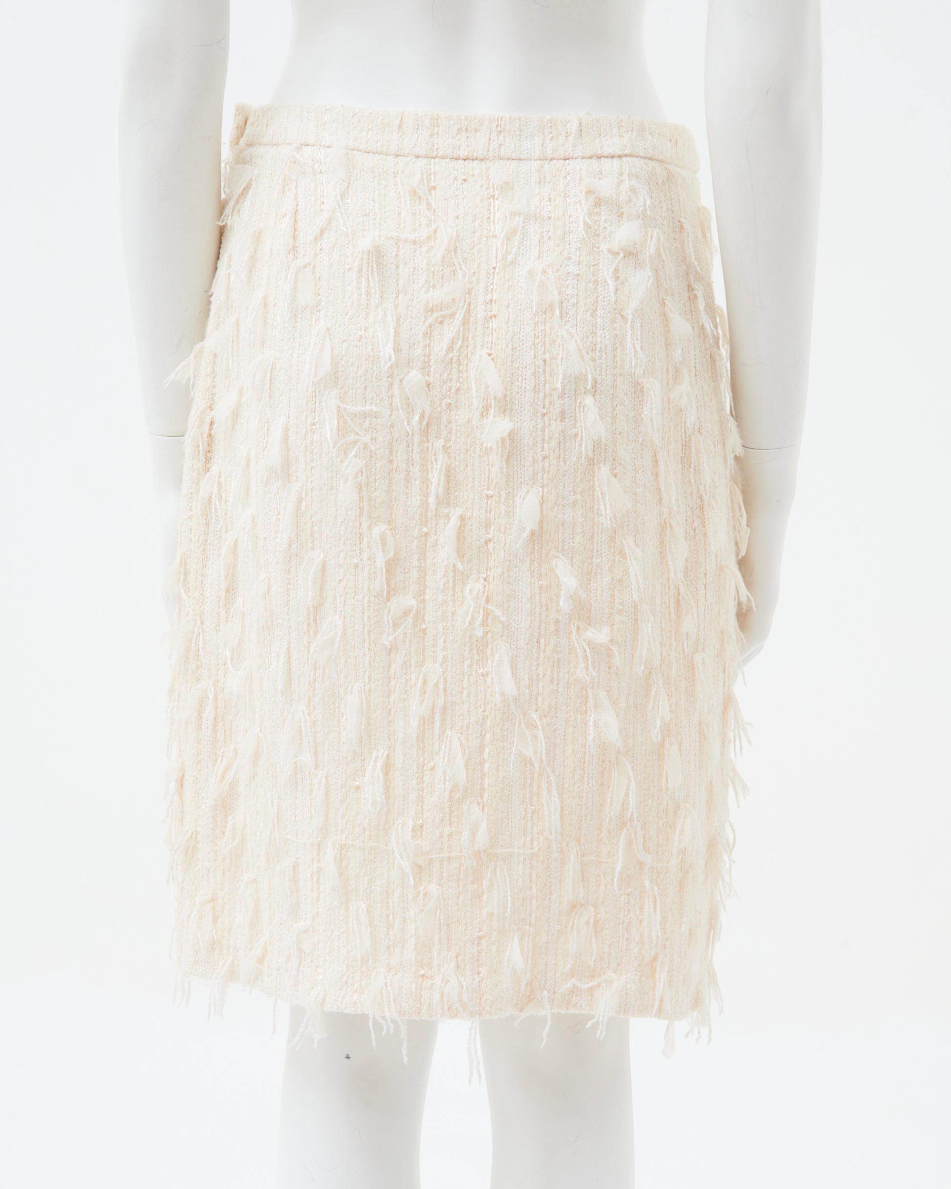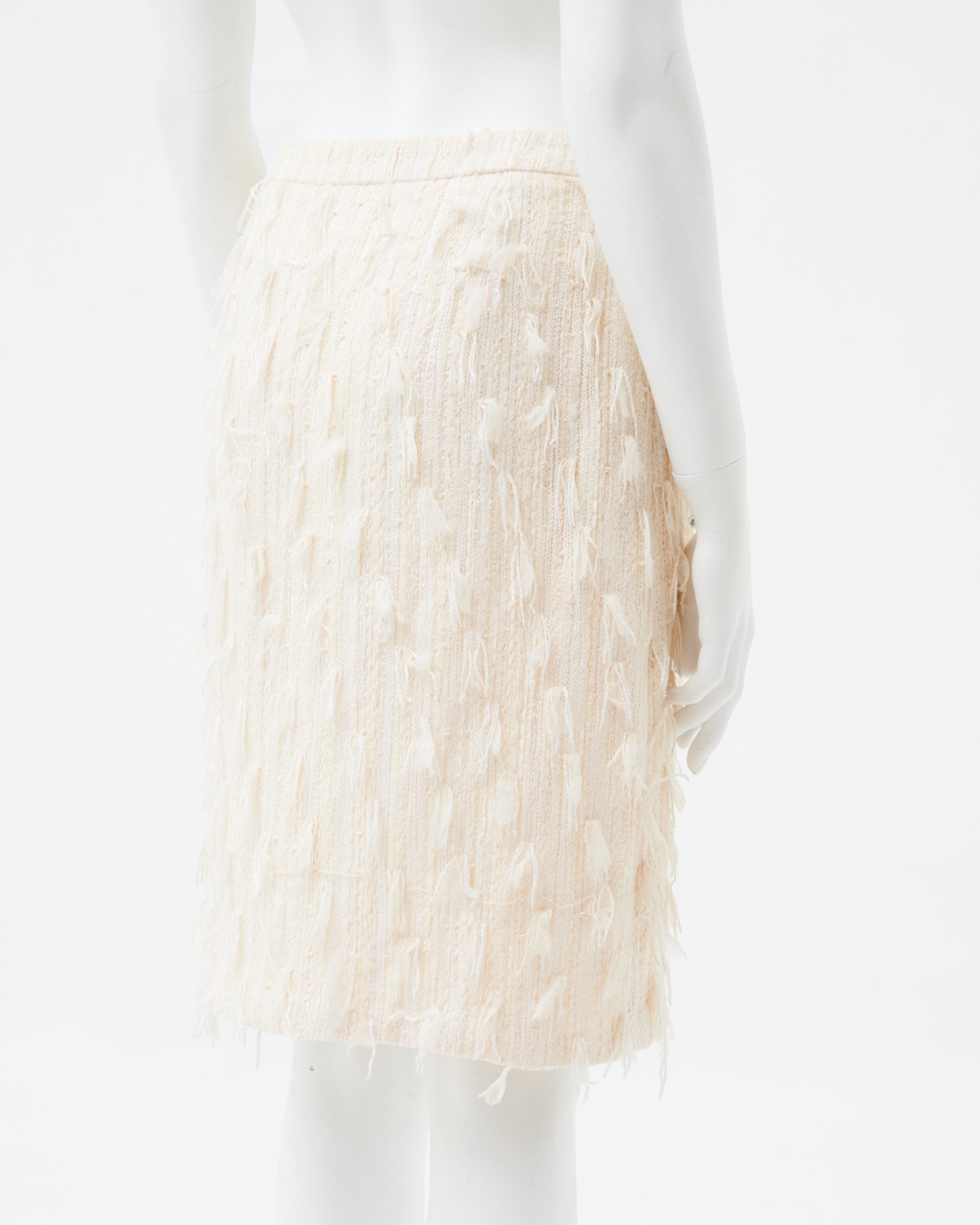 - Cream/ivory textured fabric with delicate thread fringing throughout the surface