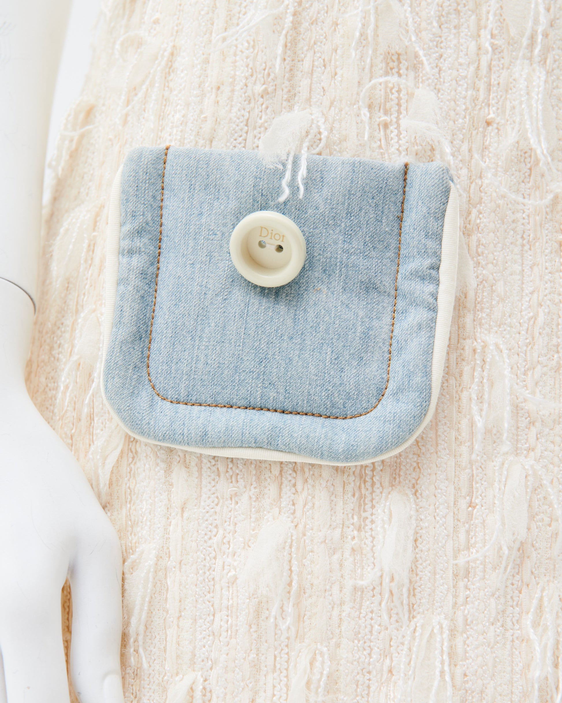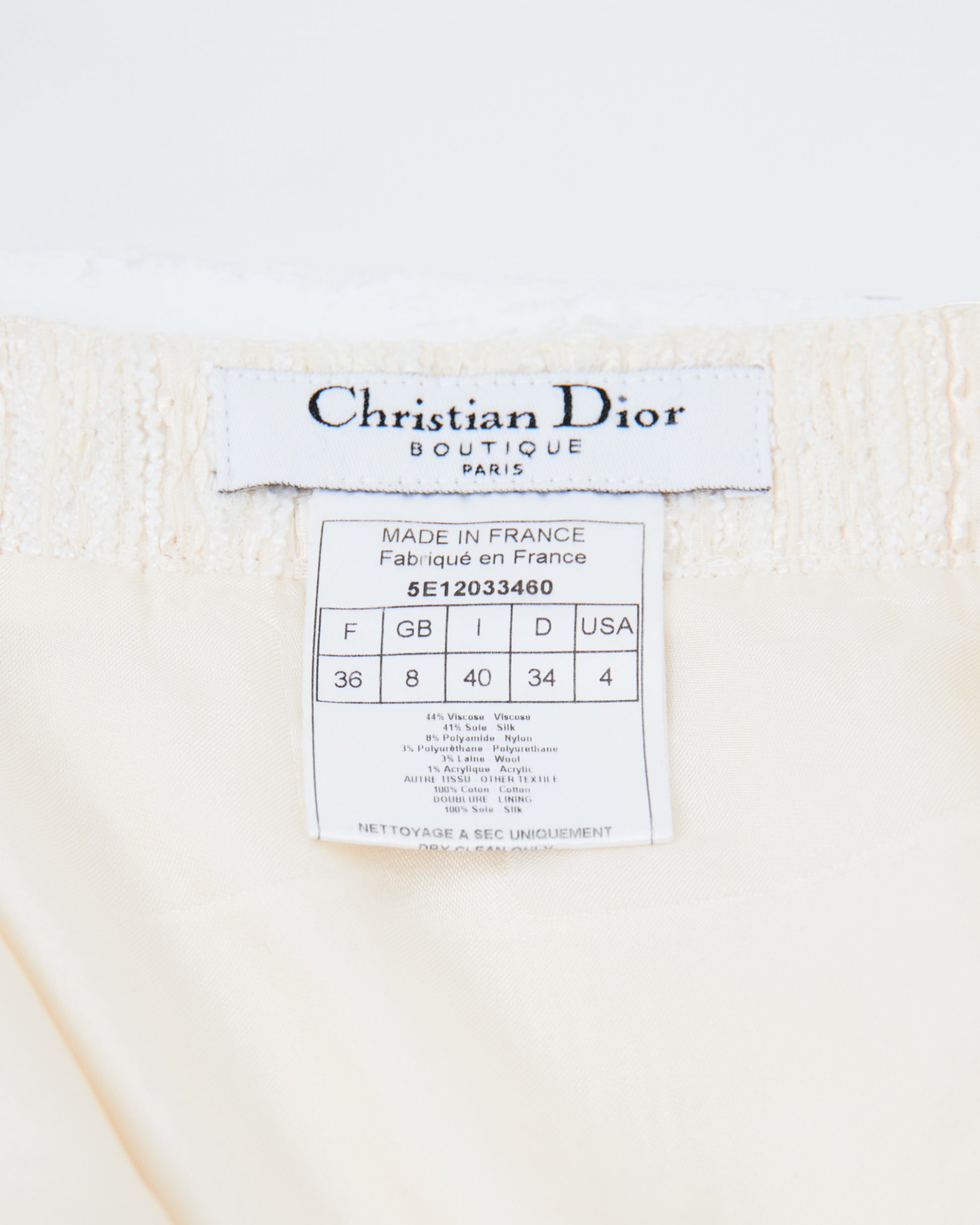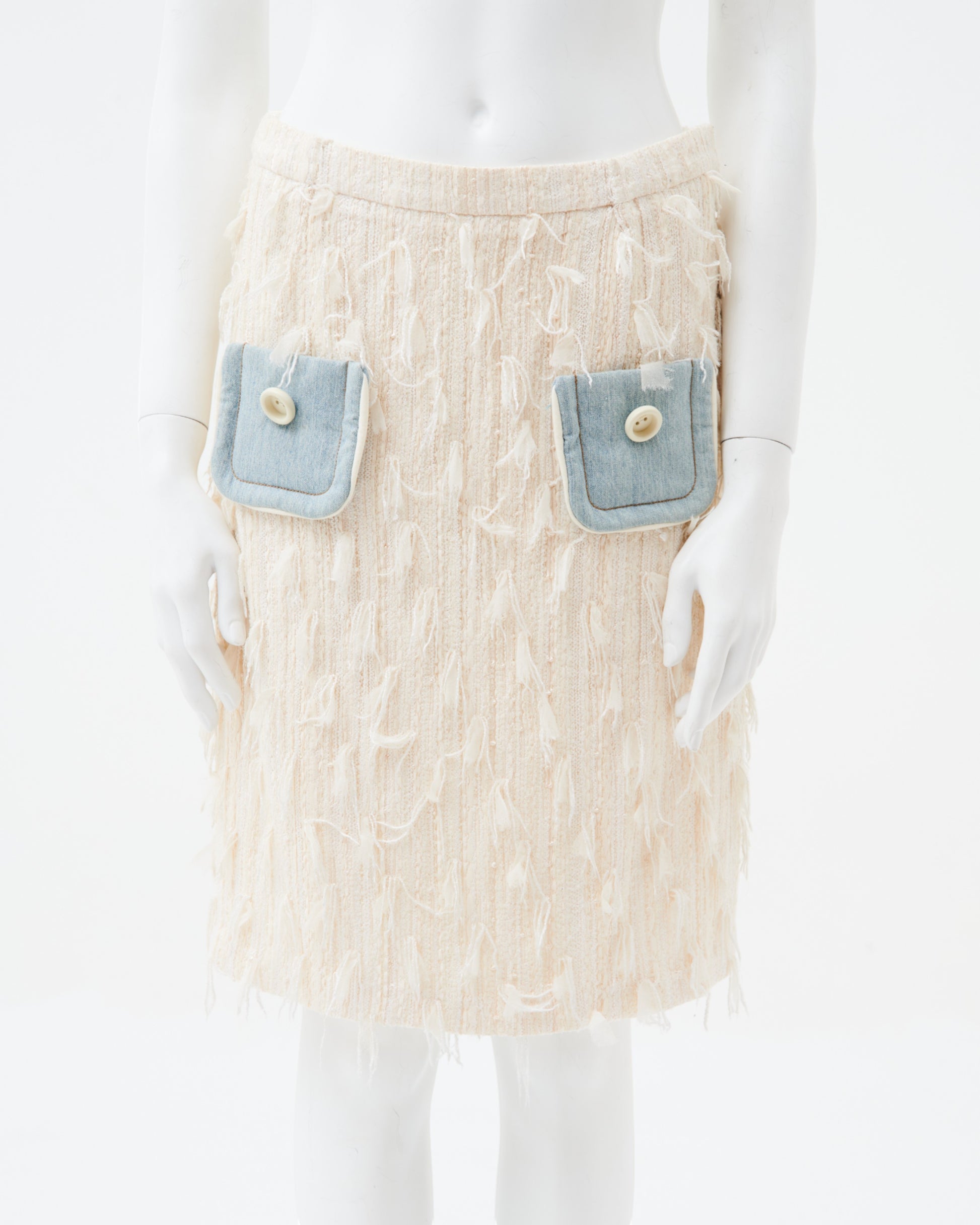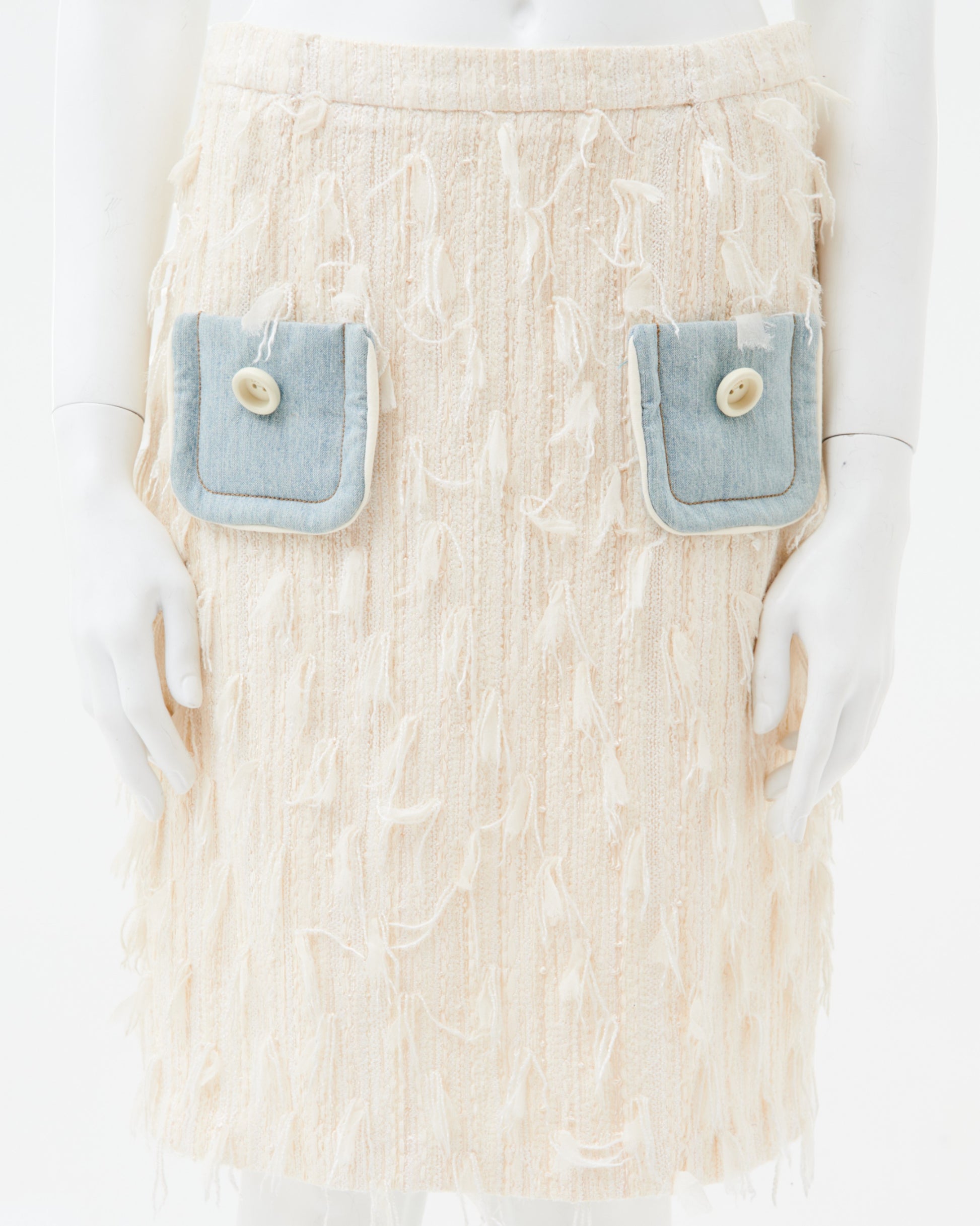 - Cream/ivory textured fabric with delicate thread fringing throughout the surface