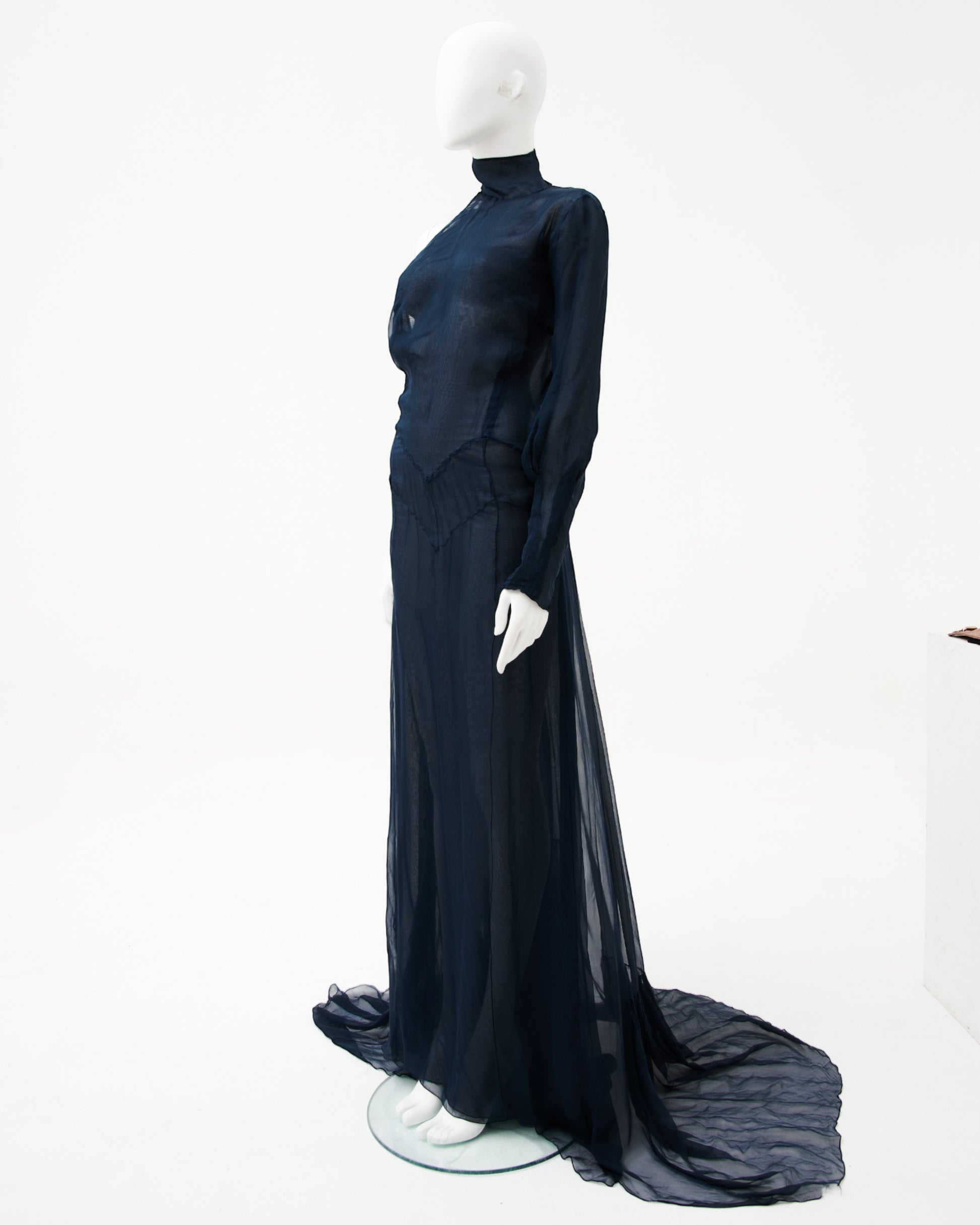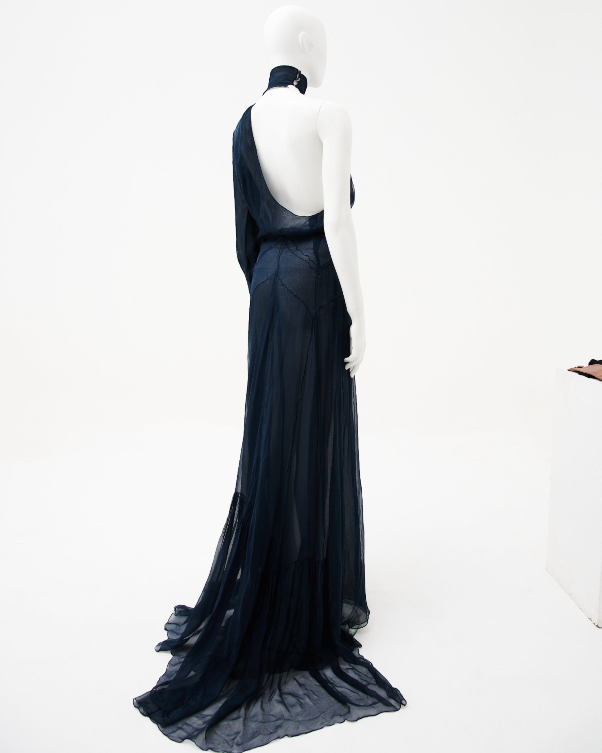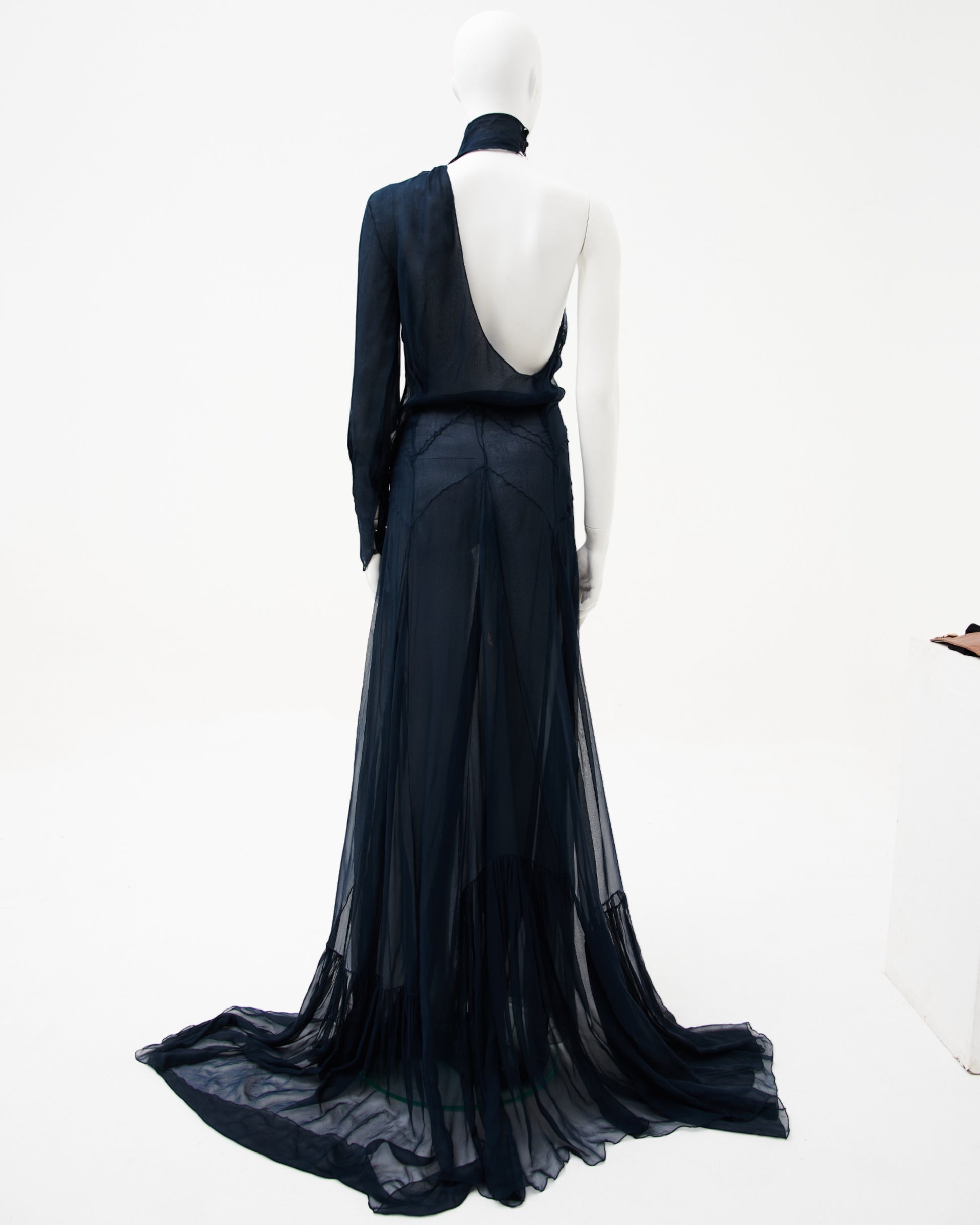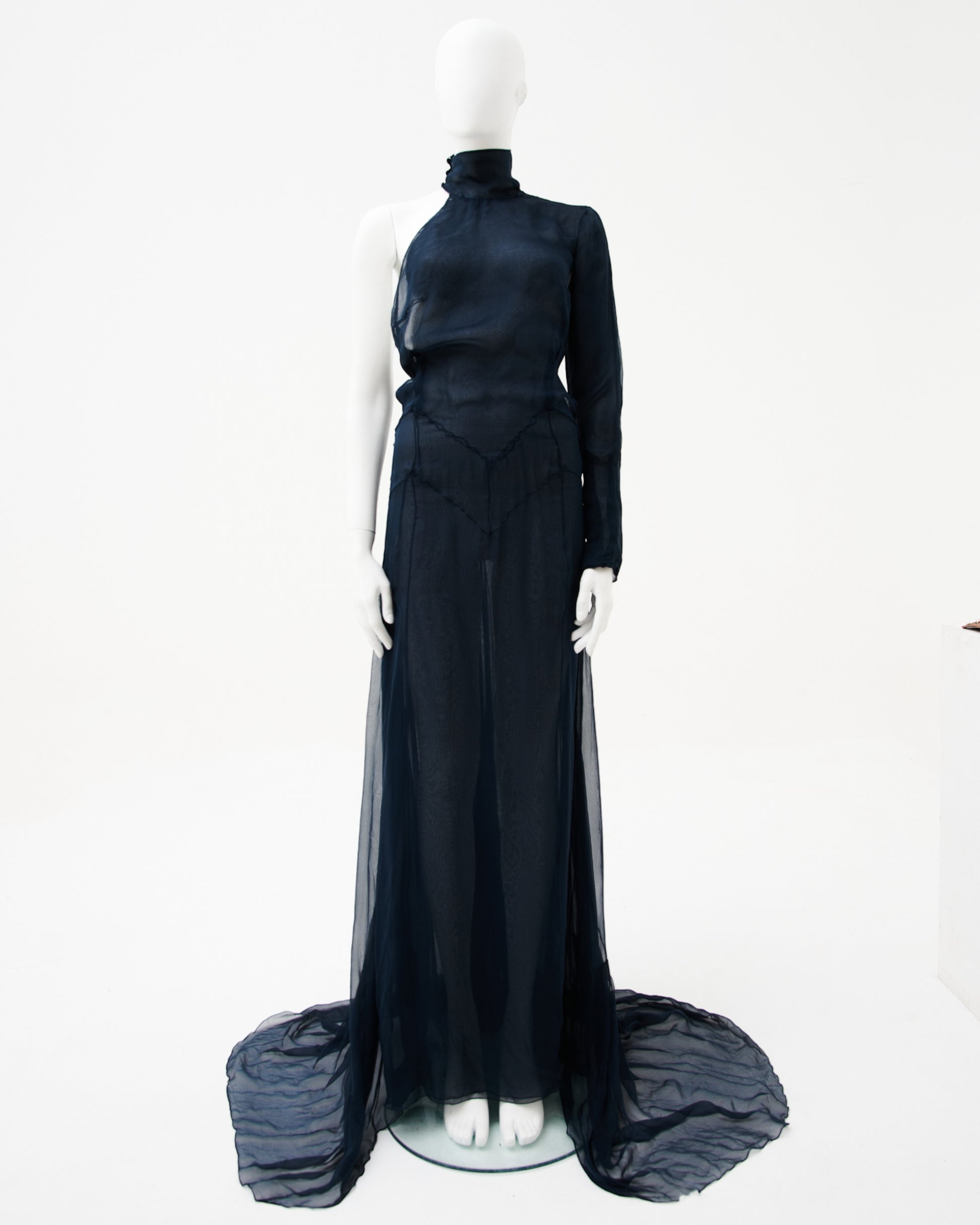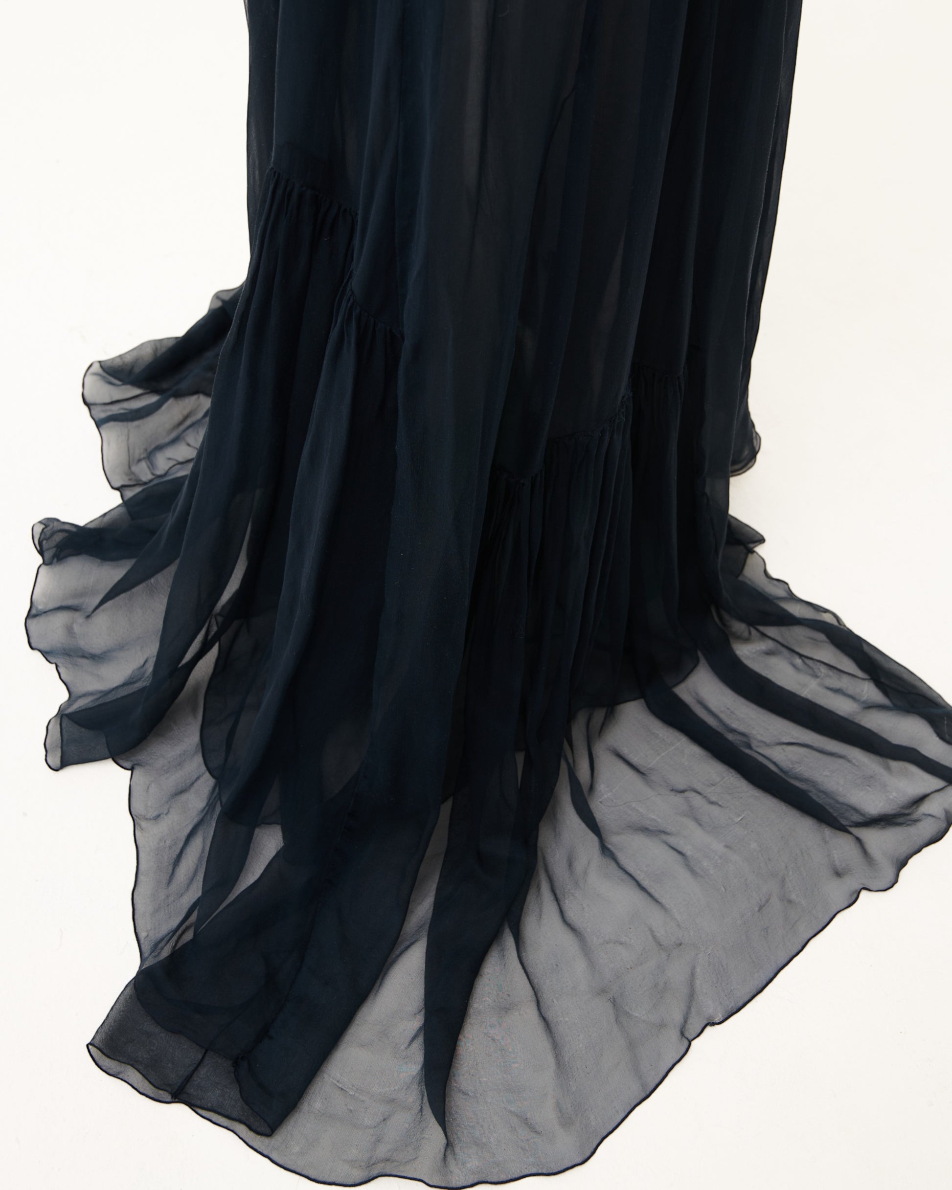 - Floor-length silhouette with a flowing train of gathered chiffon