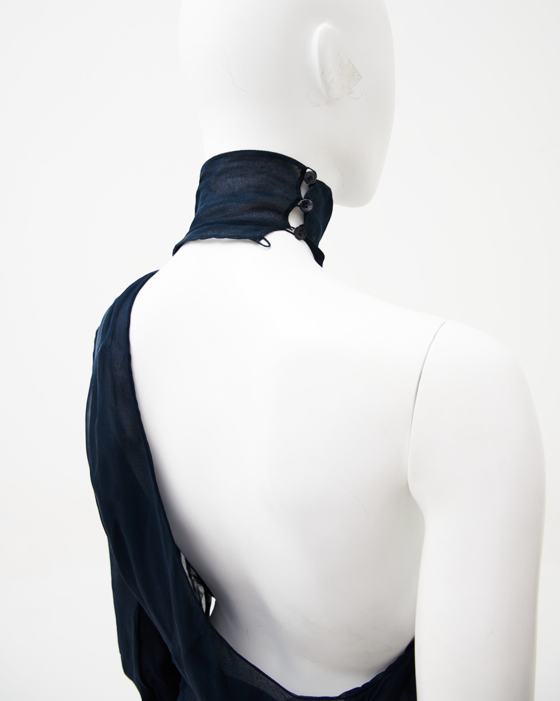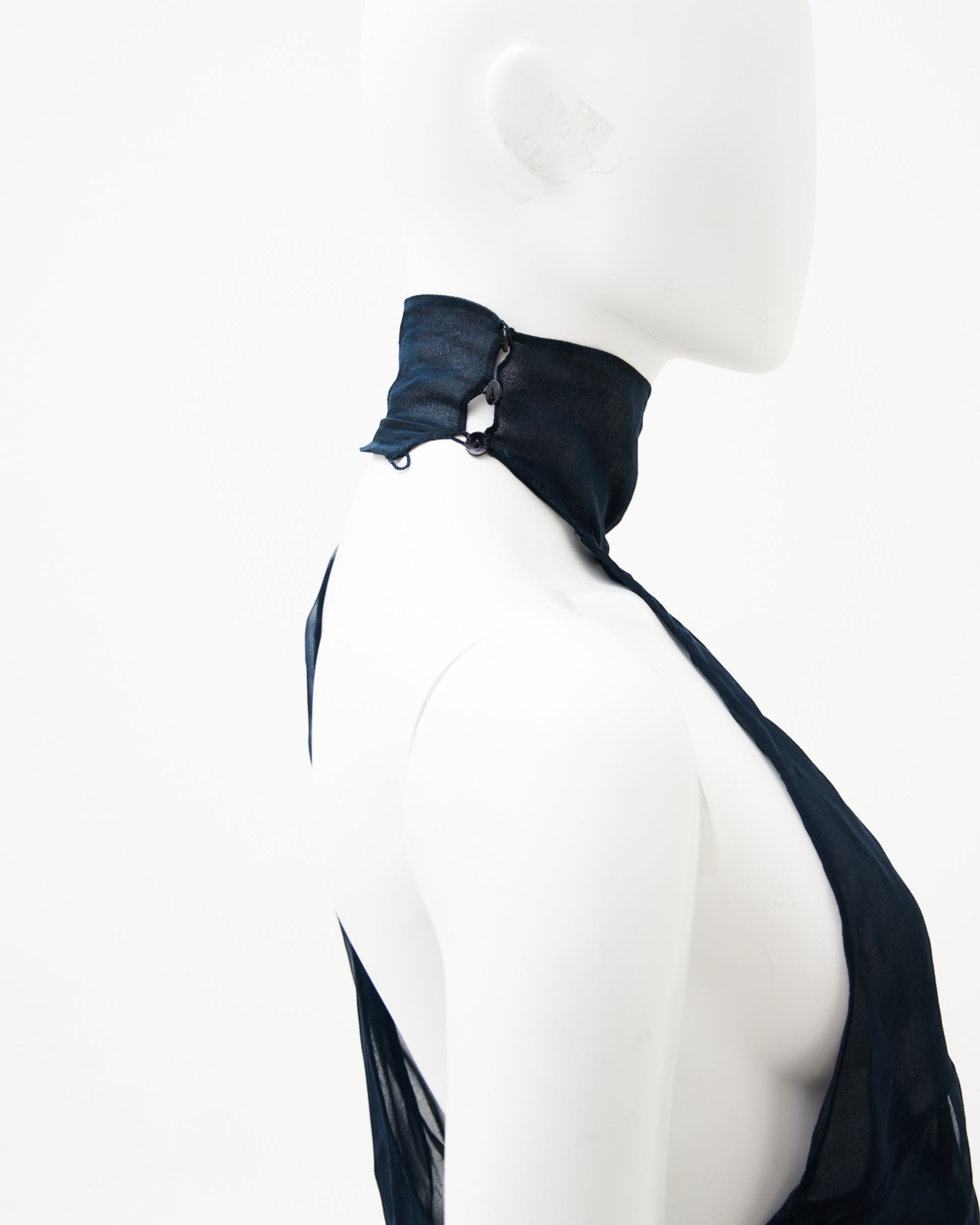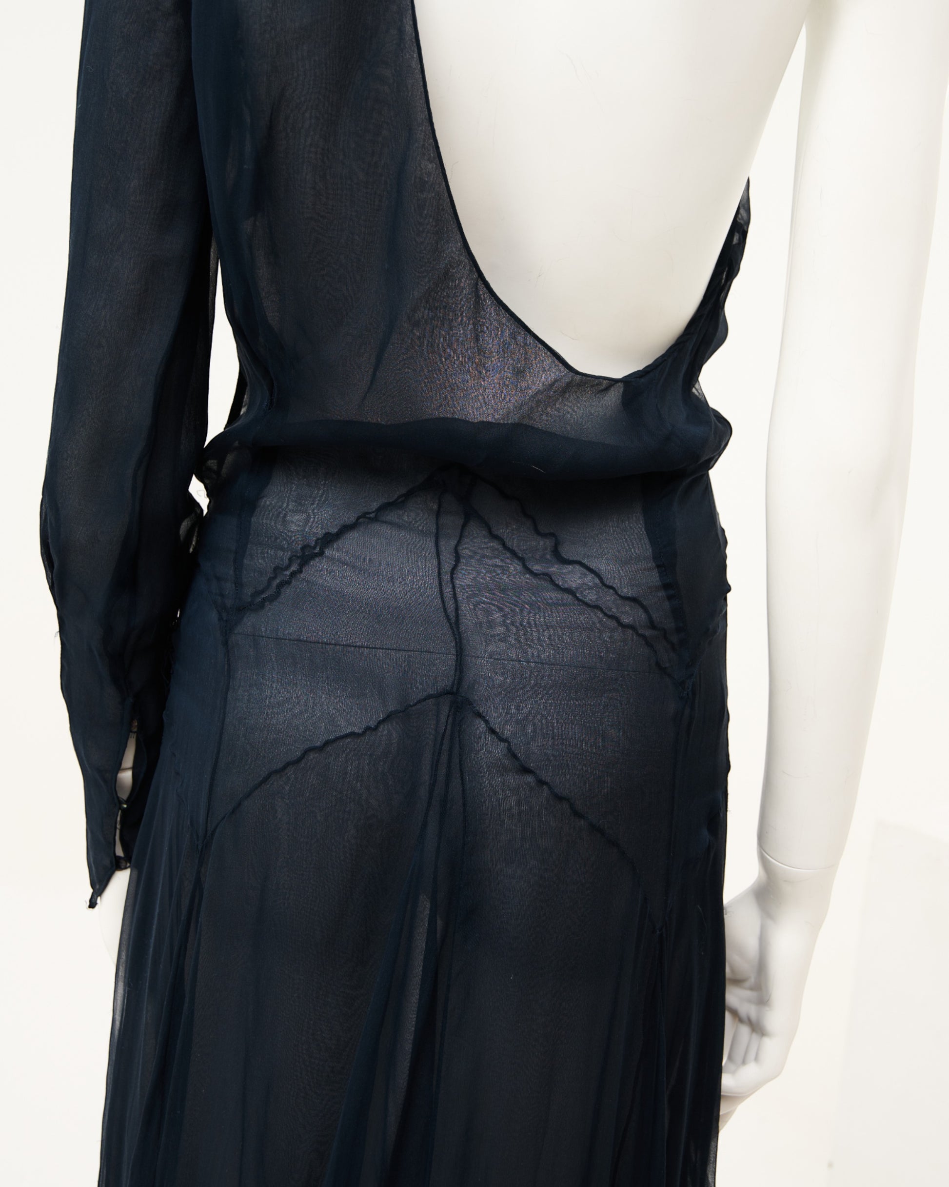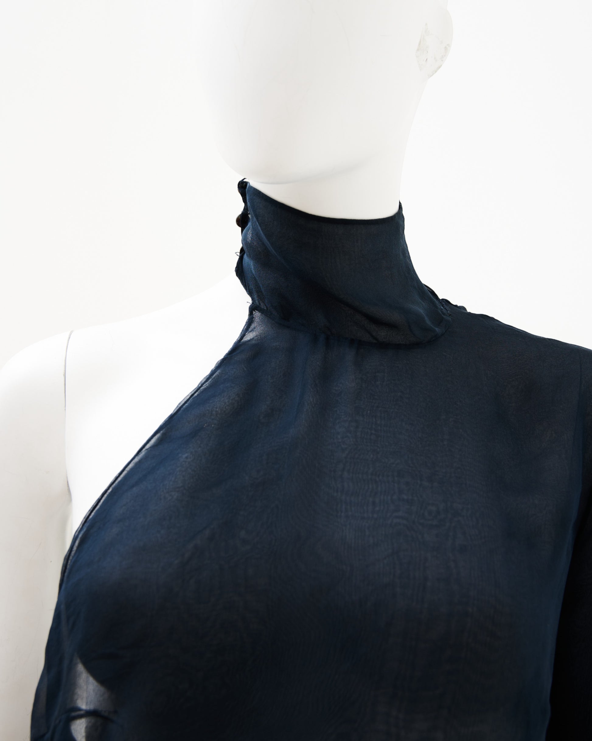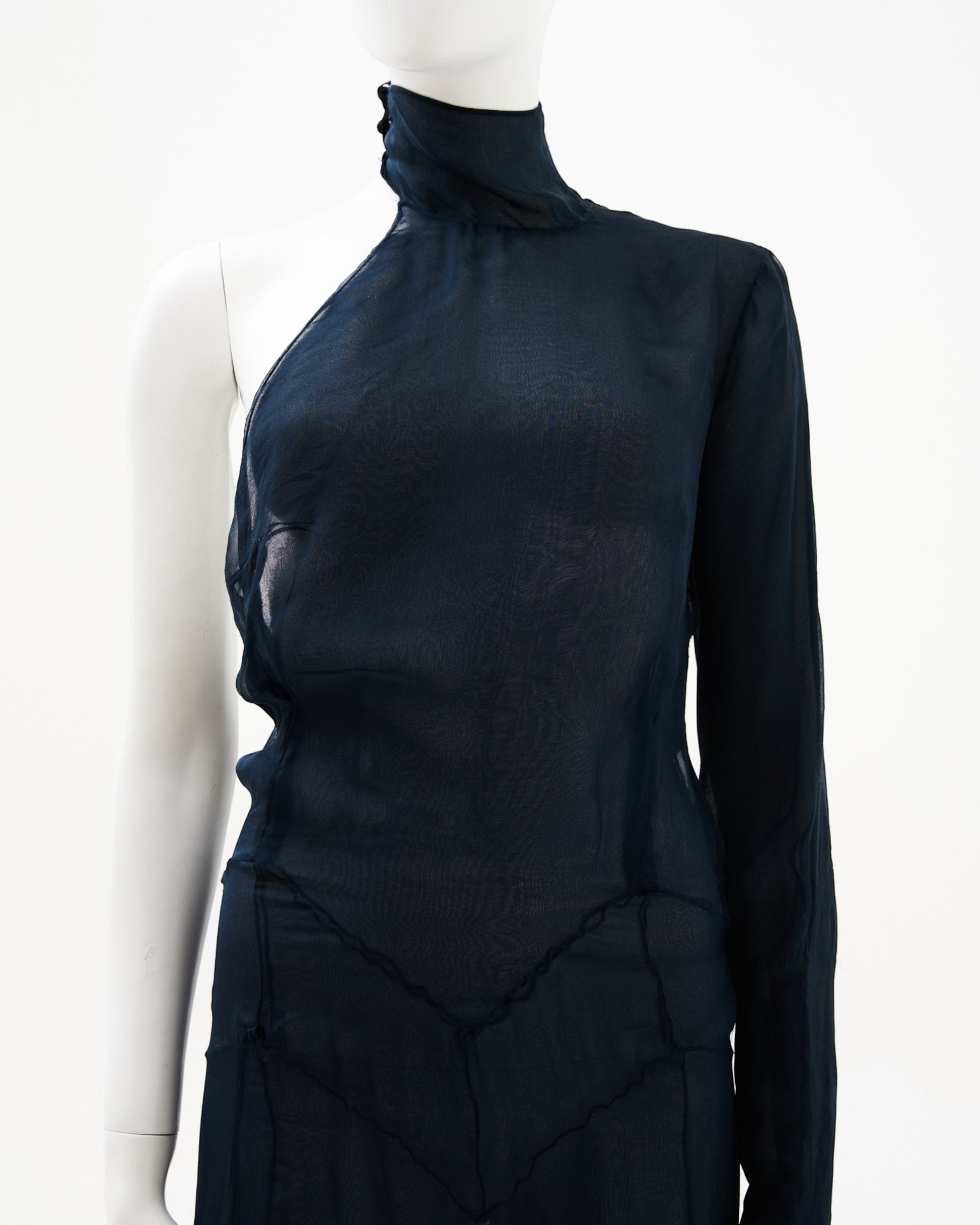 - Floor-length silhouette with a flowing train of gathered chiffon