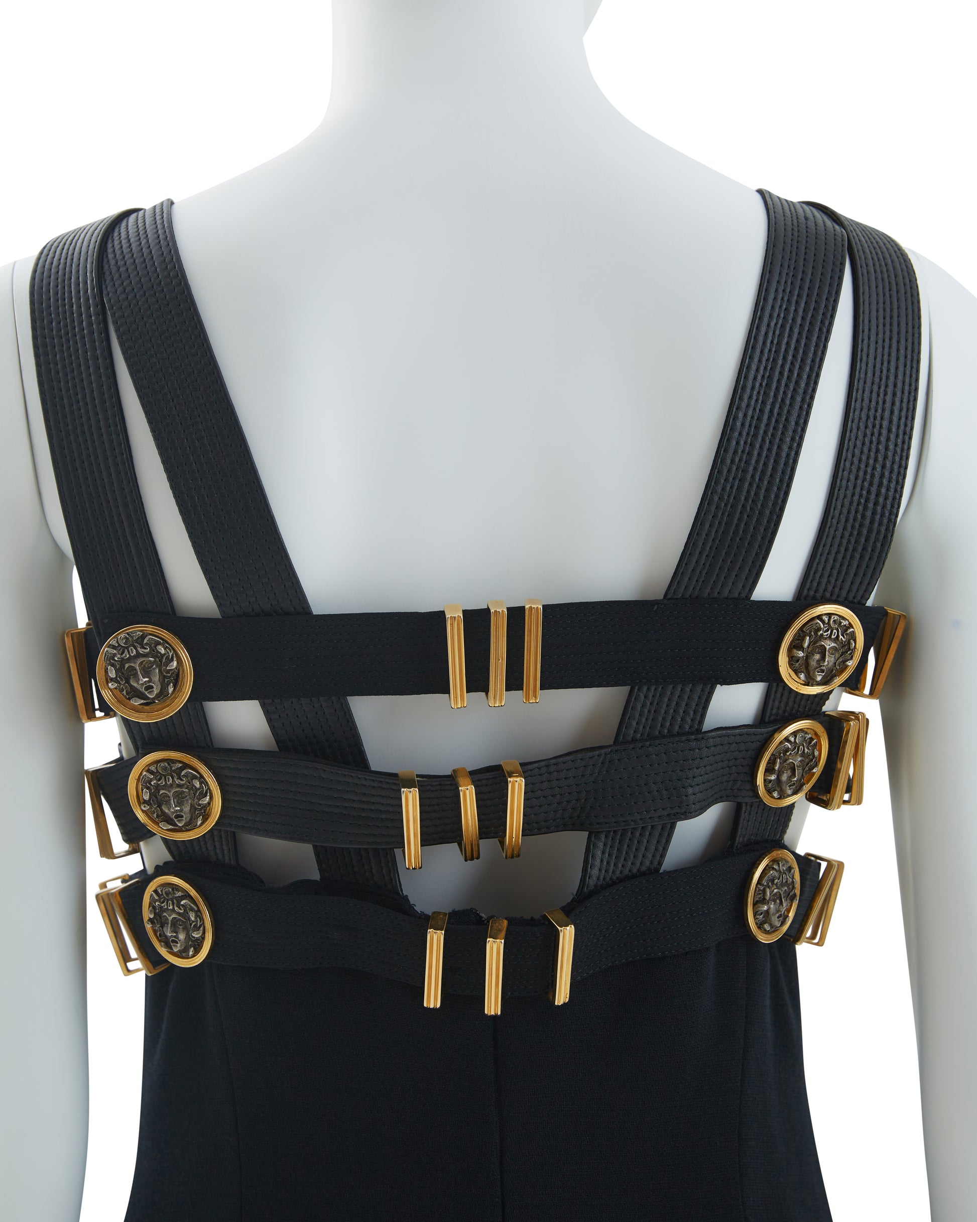 - Gilded buckle straps at the sides and back
