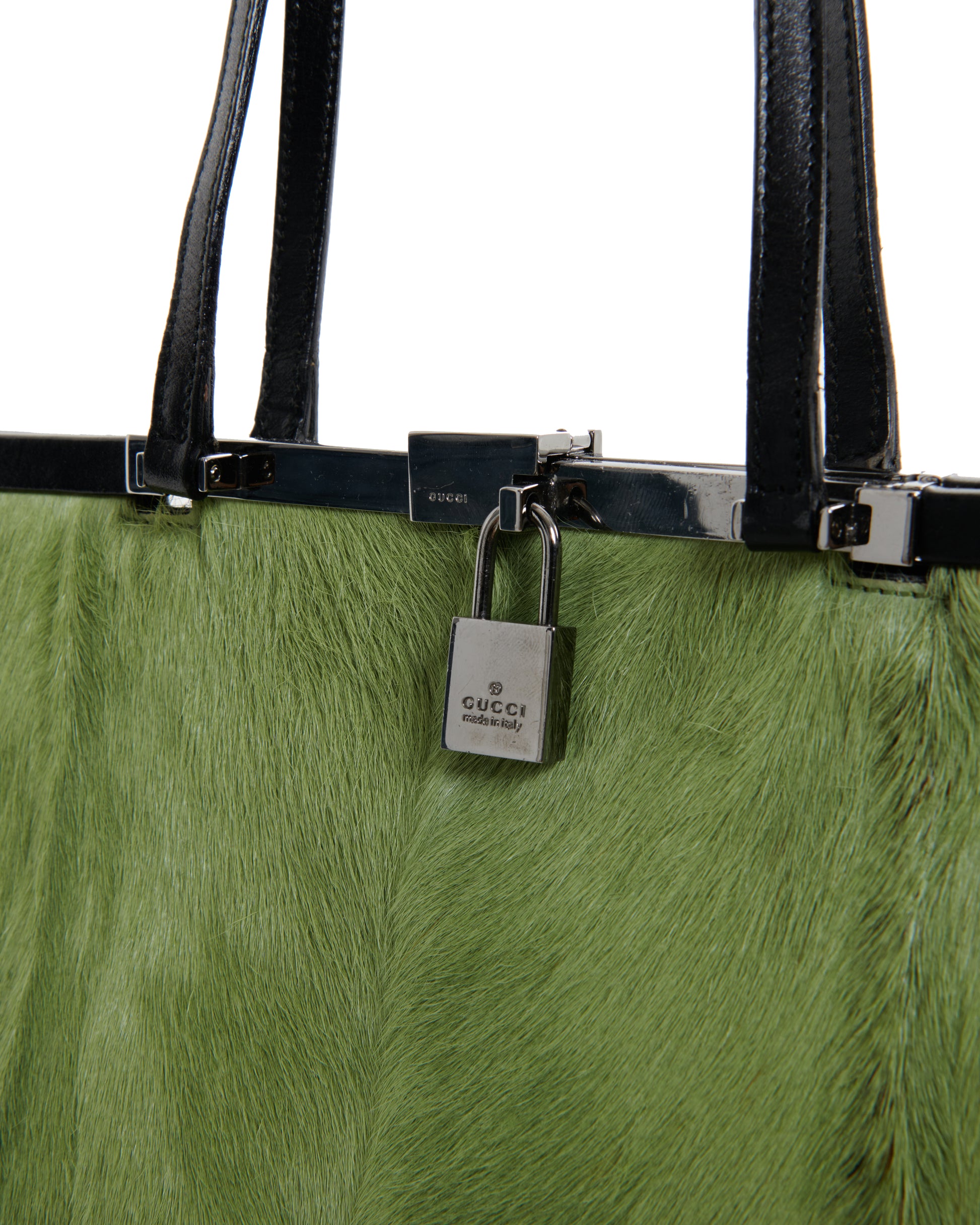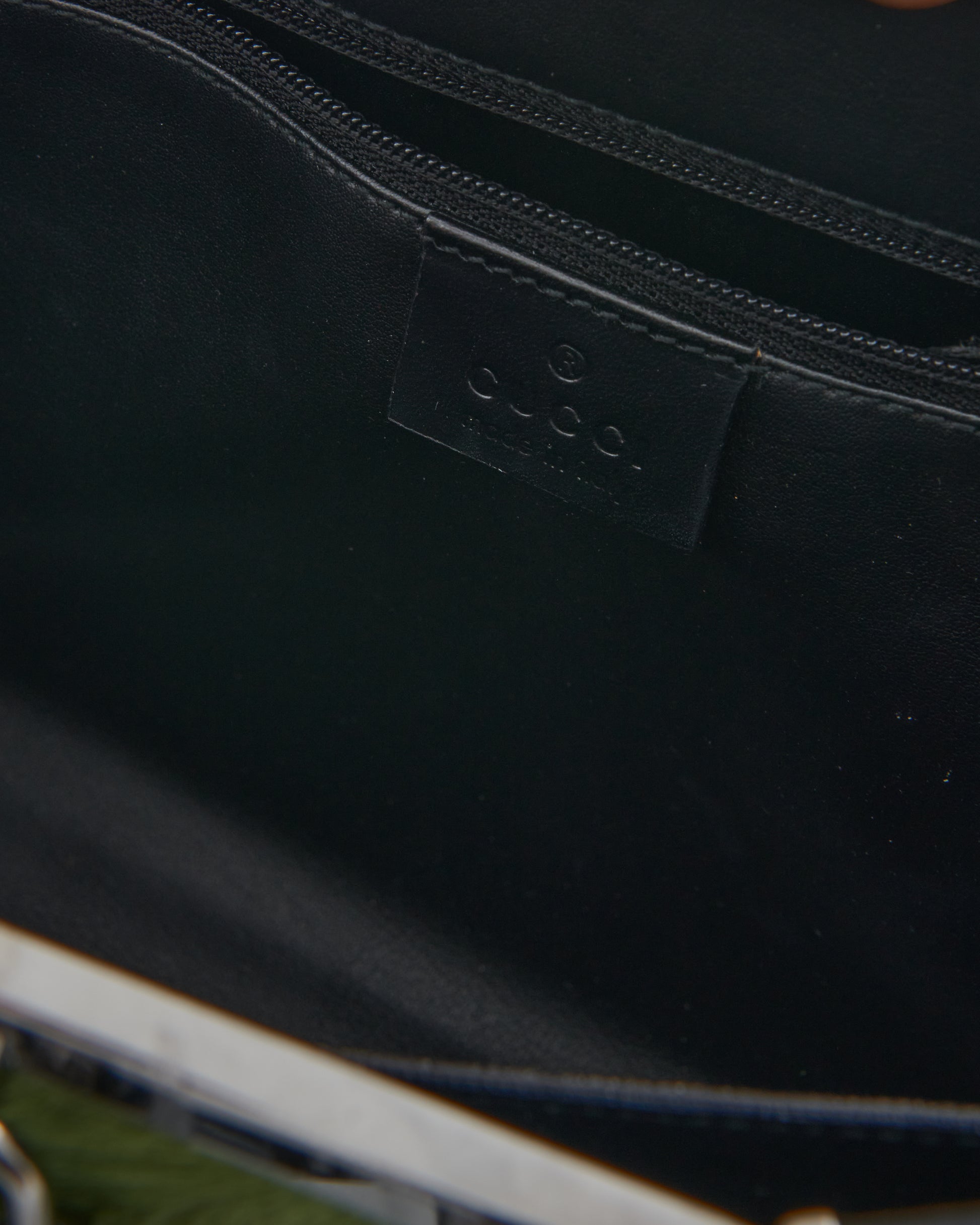 - Silver-toned metal padlock with engraved “Gucci” at front