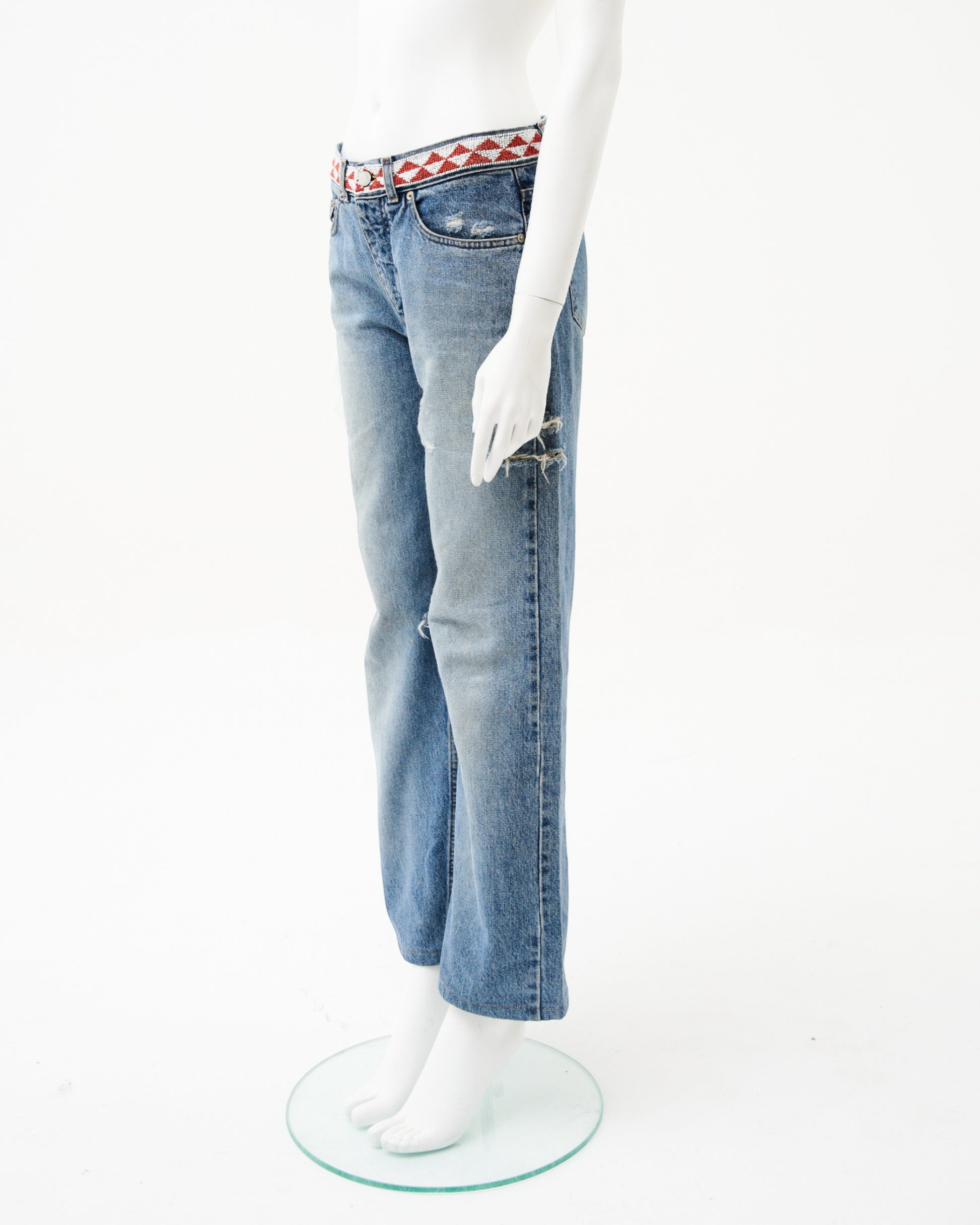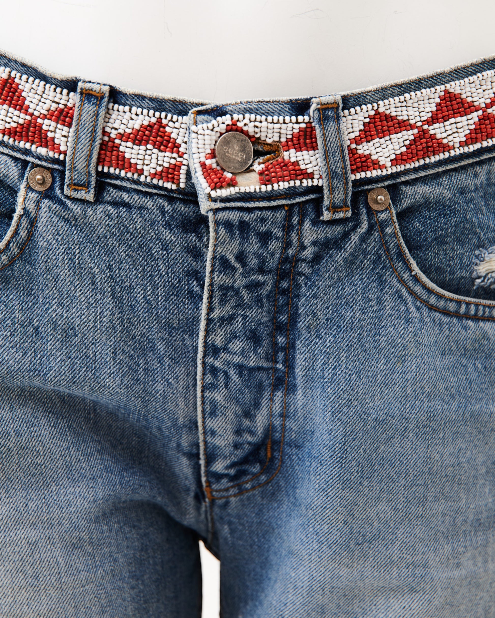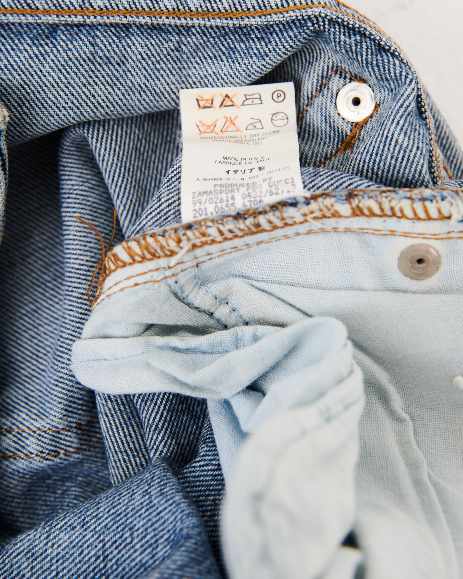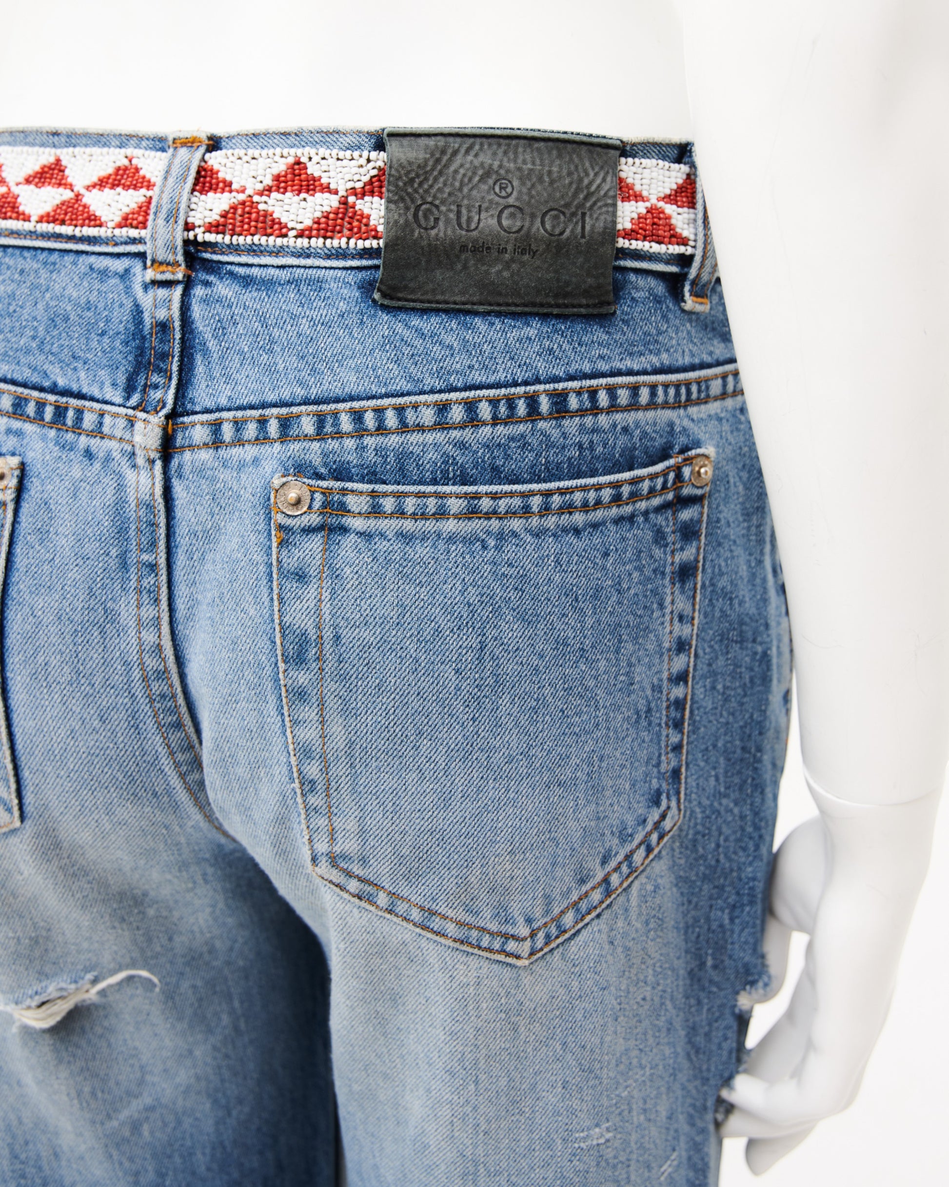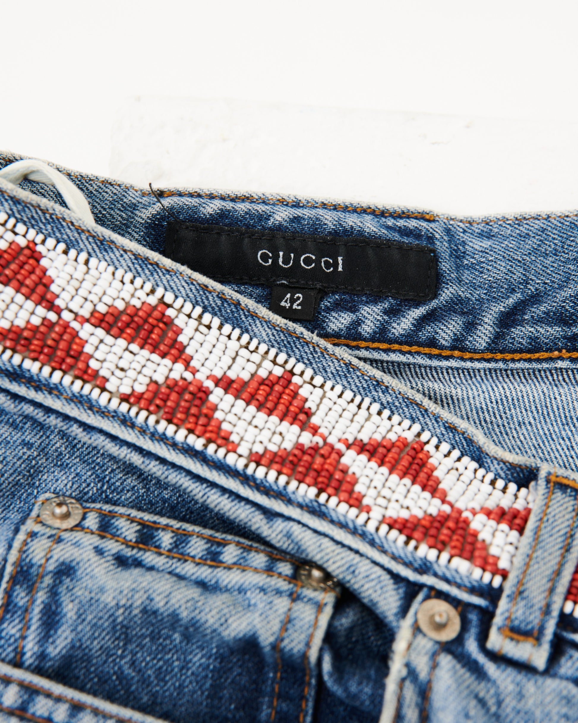 - Black leather Gucci patch on back waistband and engraved metal button closure