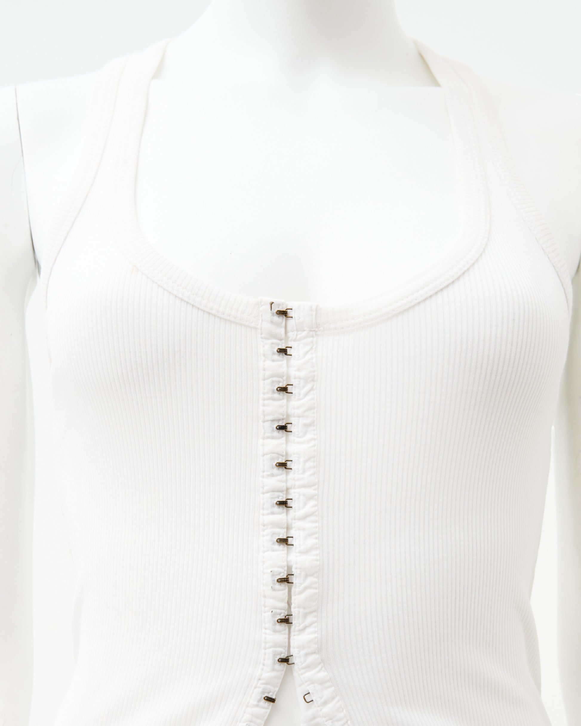 - Vertical row of small metal hook-and-eye closures running down the center front