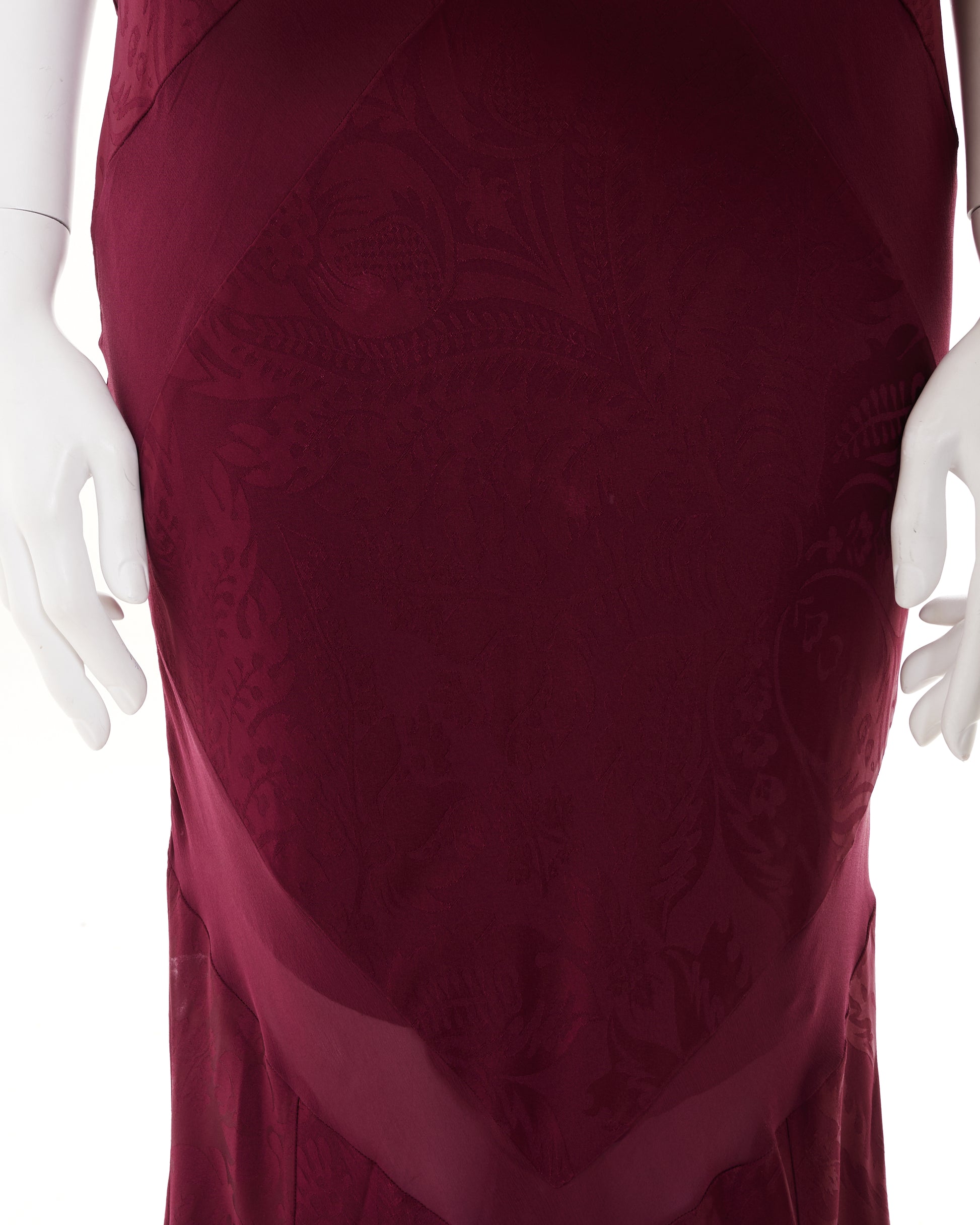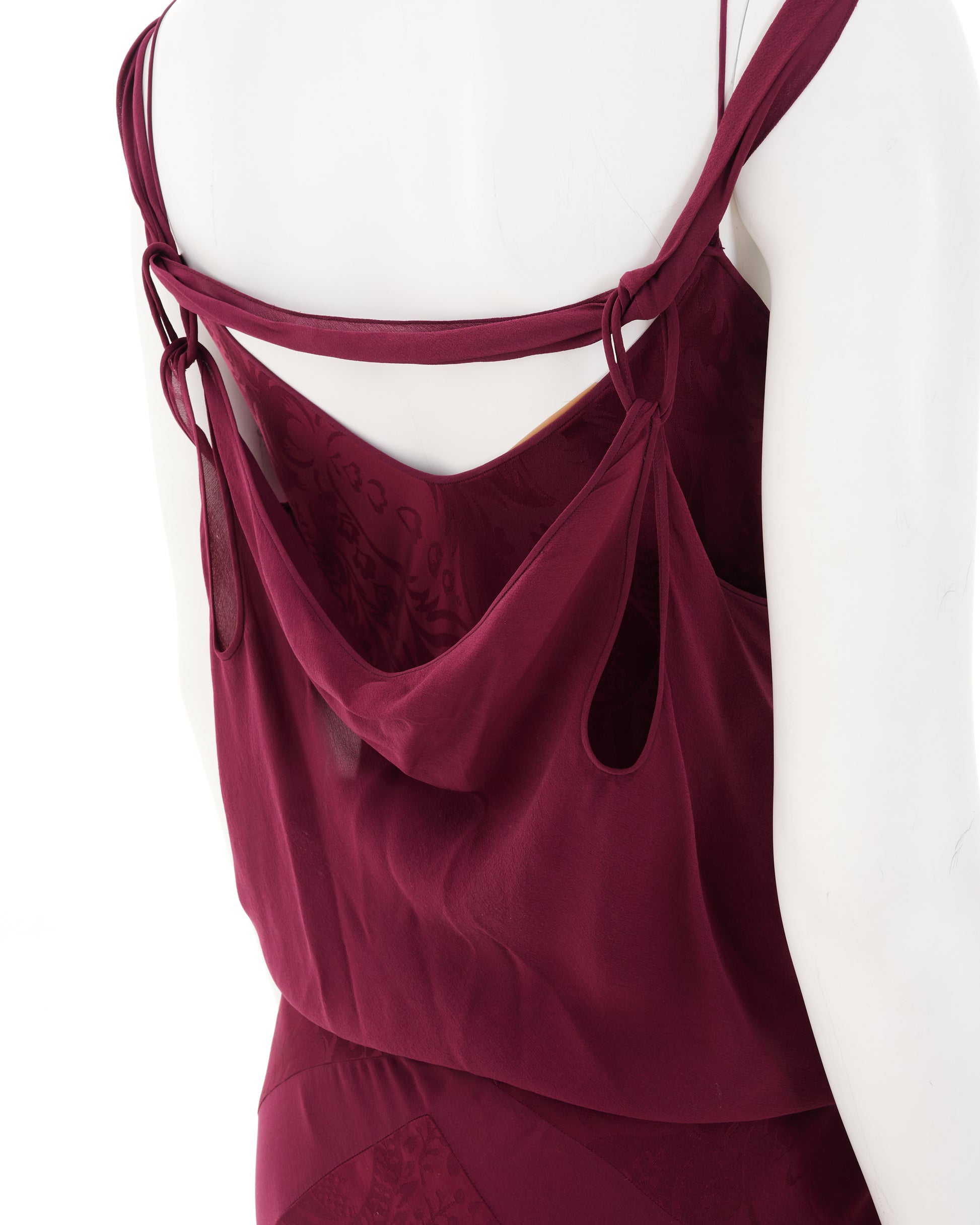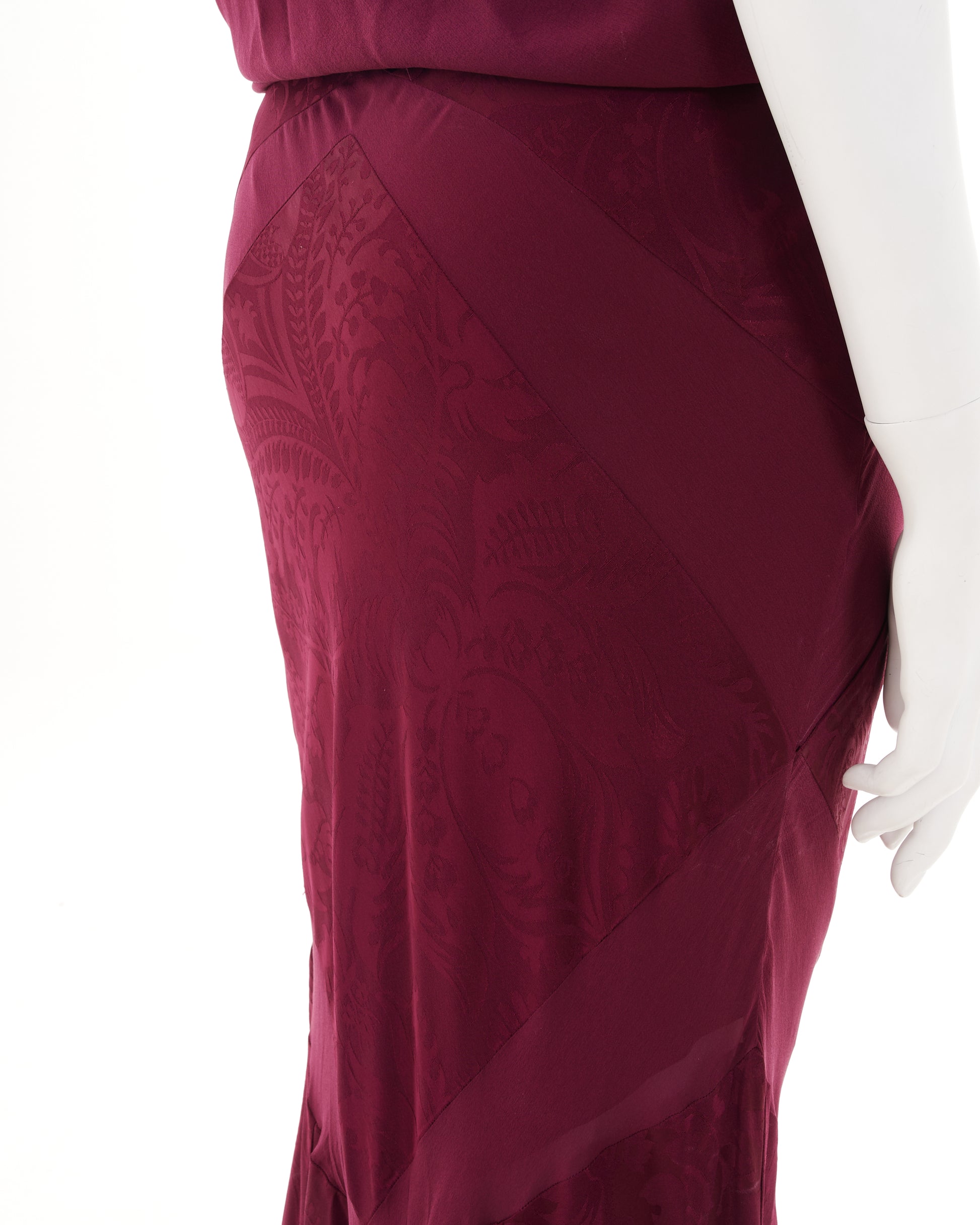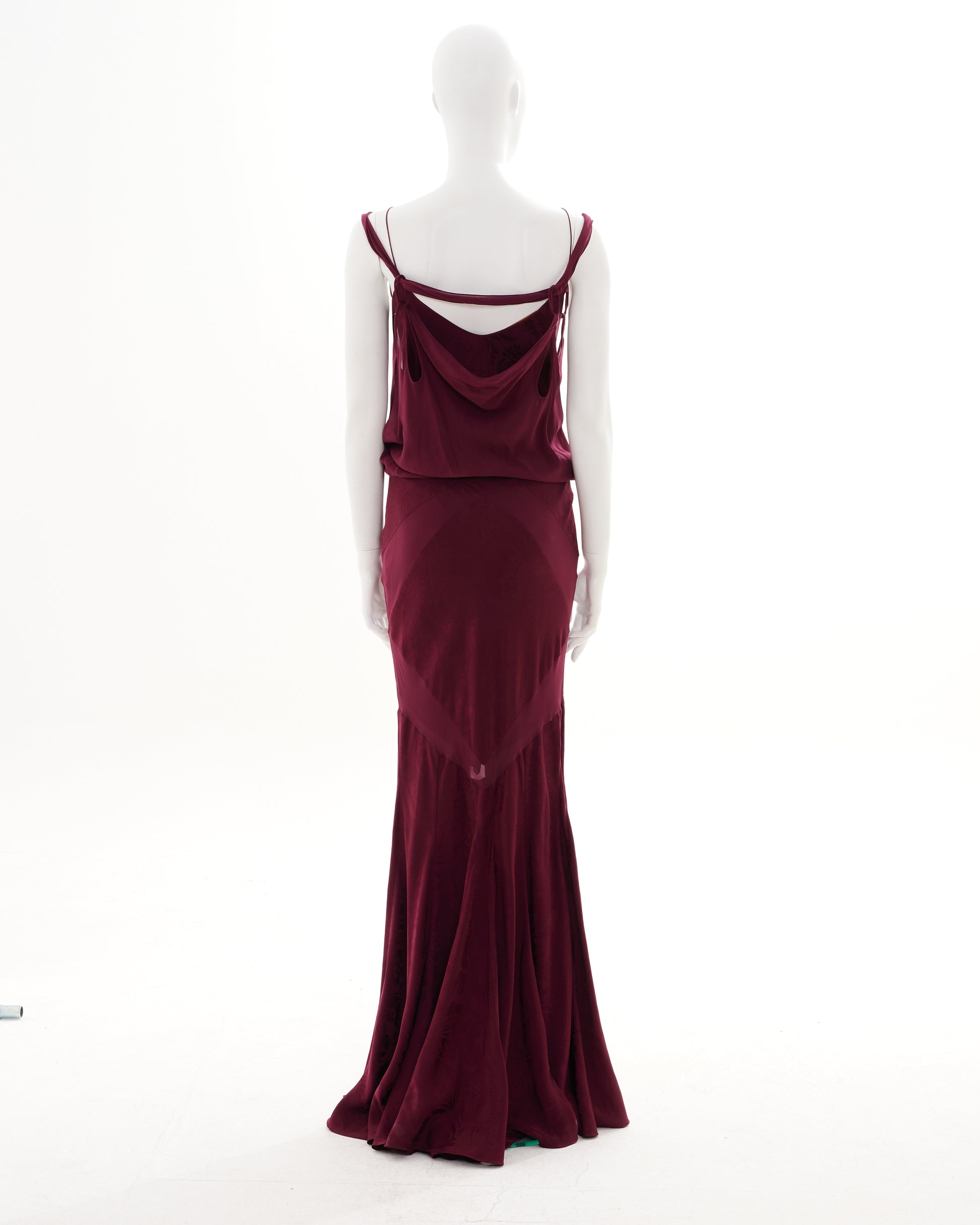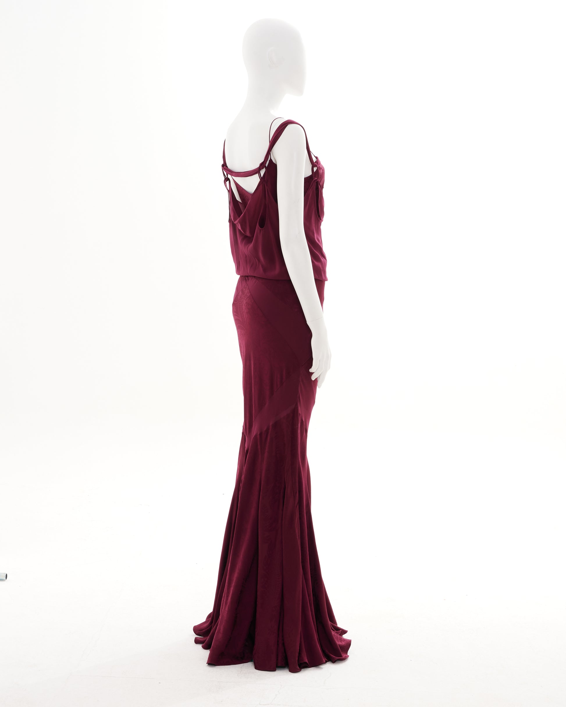 - Bordeaux bias-cut silk evening dress with train