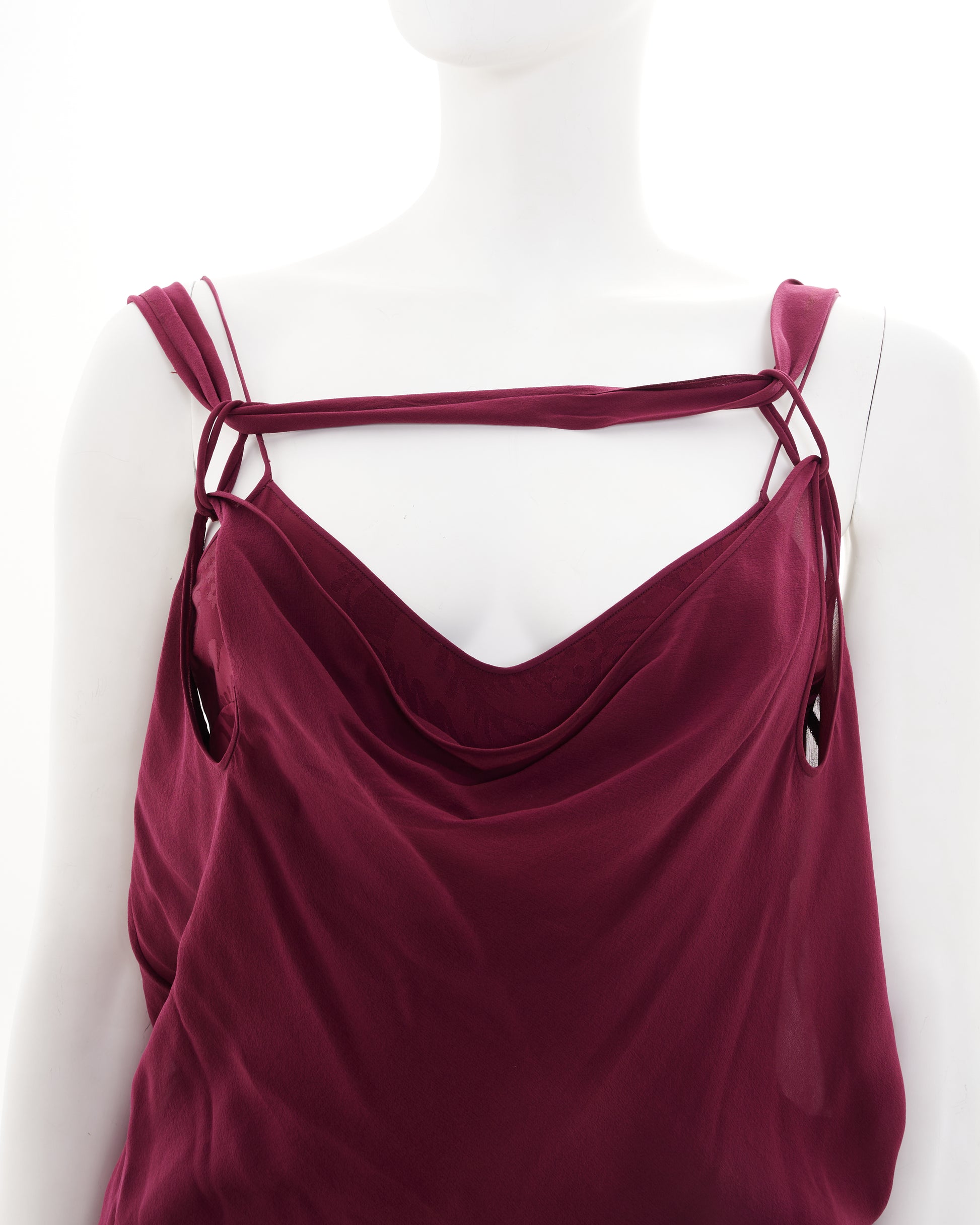 - Bodice with v-neck and spaghetti straps and draped cowl overlay with twisted off-shoulder straps