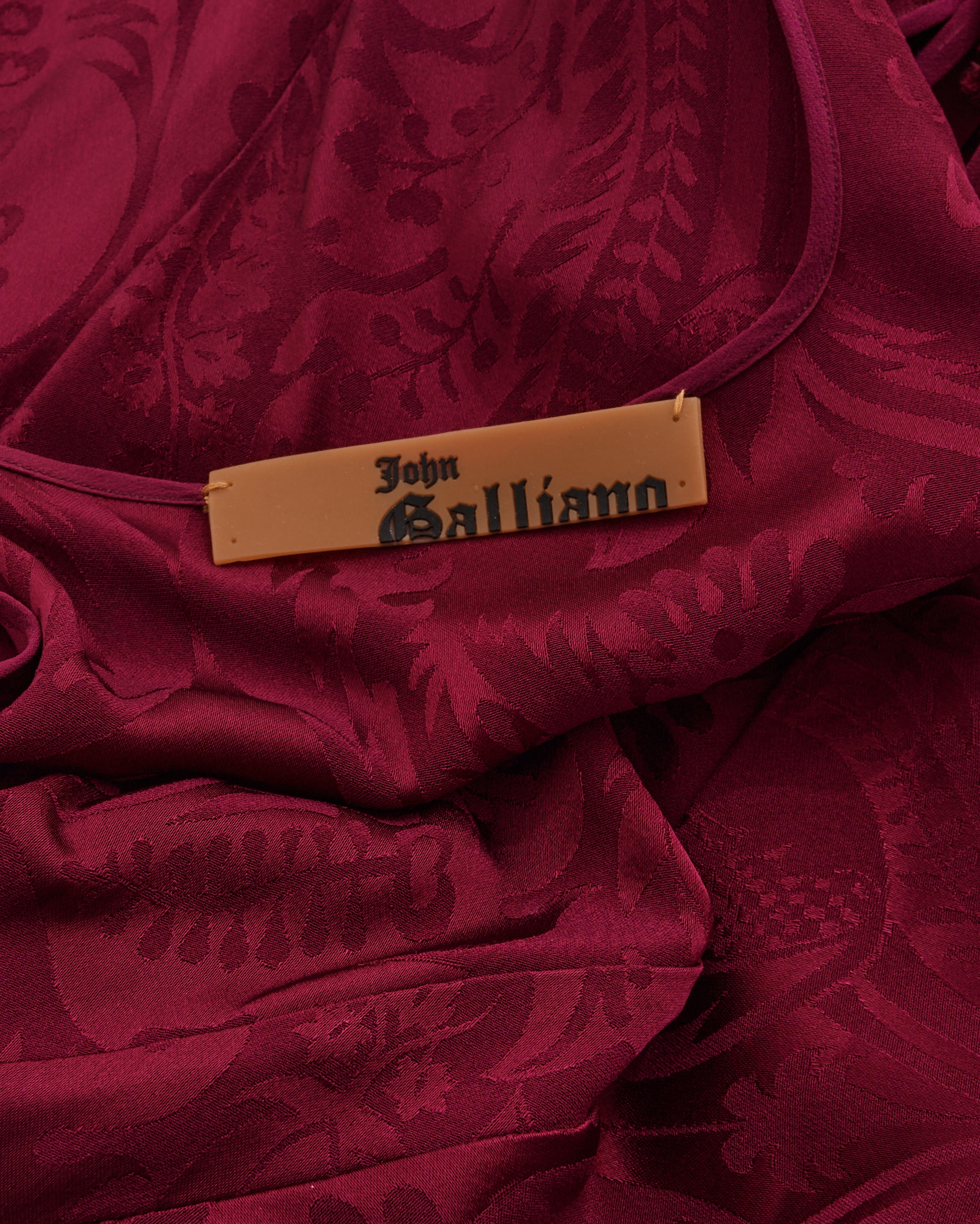- Red crêpe-backed satin with damask motif