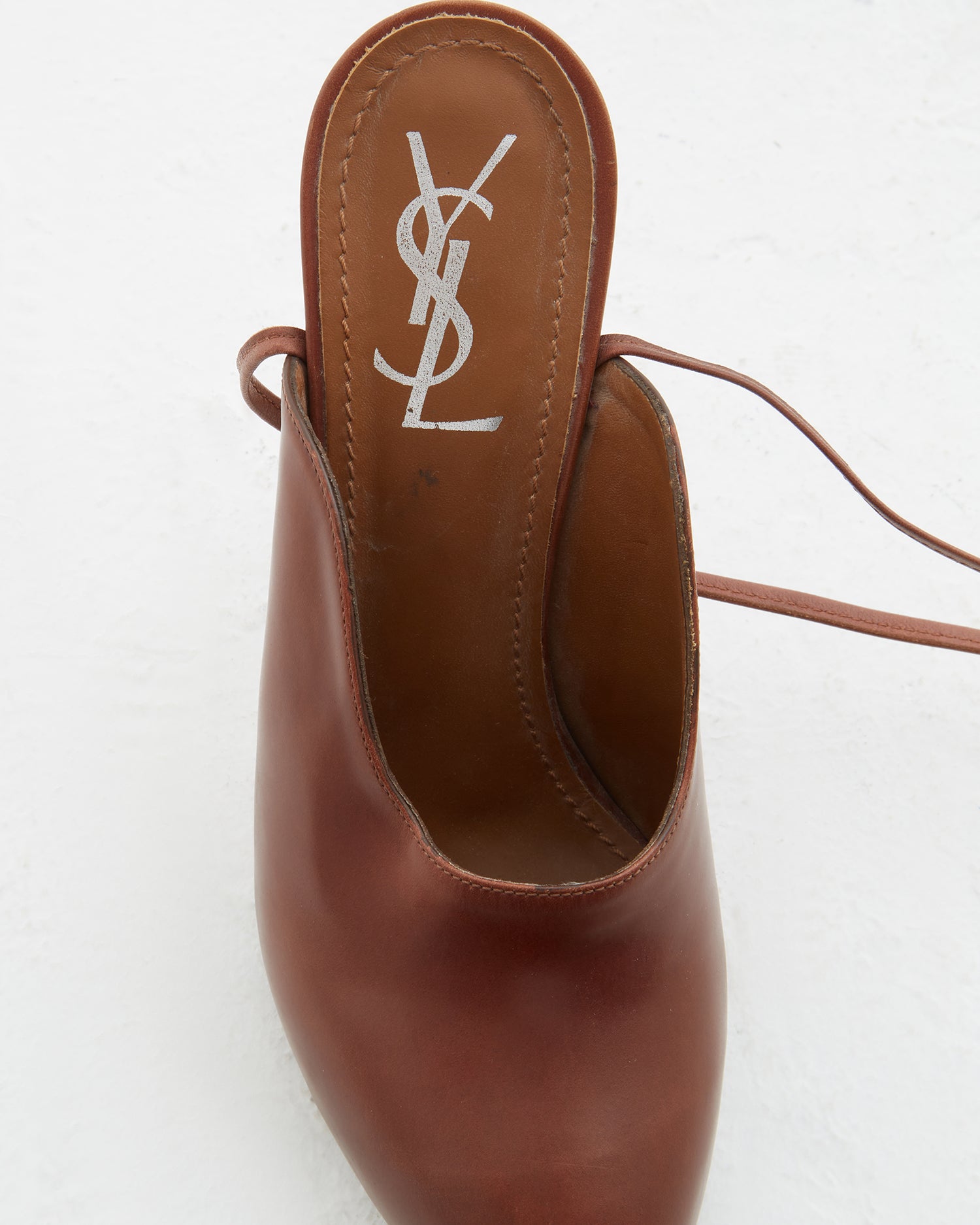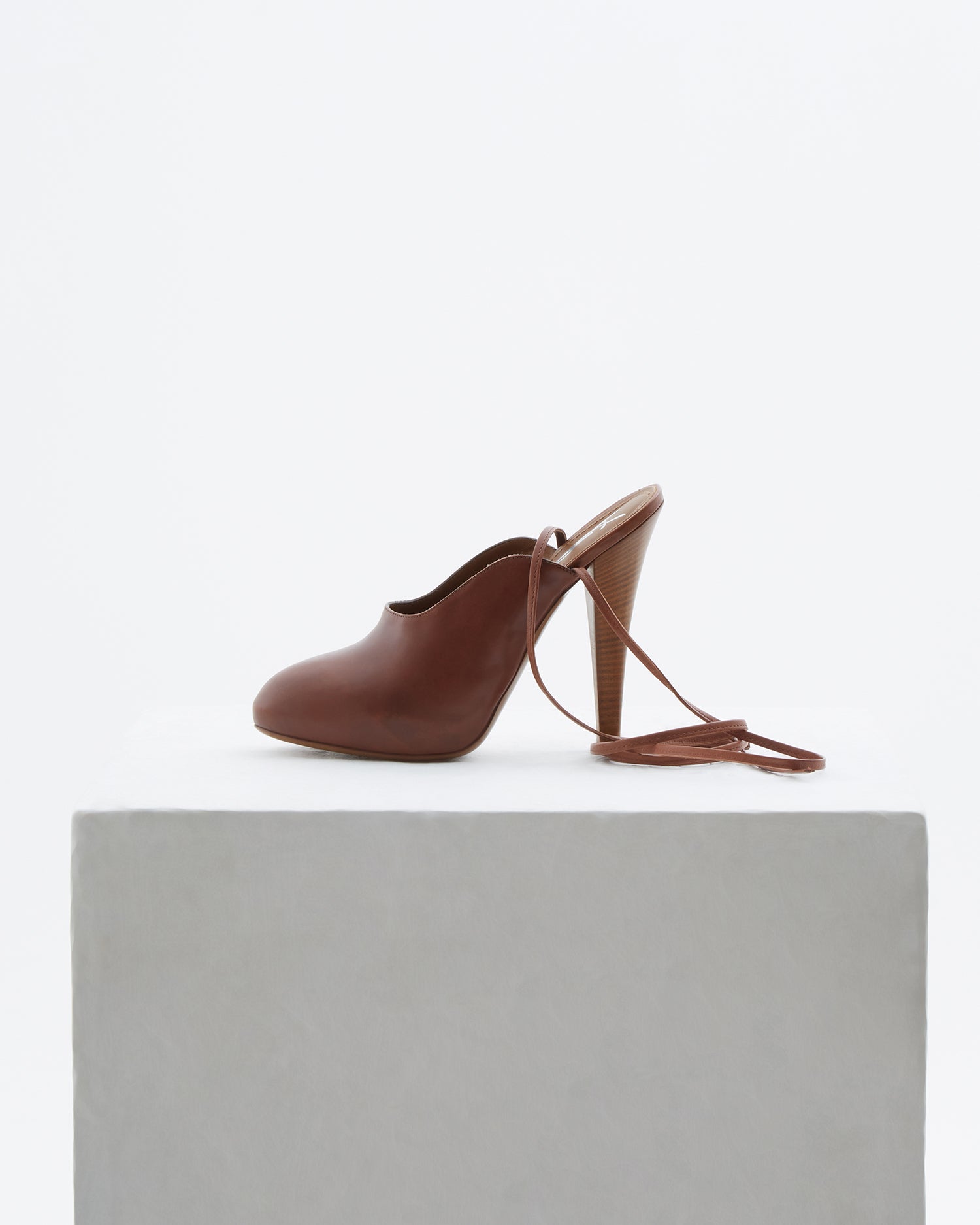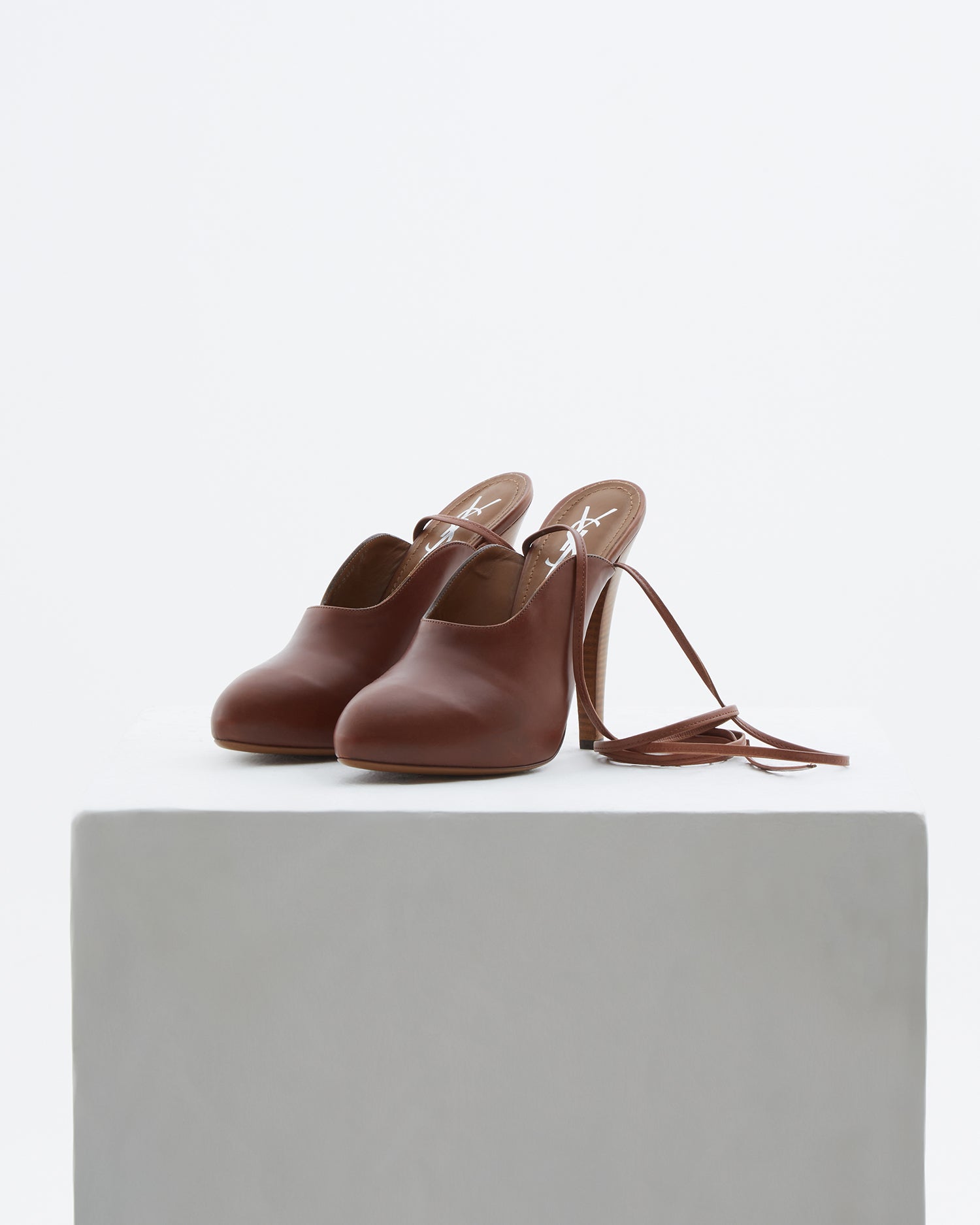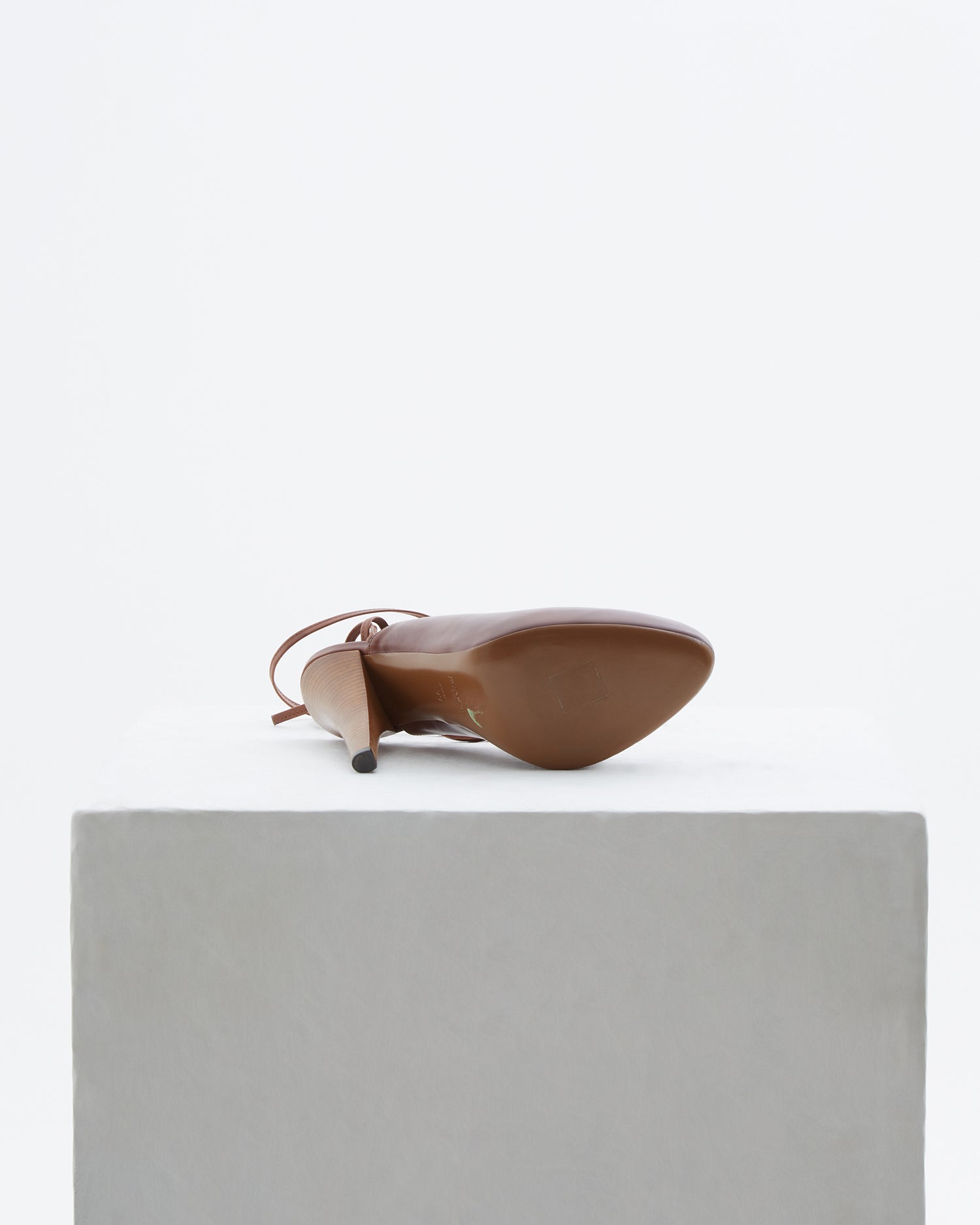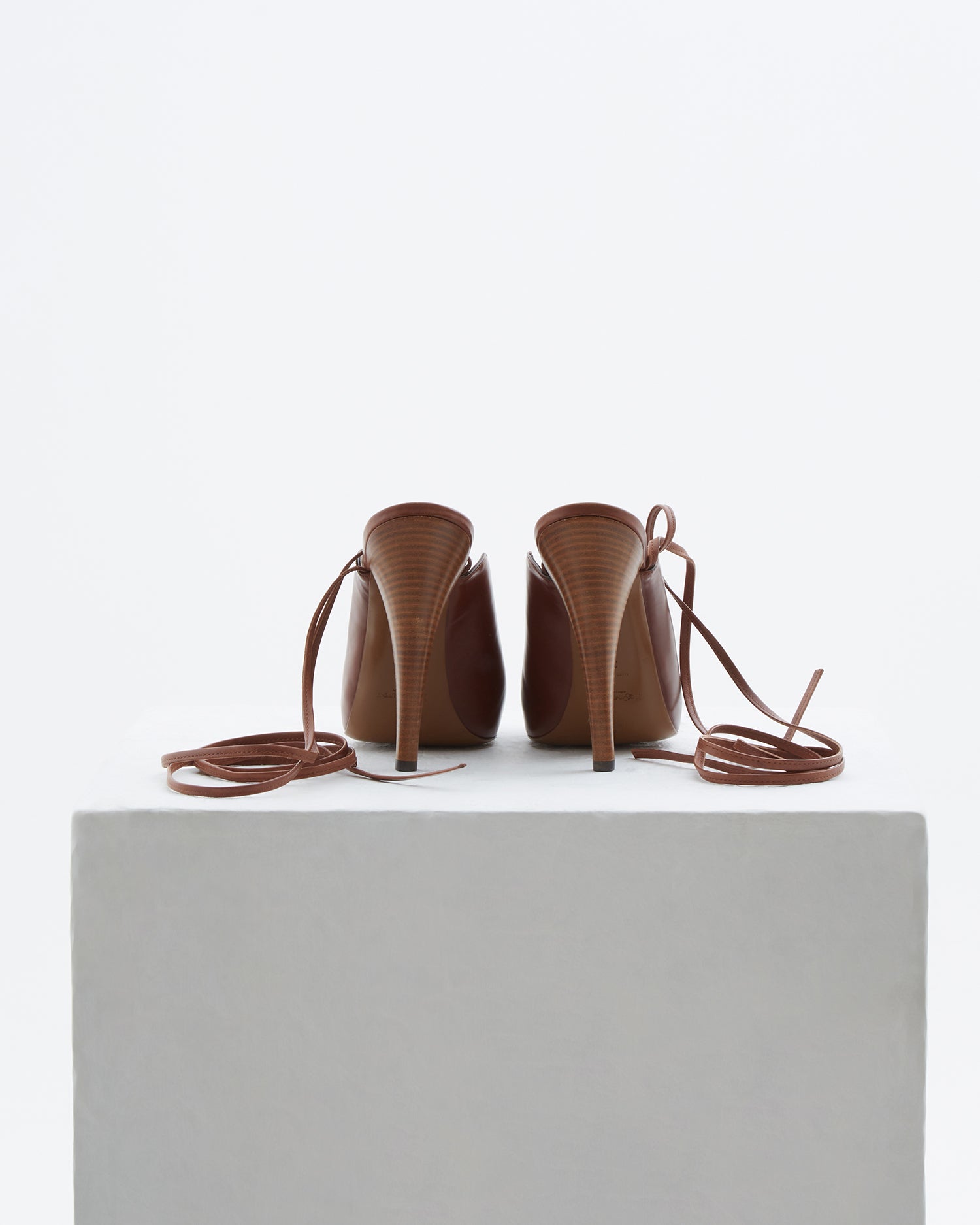 - Open back featuring a brown leather straps that wrap and climb the ankle