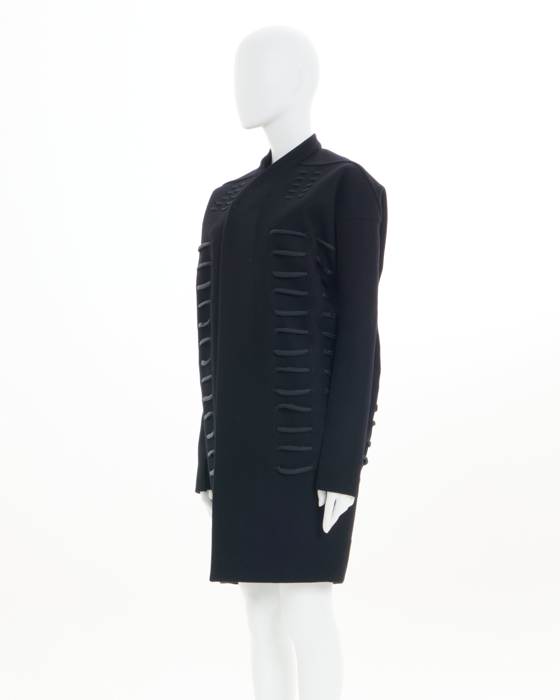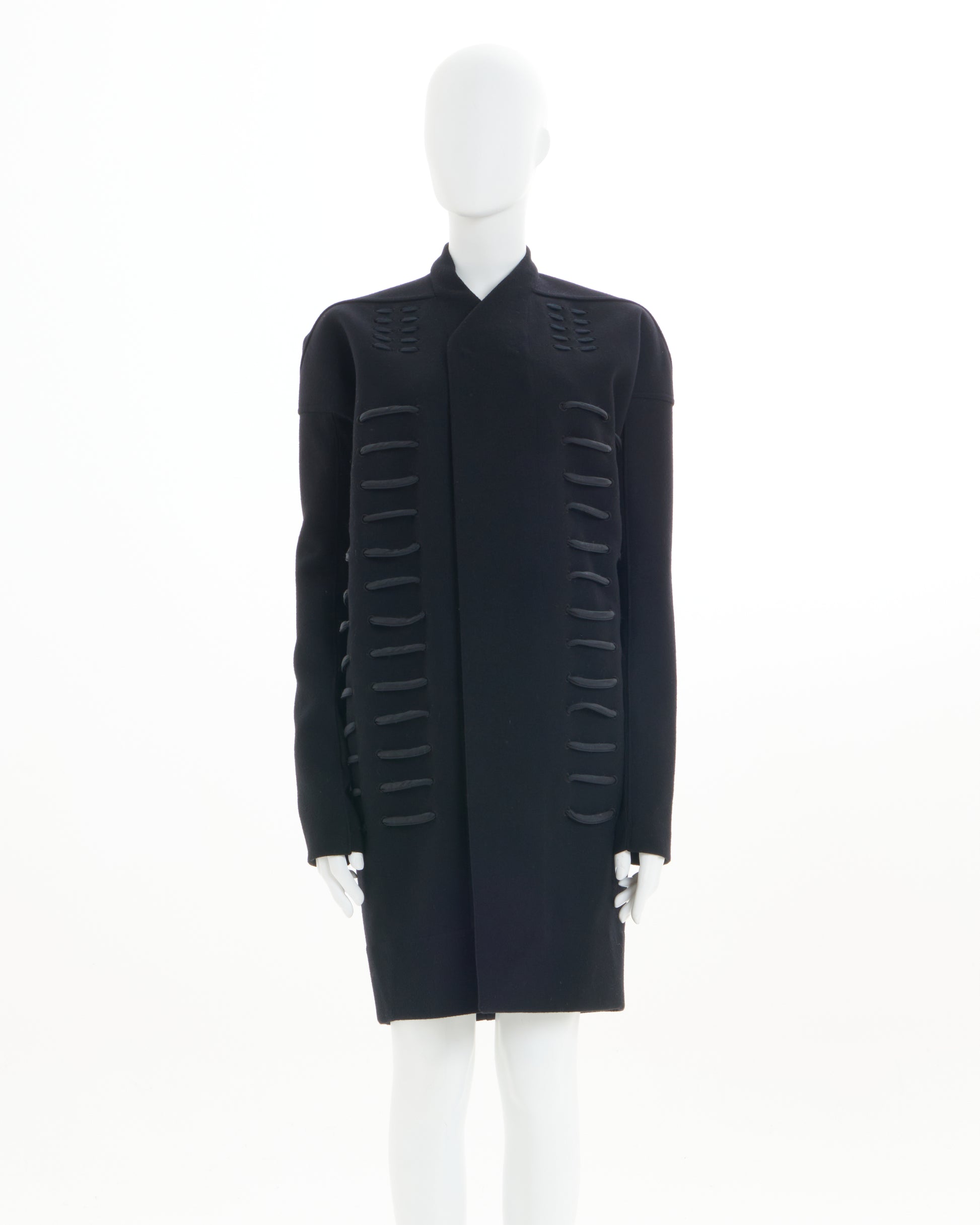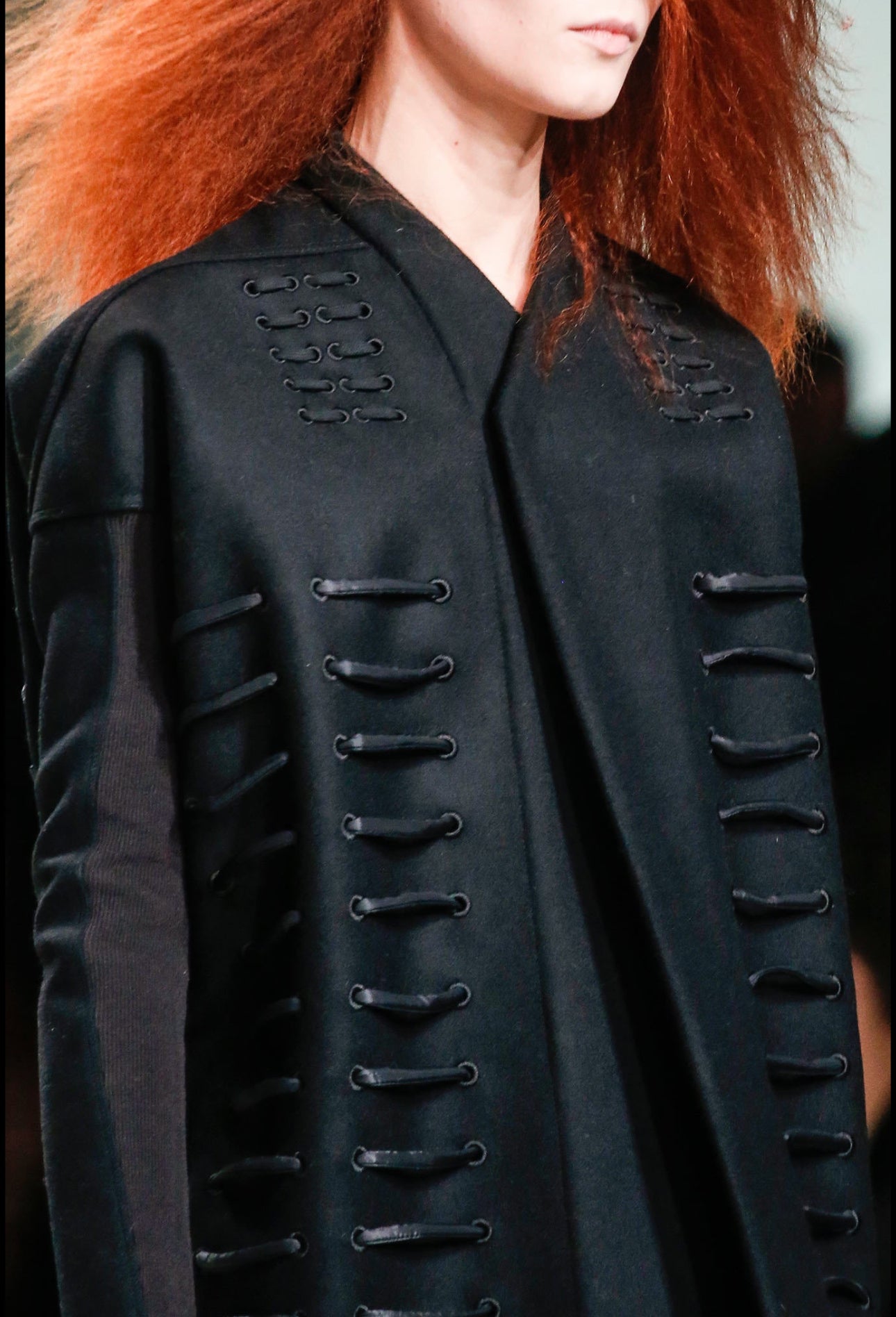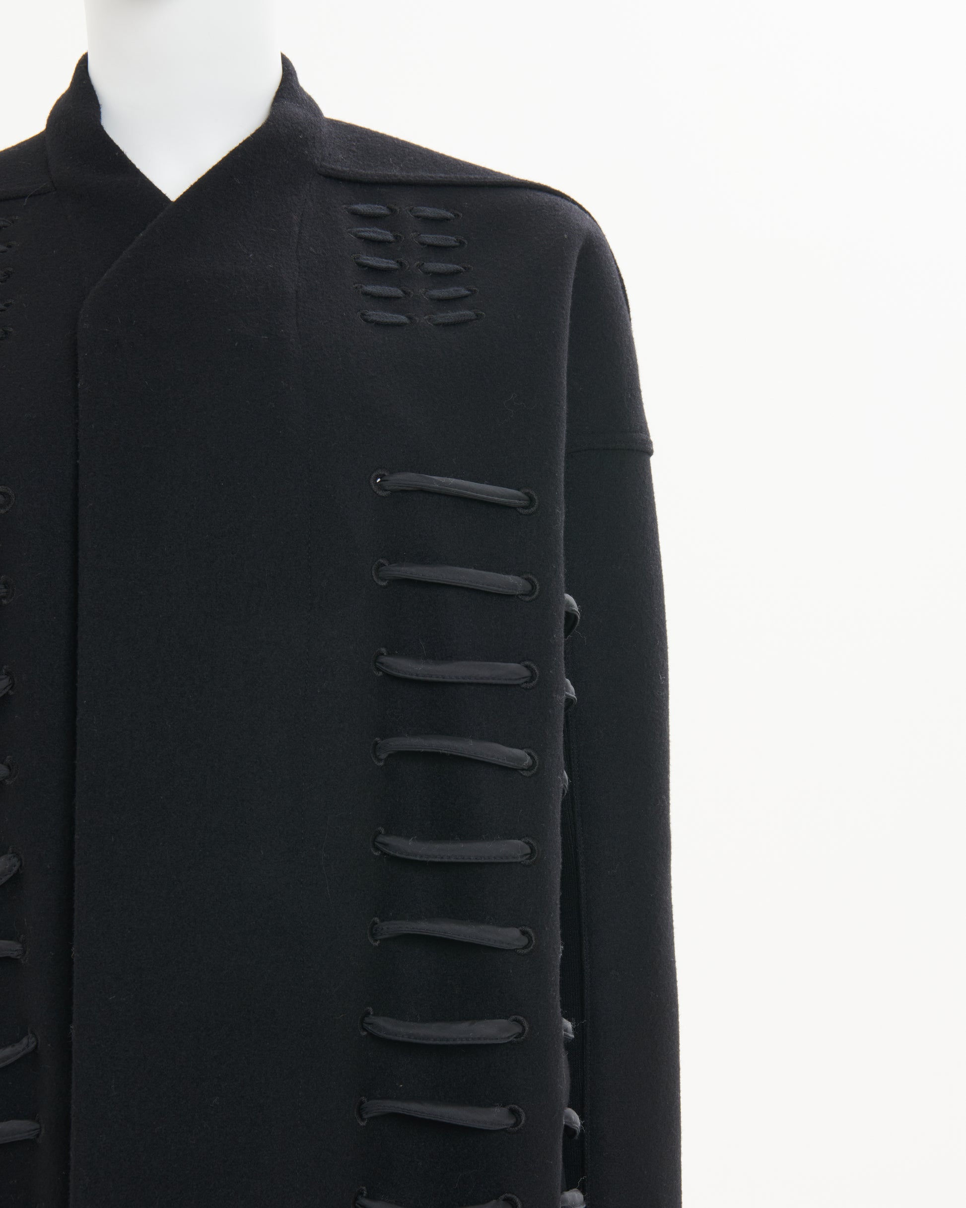 - Boxy, collarless coat with thick, crisscrossing cord laced through