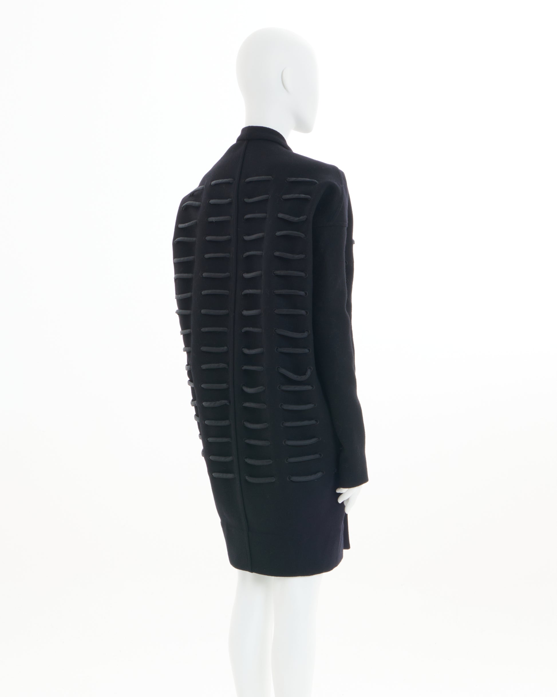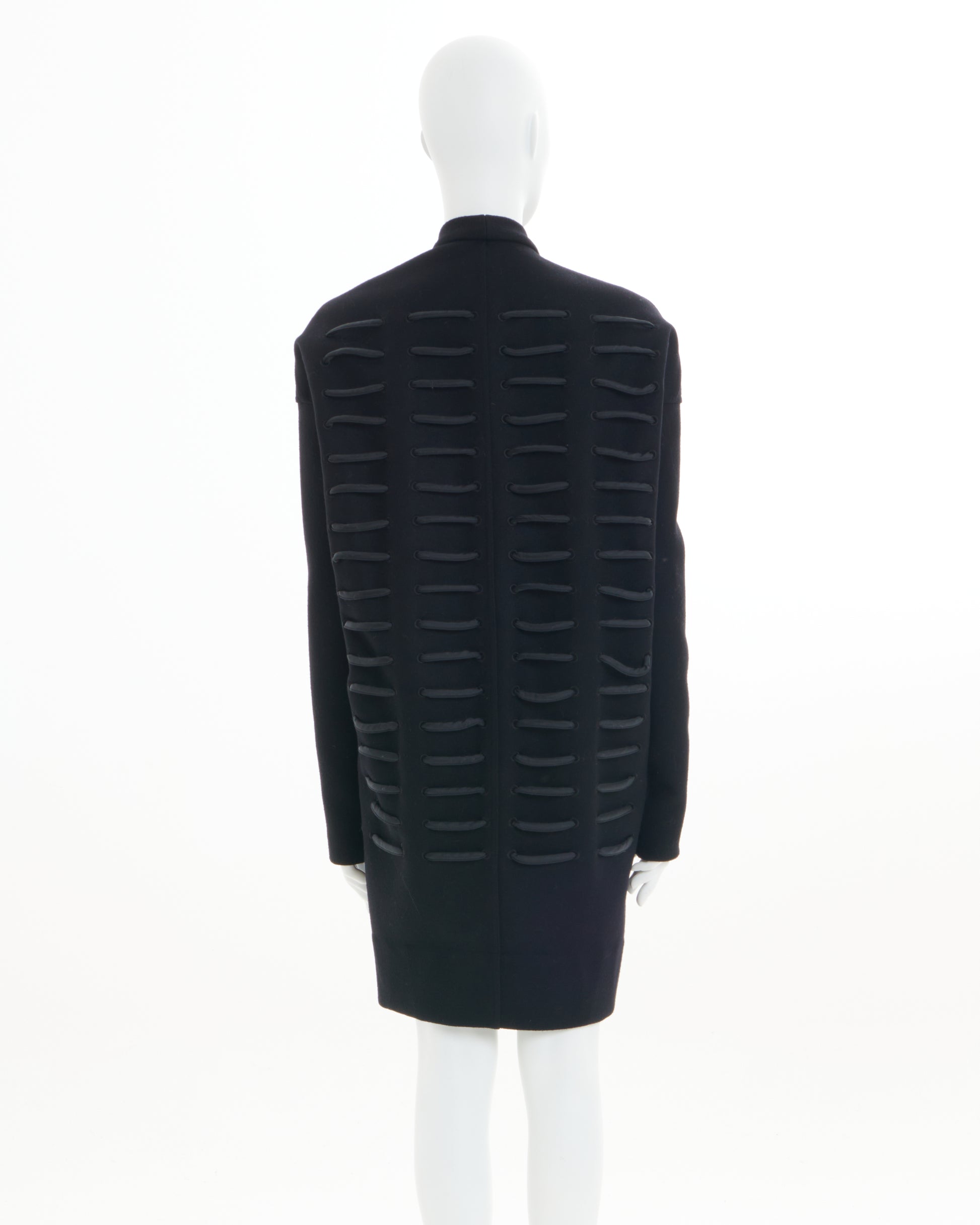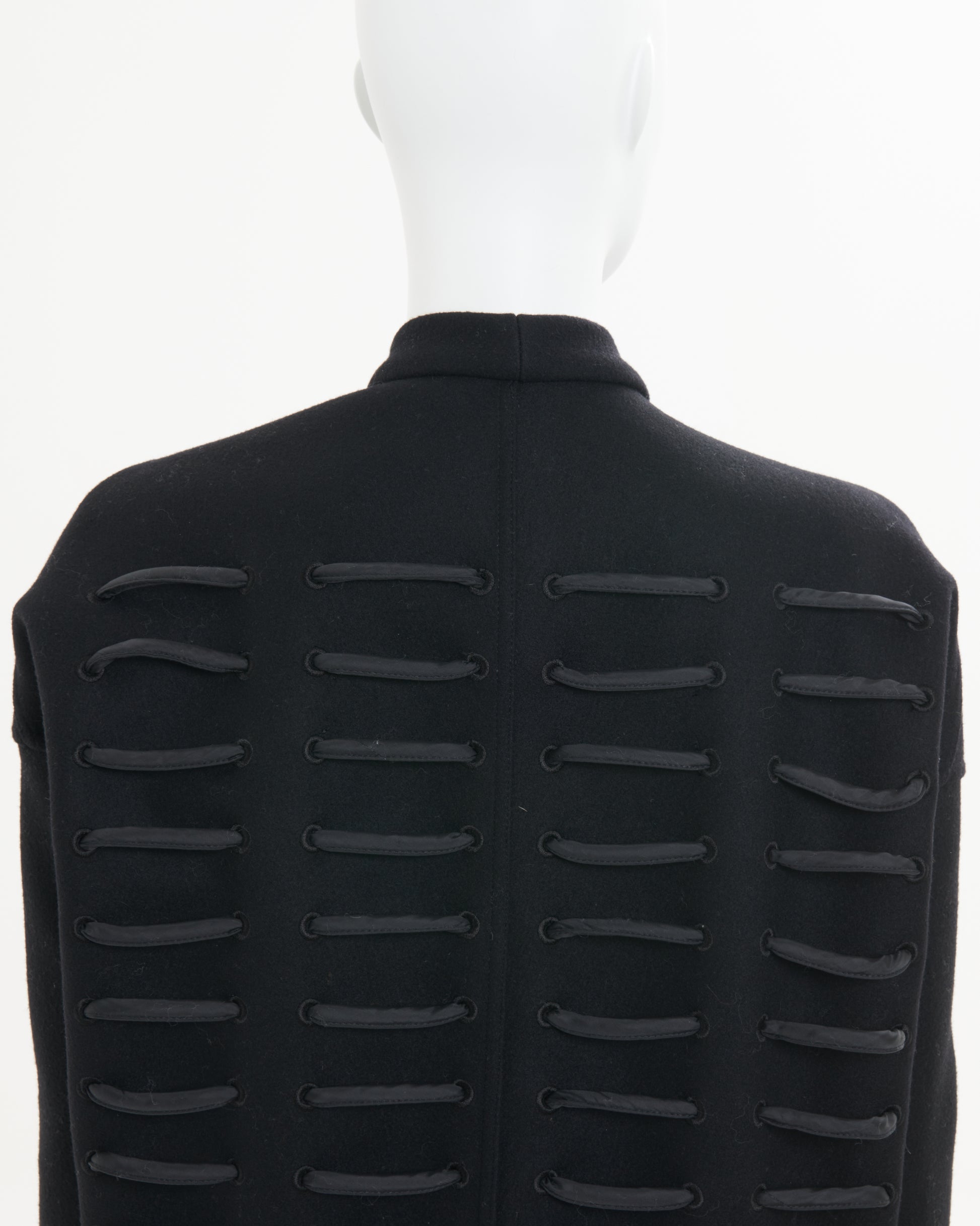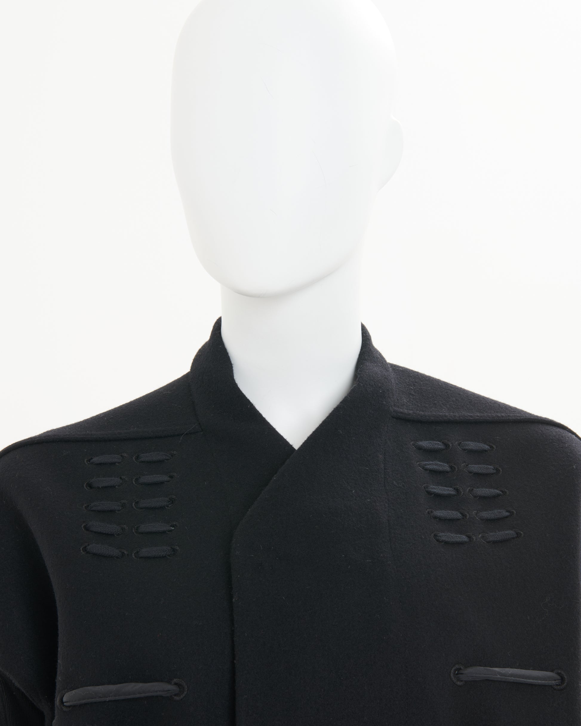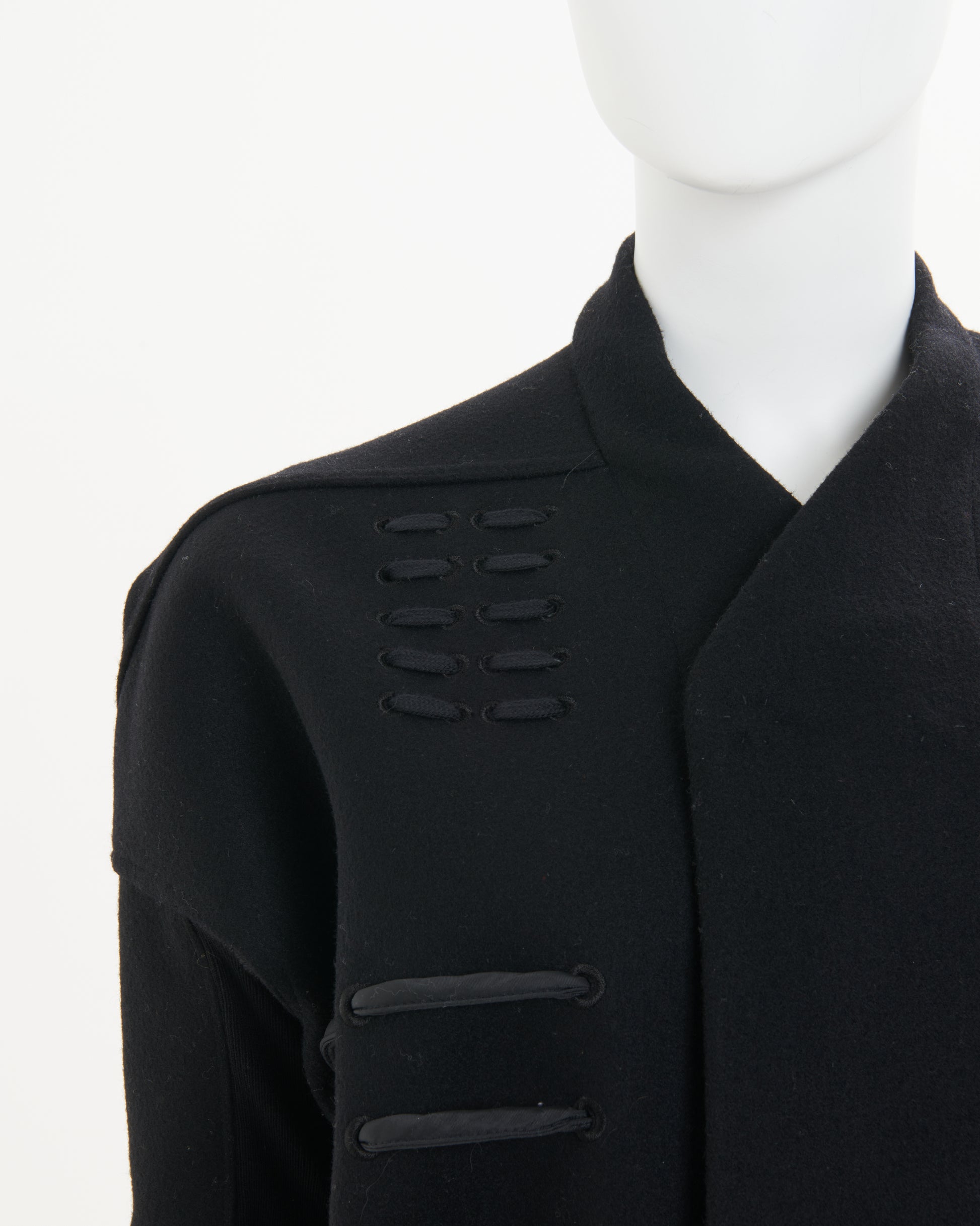 - Boxy, collarless coat with thick, crisscrossing cord laced through