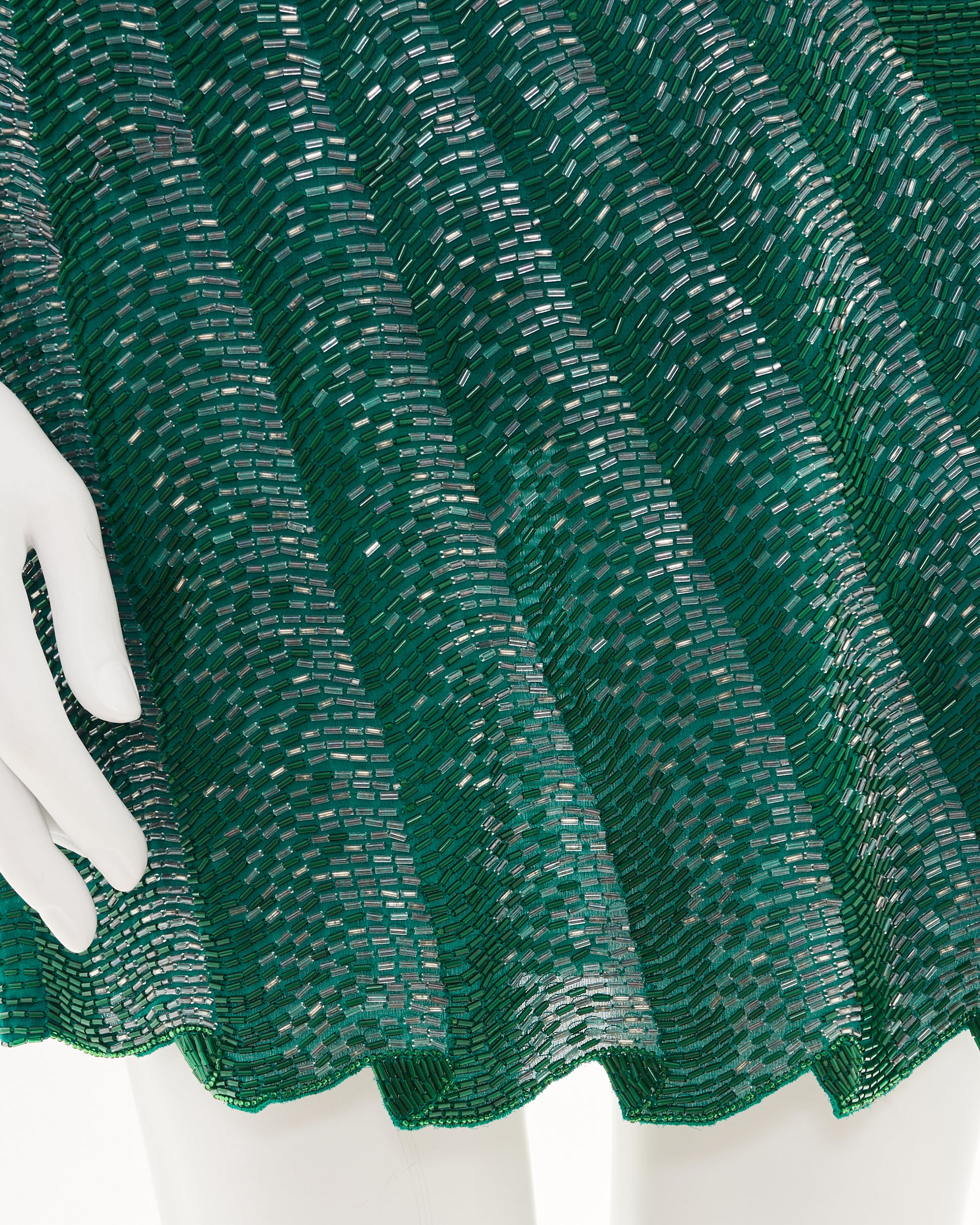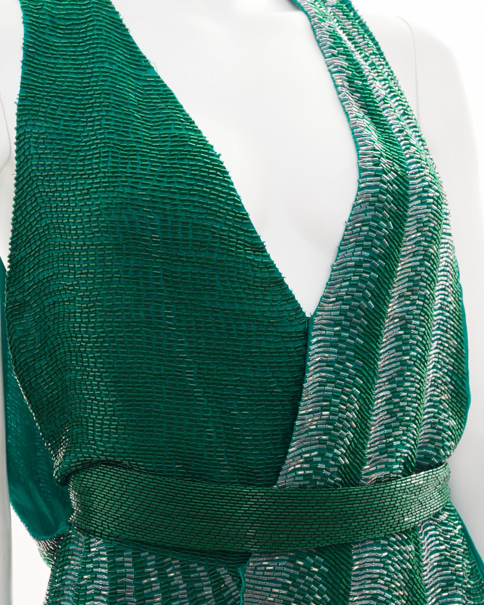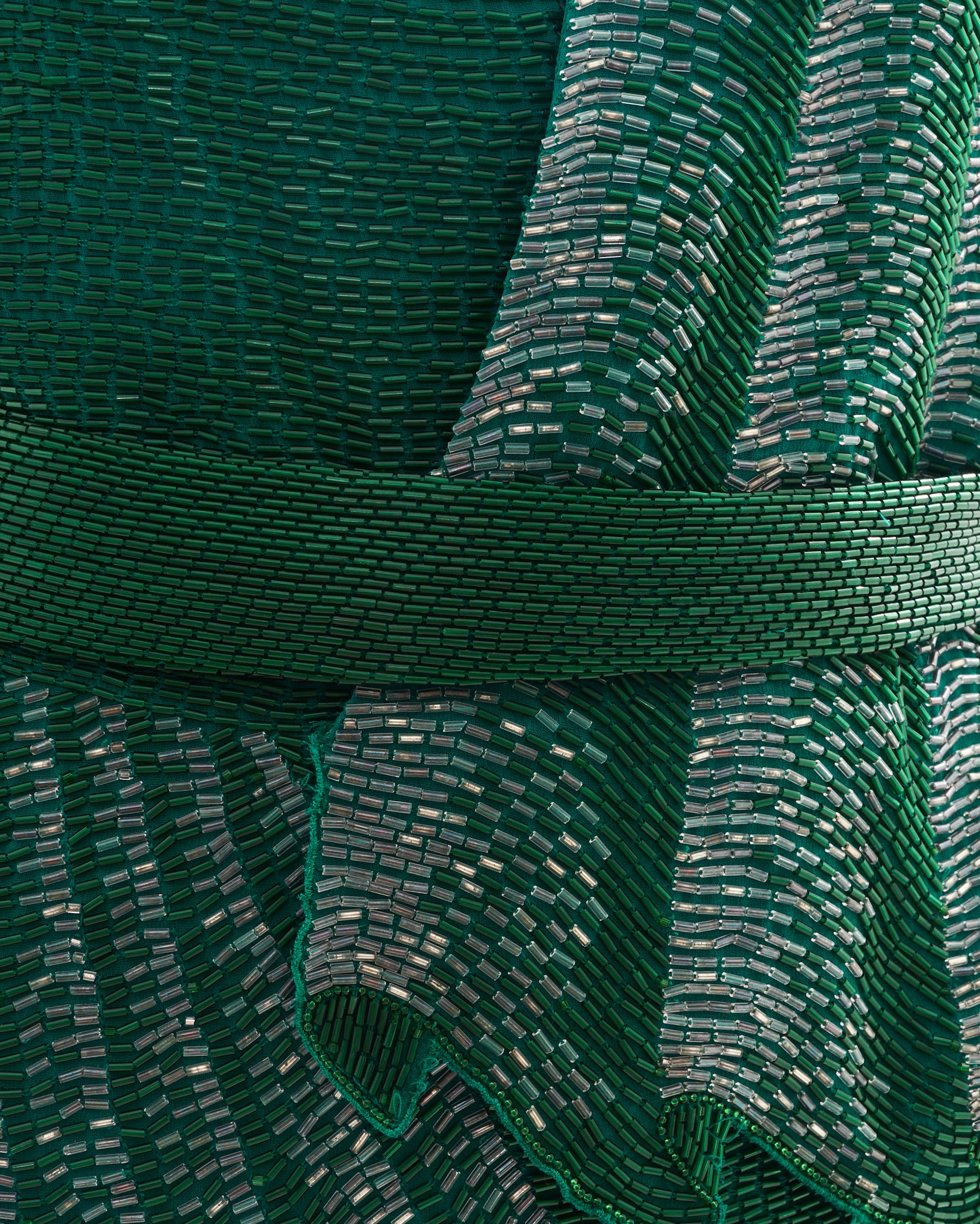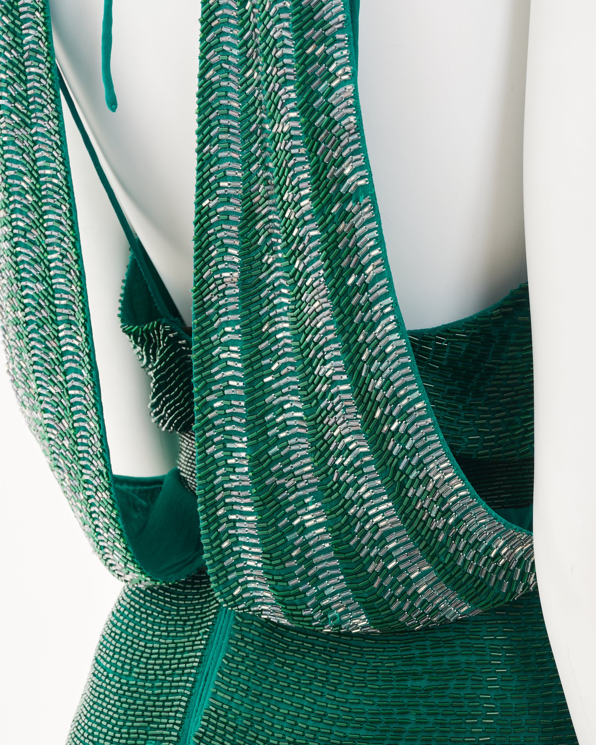 - Intricate green bead embellishments covering the entire dress, creating a shimmering effect
