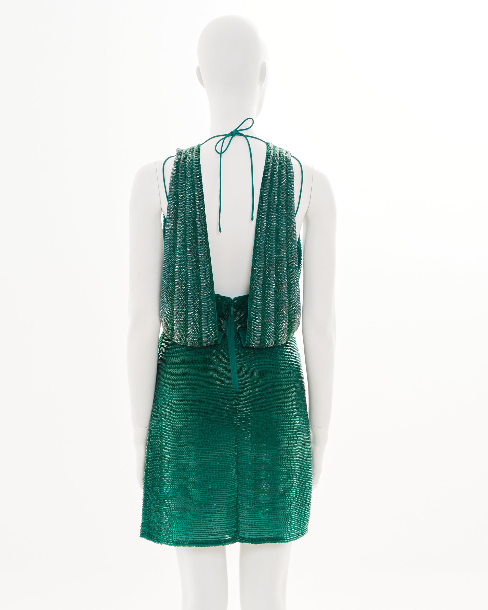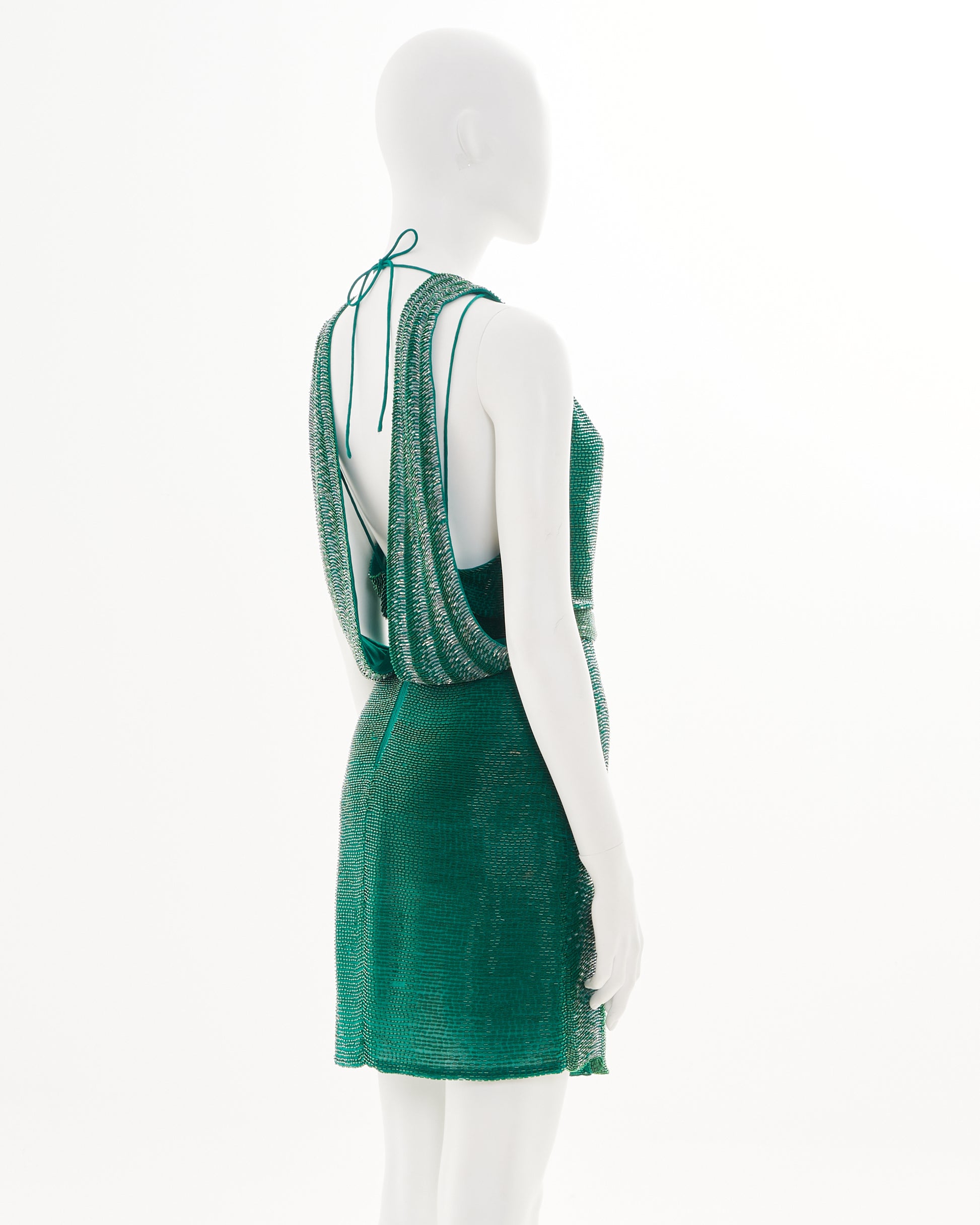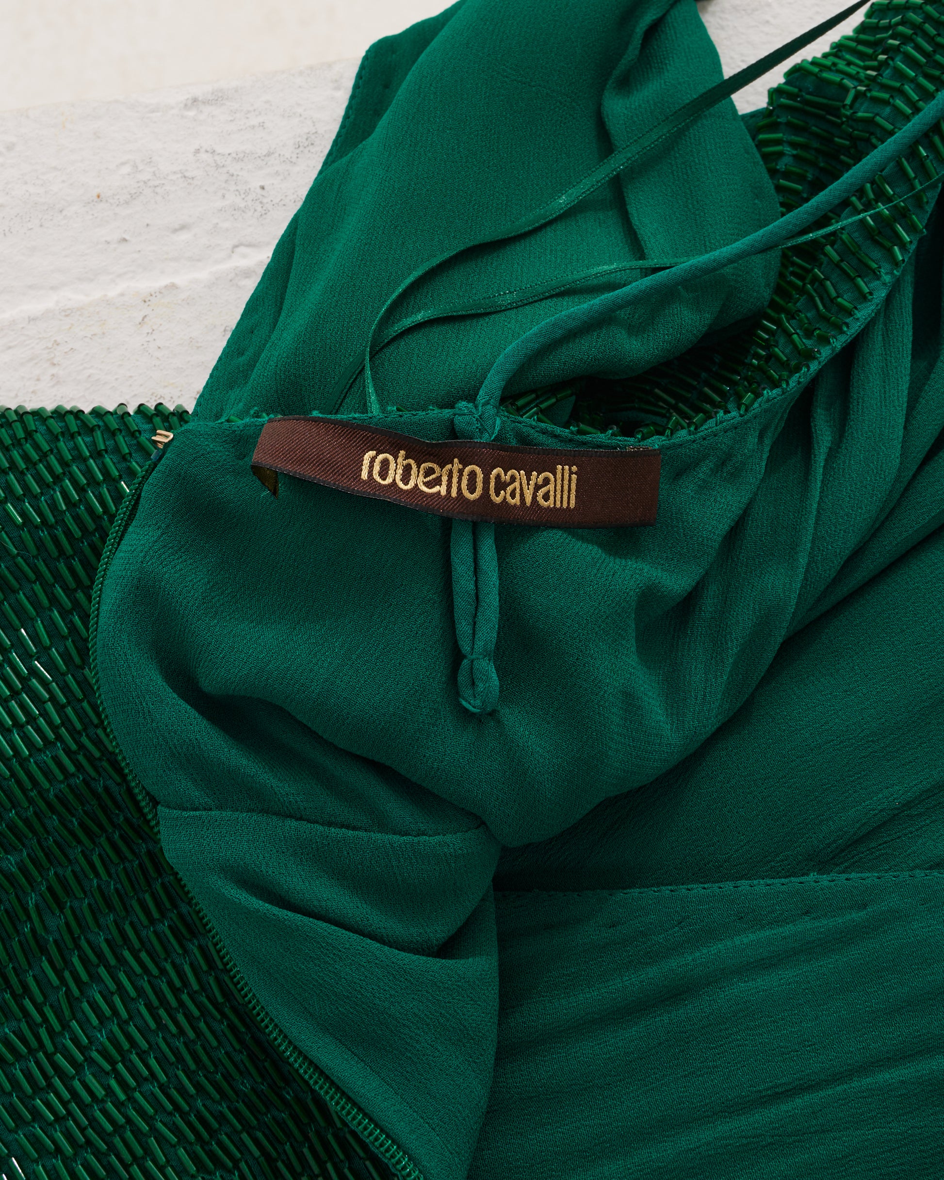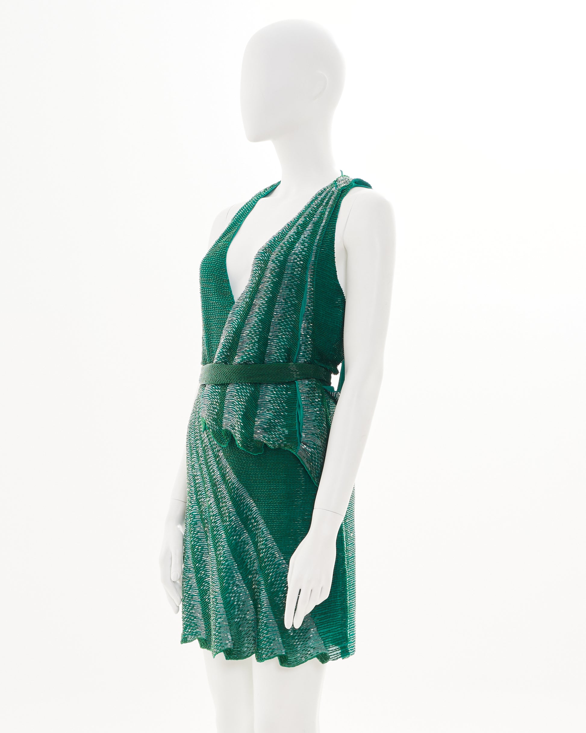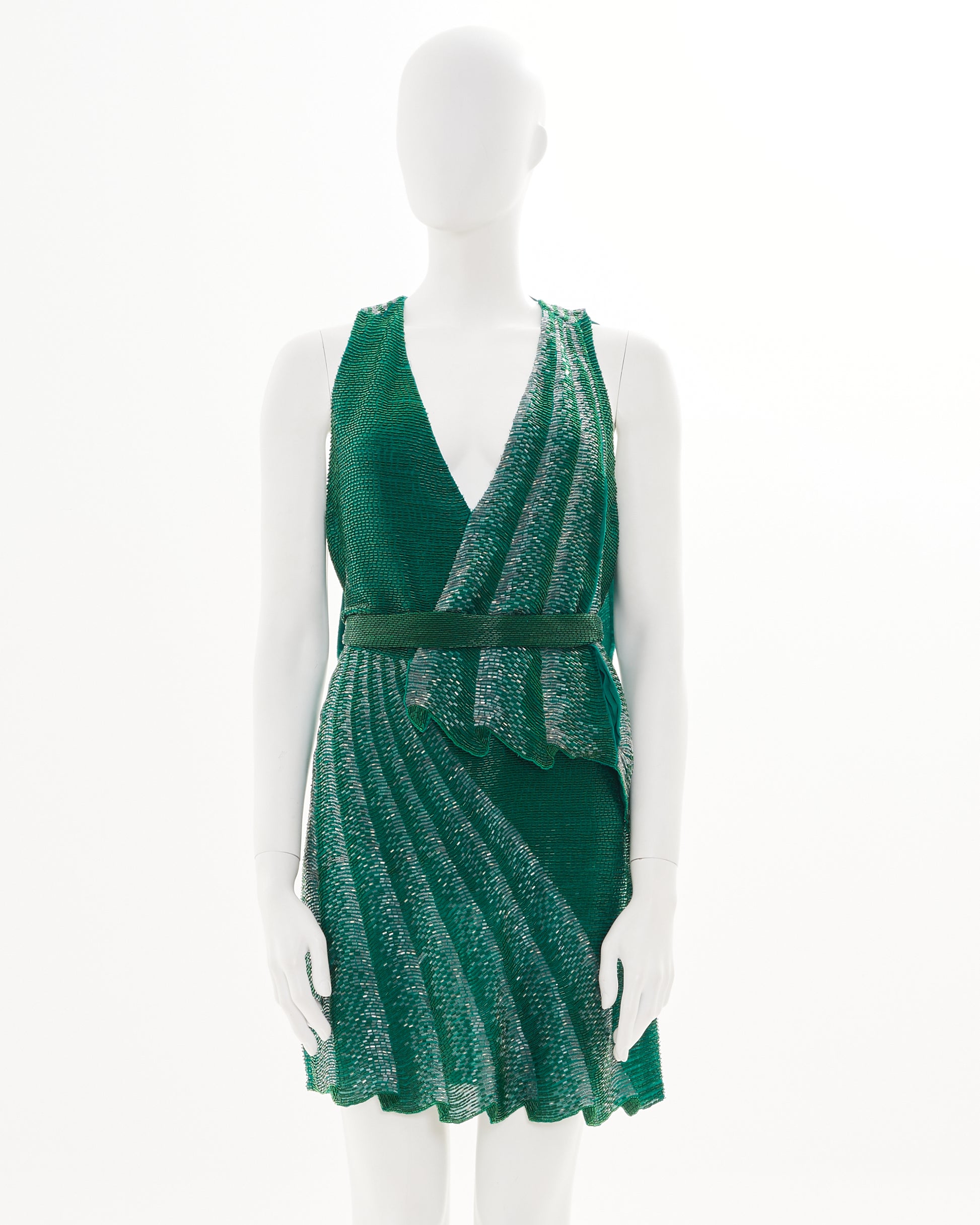 - Intricate green bead embellishments covering the entire dress, creating a shimmering effect