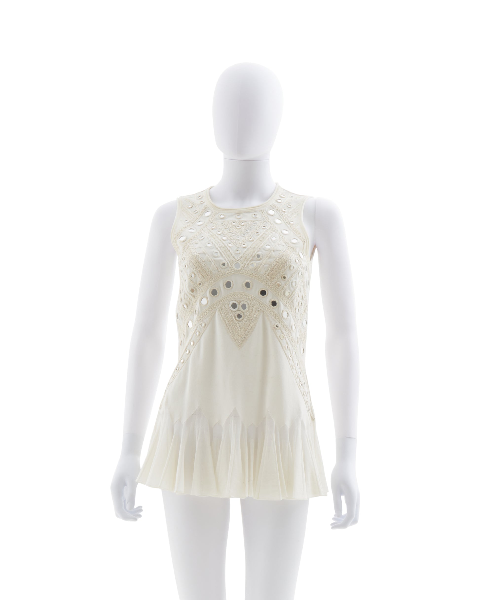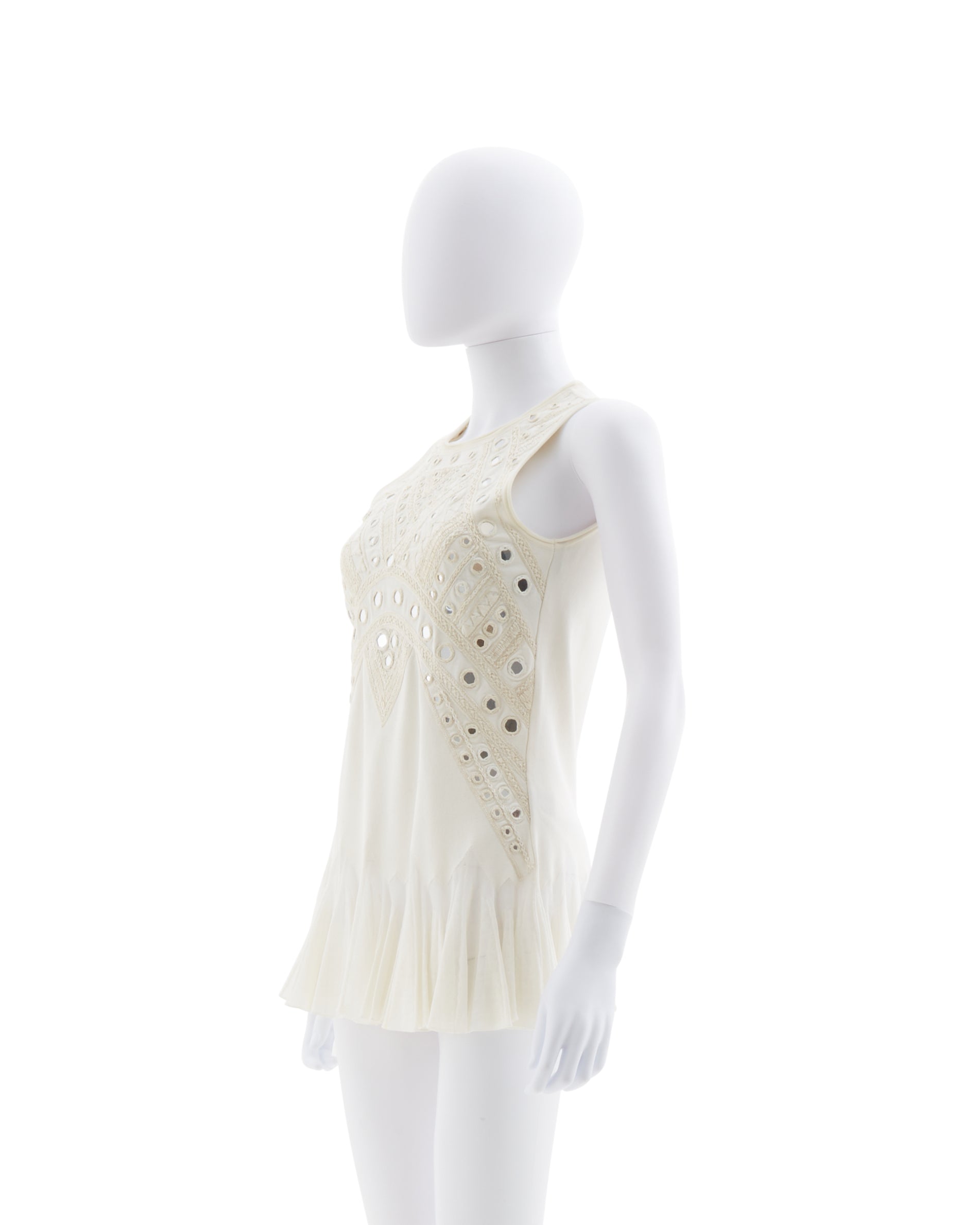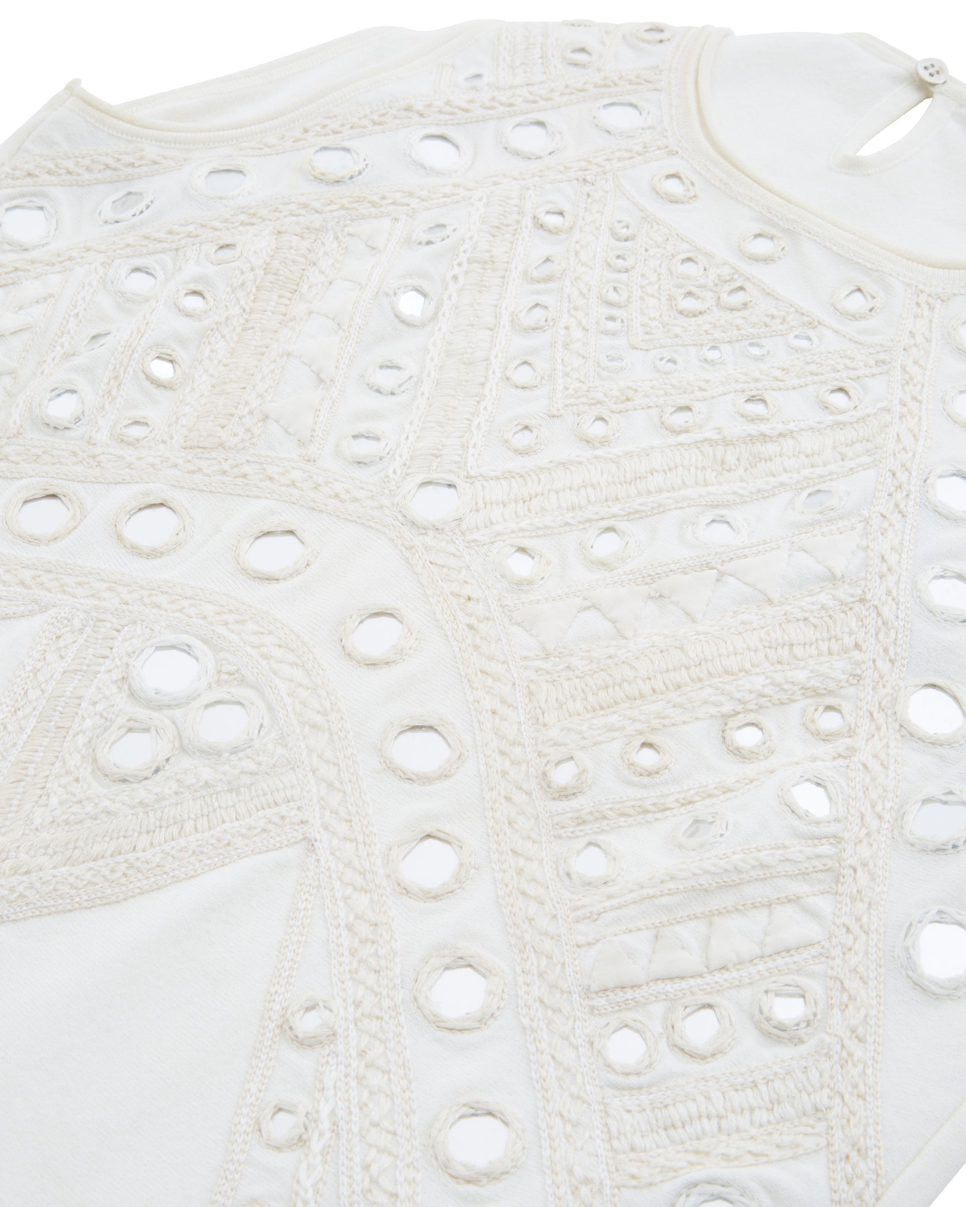 - The top features mini mirrors and embroideries with a flared bottom