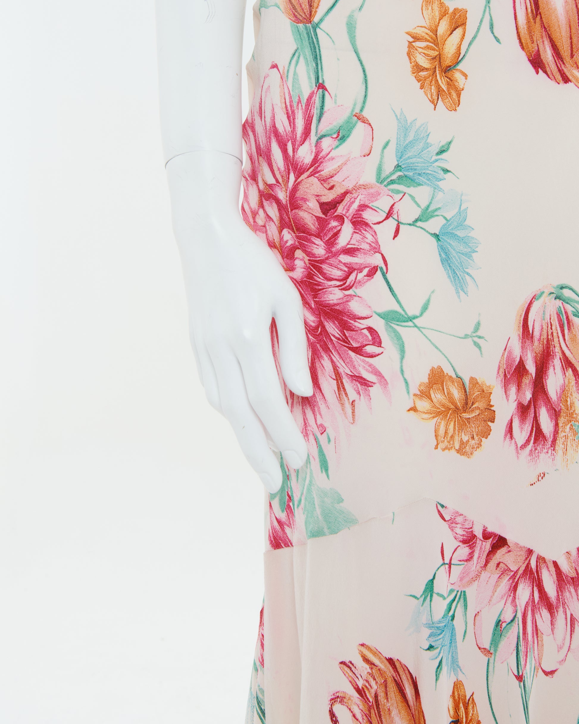 - Luxurious light silk and features a vibrant floral pattern with pink and orange flowers complemented by hints of green leaves