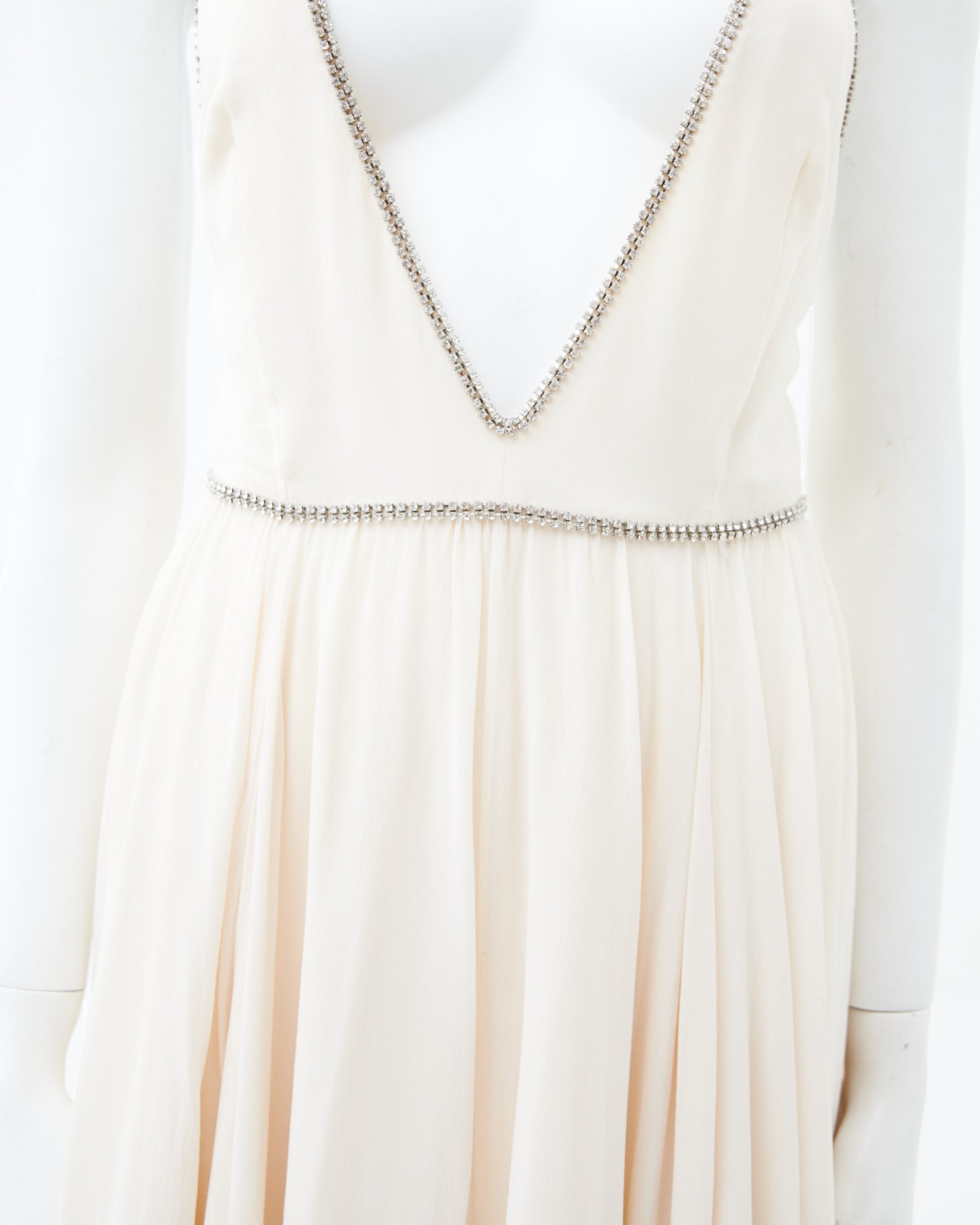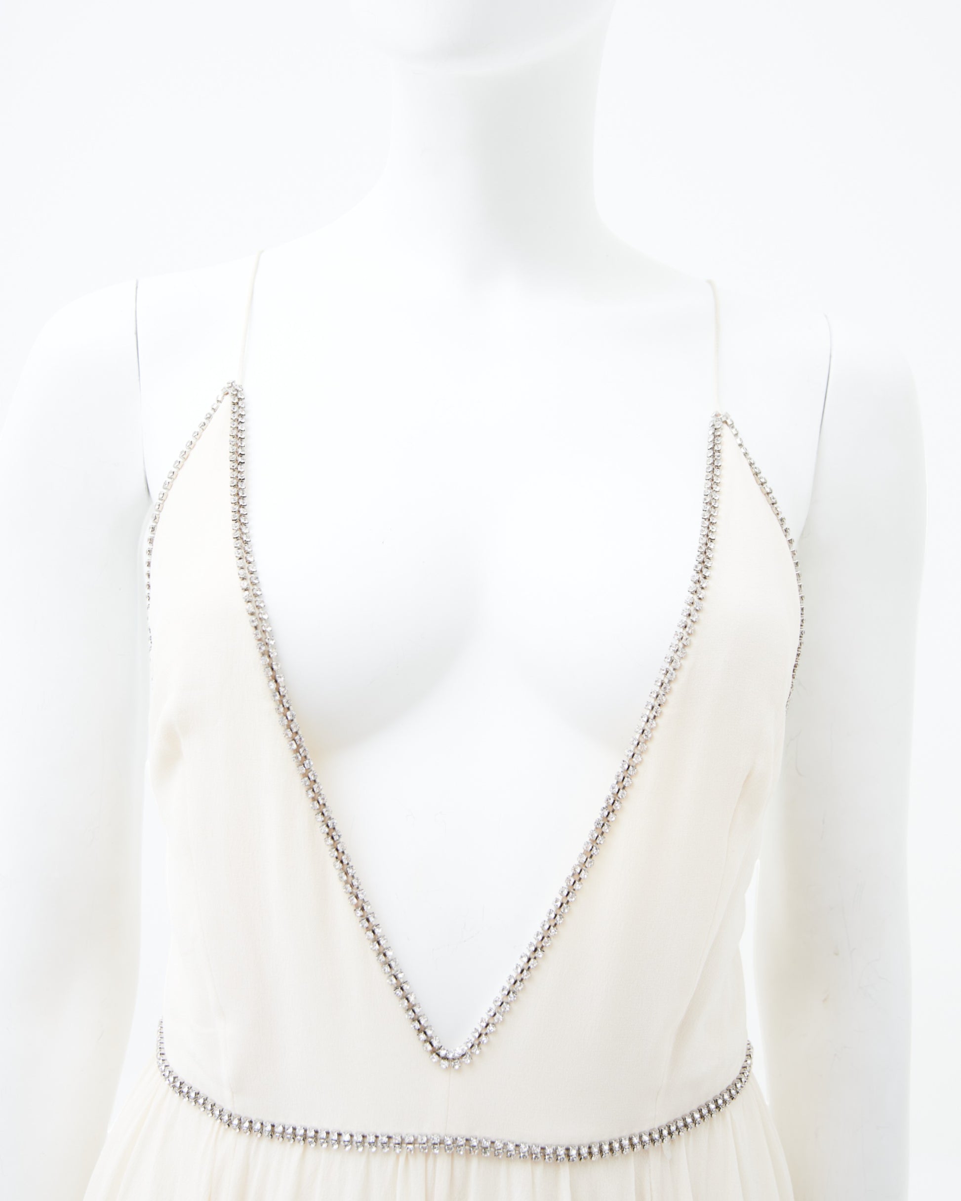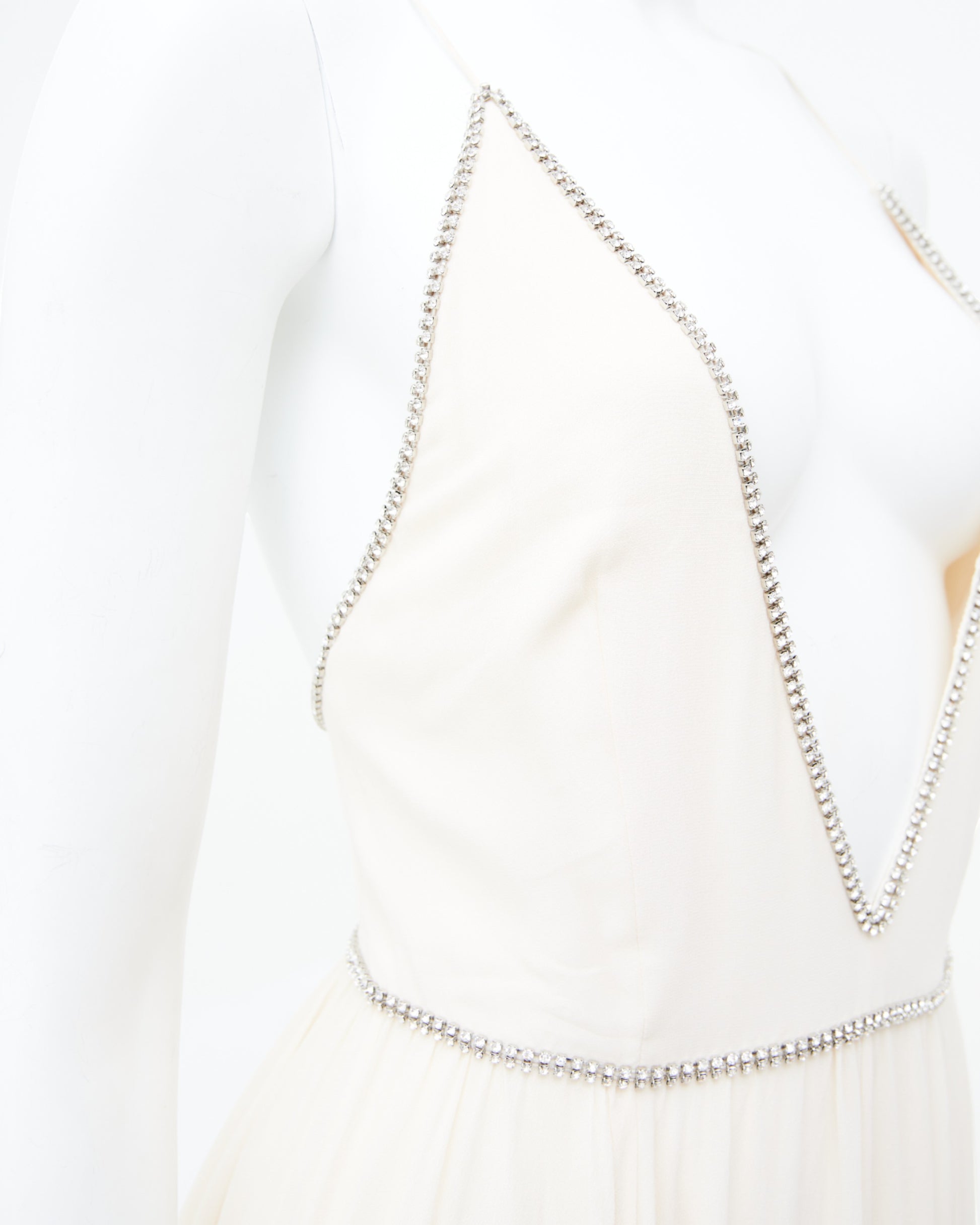 - Crystal embellishments outline both the plunging neckline and define the waistline