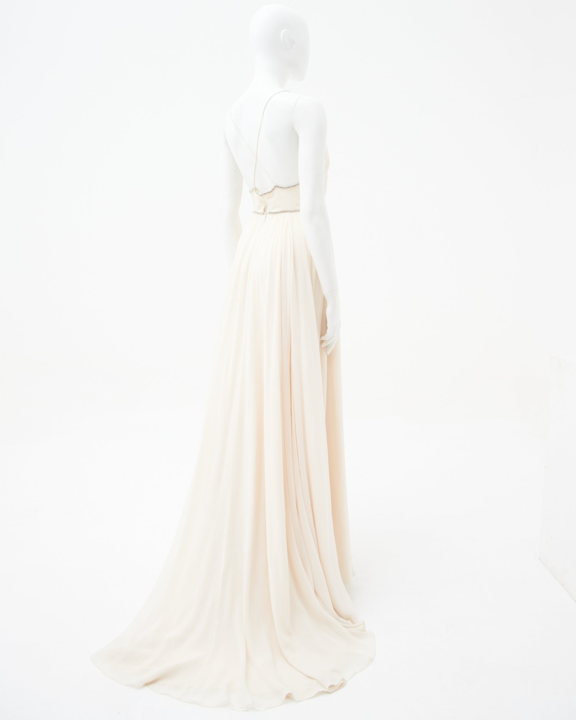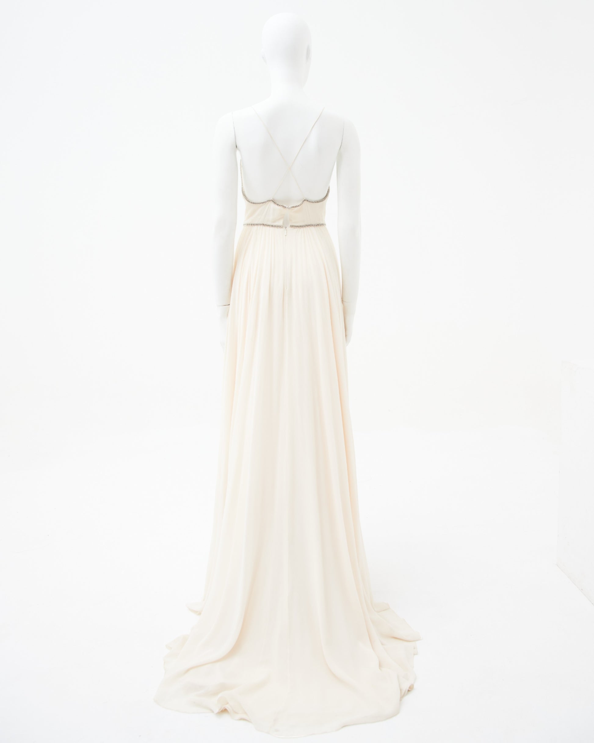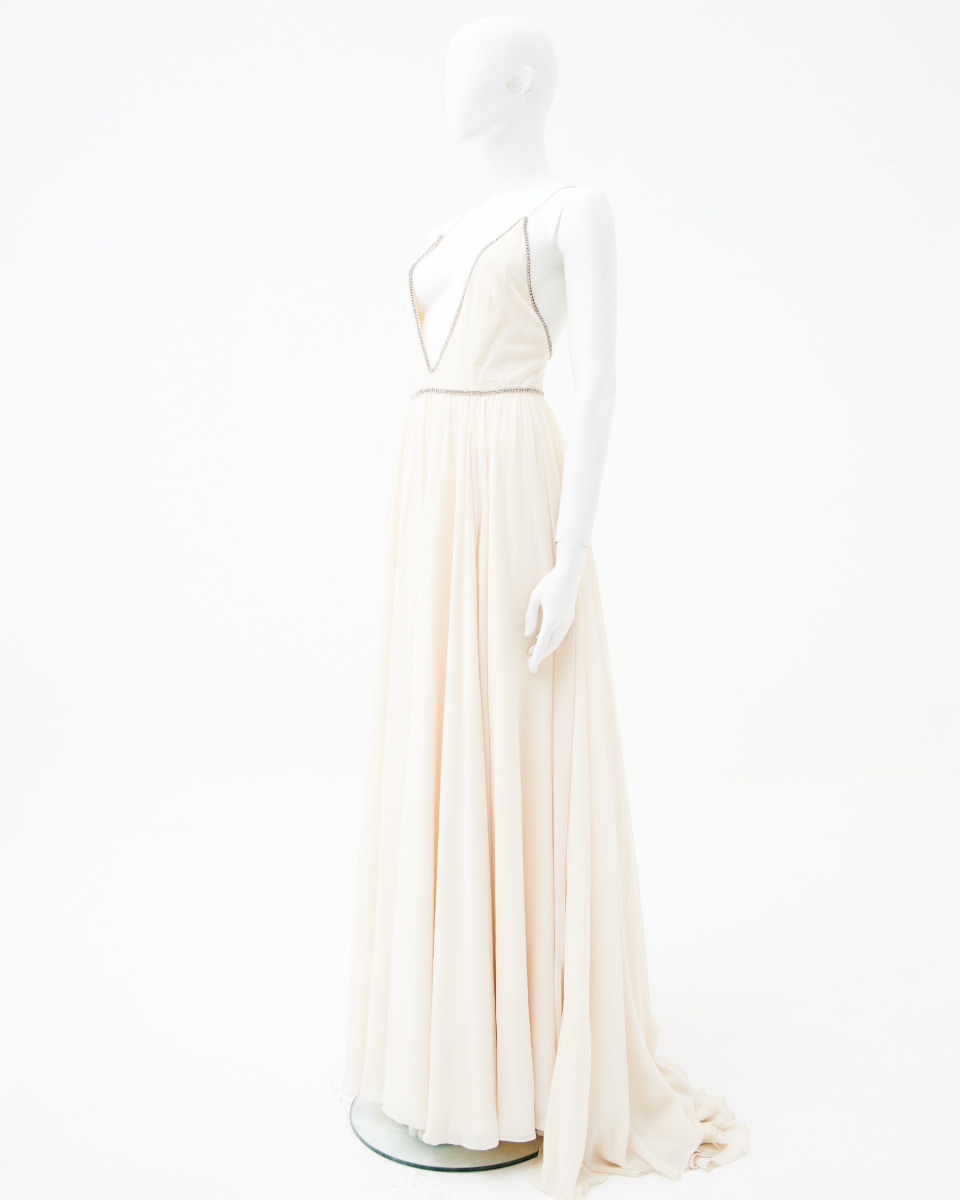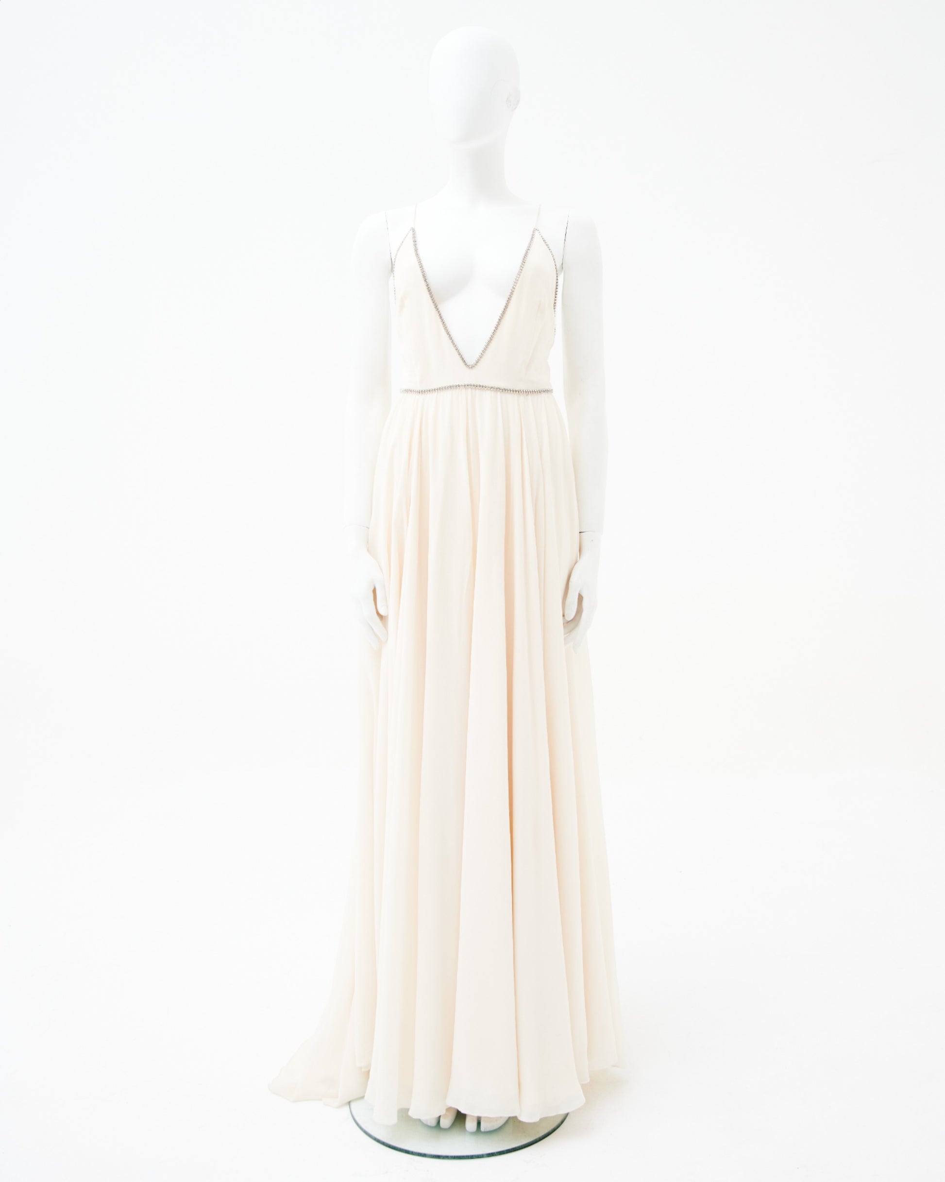 - Crystal embellishments outline both the plunging neckline and define the waistline